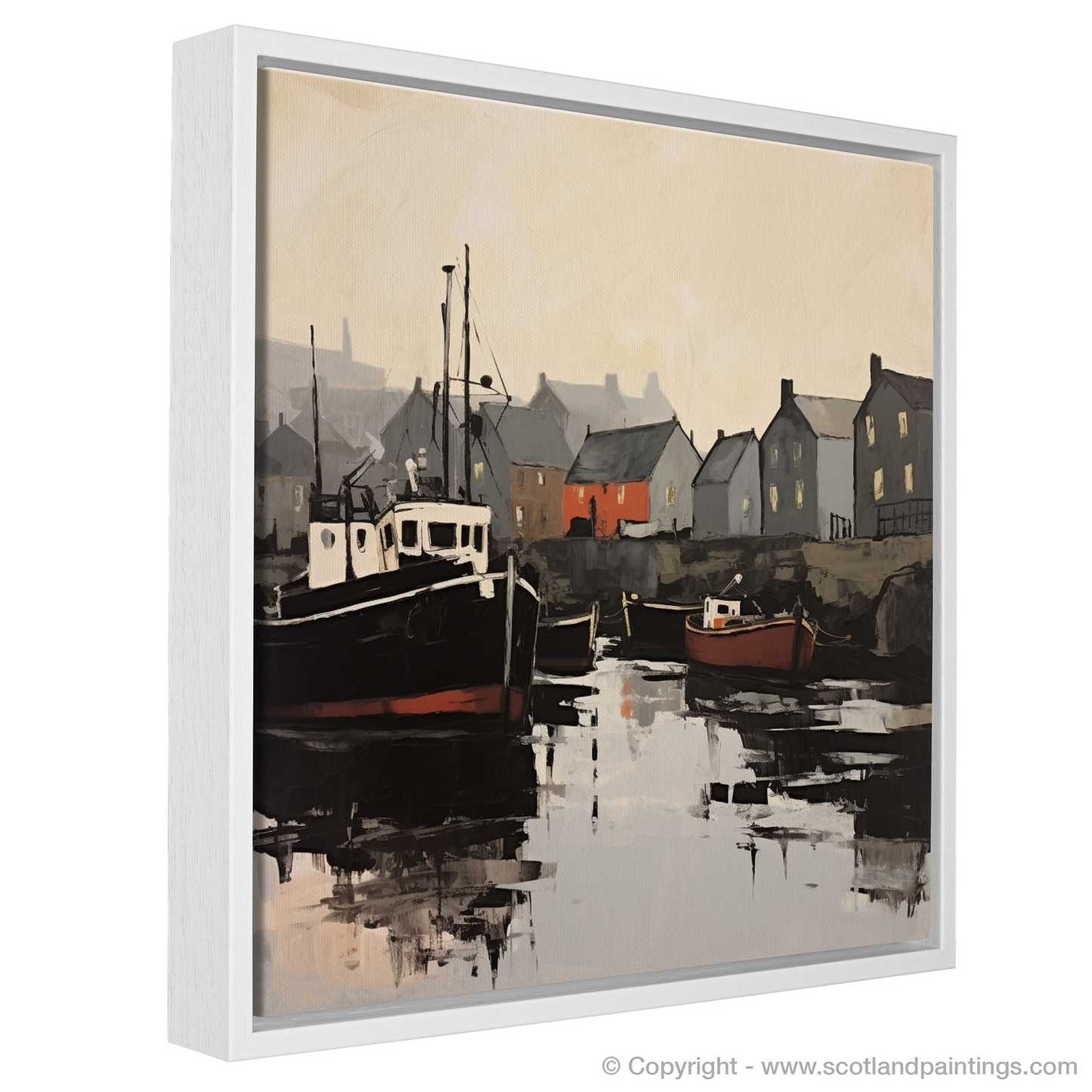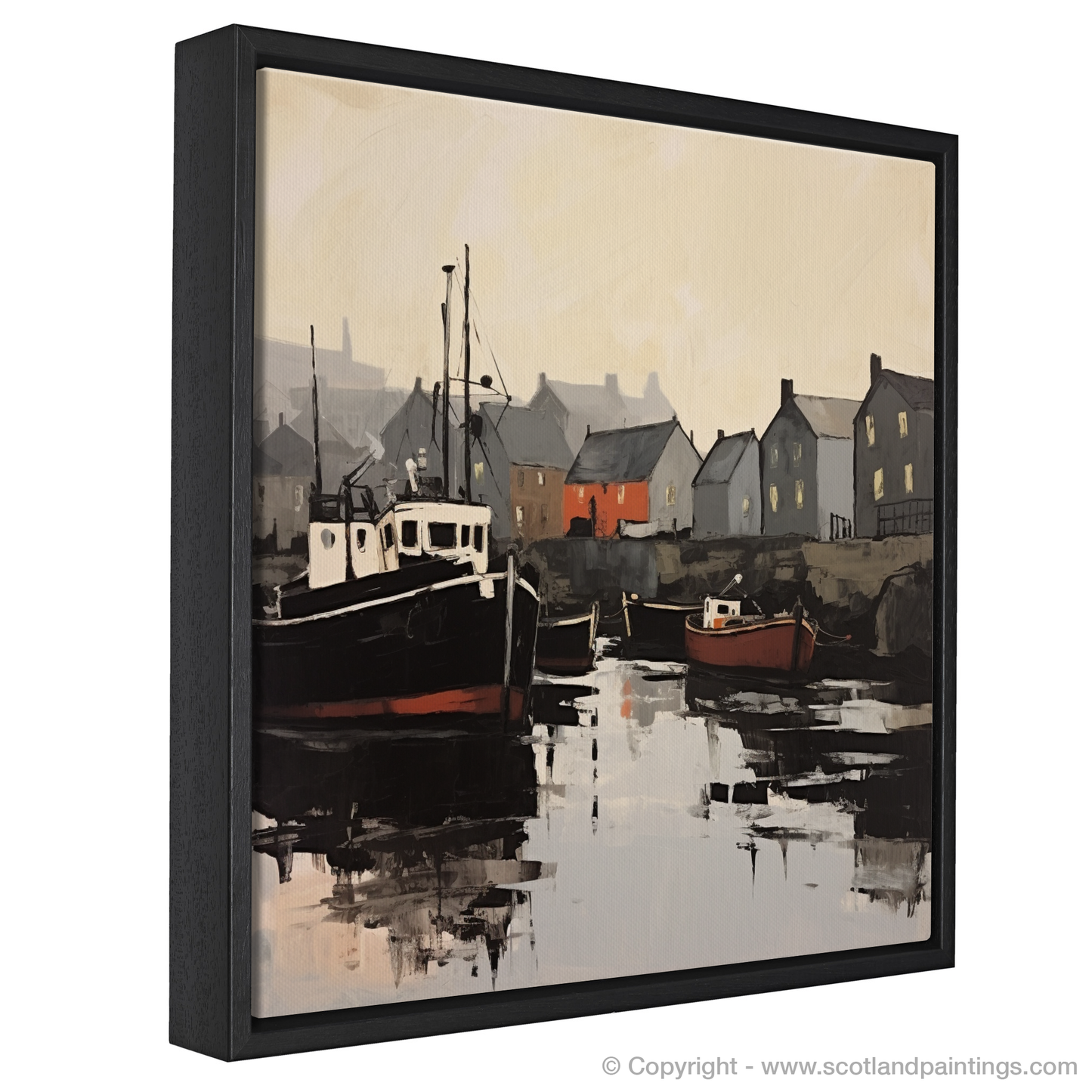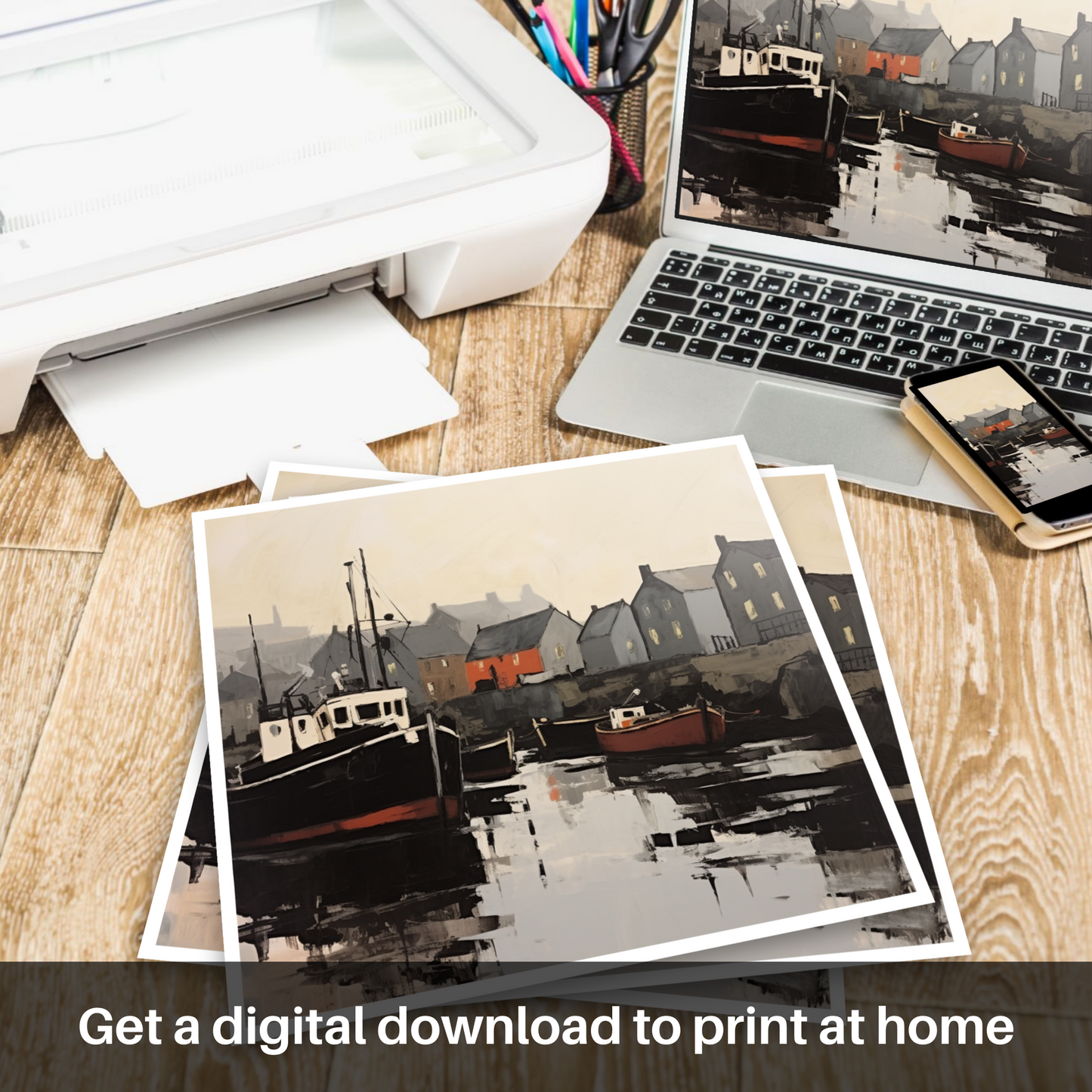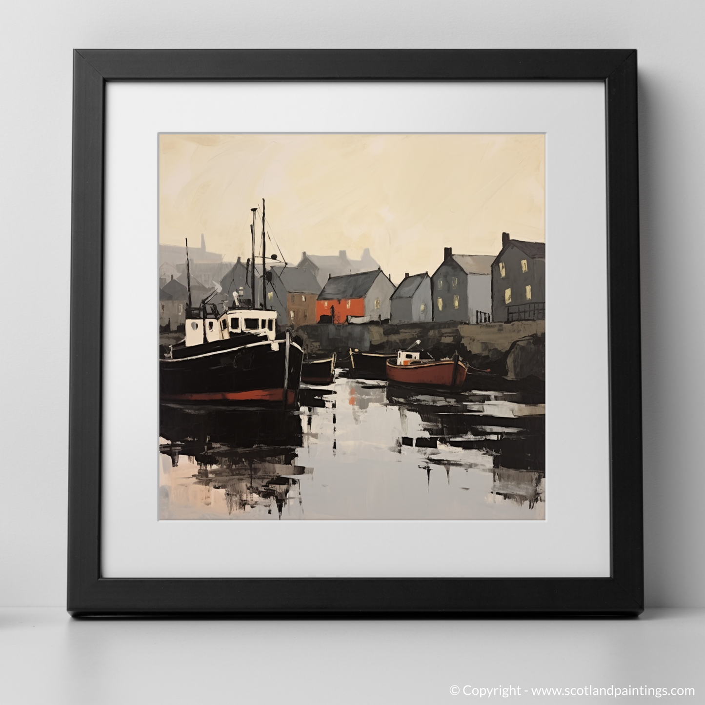 Capturing the distinct maritime essence of Stornoway Harbour, this evocative print transports viewers to the soulful heart of Scotland's coastal scenery. Stark contrasts of dark, moody boats against the muted backdrop of the harbour create a striking focal point, their reflections rippling gently in the calm, glassy waters. The harbour scene unfolds with a vibrant splash of orange from a distant building, instilling a lively burst of warmth into the serene atmosphere.