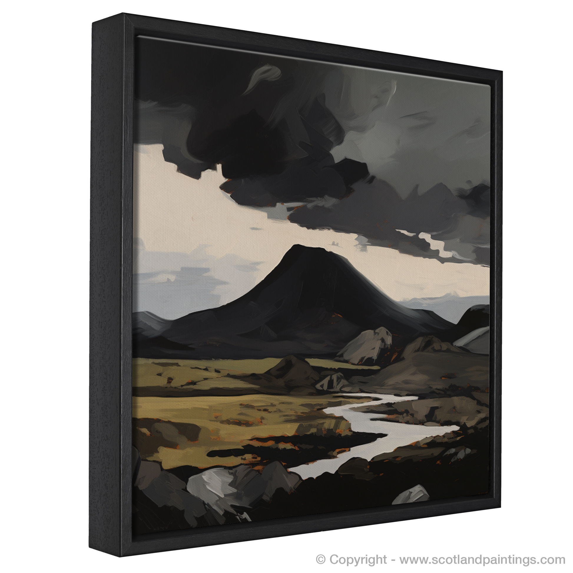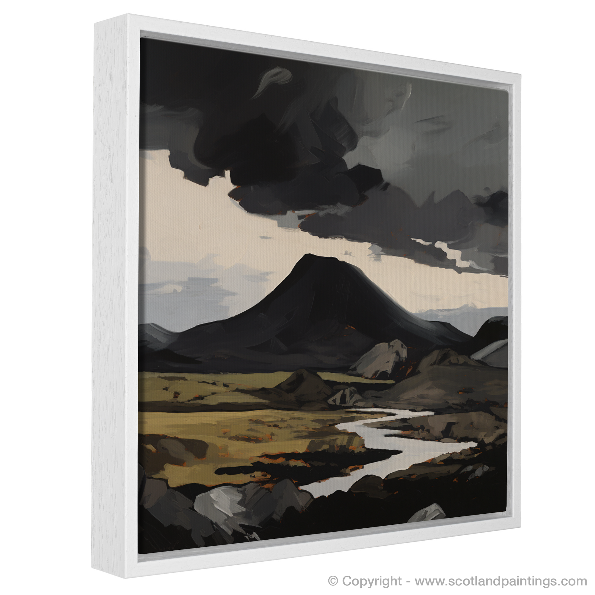 Capture the untamed essence of Scotland's rugged terrain with this evocative expressionist piece inspired by Càrn an Tuirc. This print, part of our esteemed 'Scottish Munros' collection, dramatically portrays the majestic solitude of one of Scotland's famed Munros. Bold brushstrokes in a stark palette convey the raw beauty of the landscape, with a powerful contrast between the dark, brooding sky and the vibrant strokes of gold and amber that suggest a wild landscape touched by the setting sun. The central Munro is rendered with an imposing presence, its iconic peak standing resilient against the elements. Artful distortion and abstraction invite the viewer's eye to wander over the craggy hillocks and serene waterways that carve through the foreground, while distant silhouettes hint at the vastness of the surrounding highlands. This stirring print is a testament to the enduring allure of Scotland's natural grandeur, sure to ignite the imagination and bring a touch of the sublime to any space it inhabits.