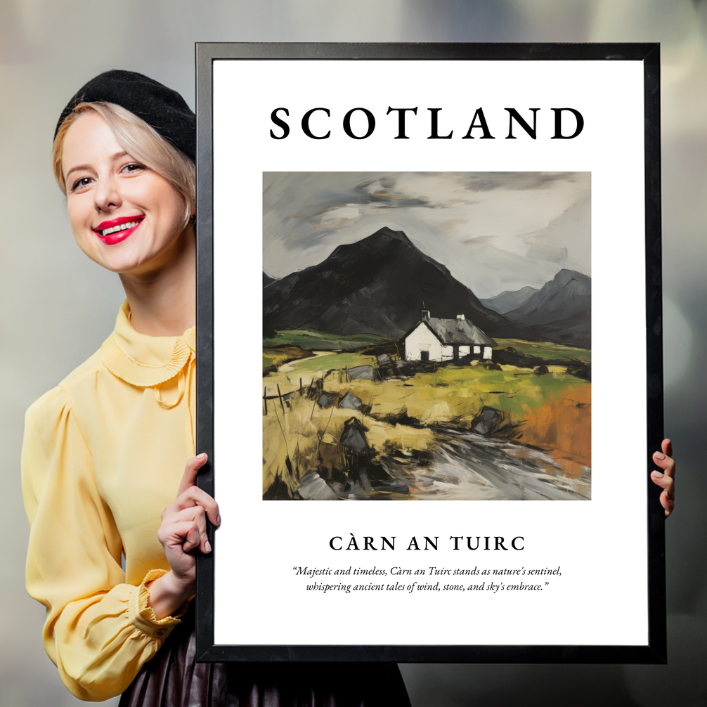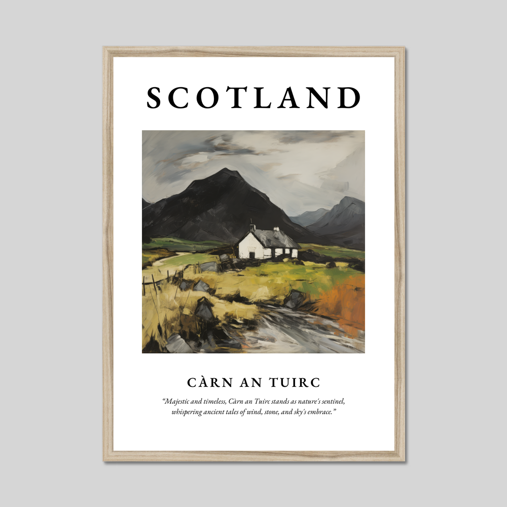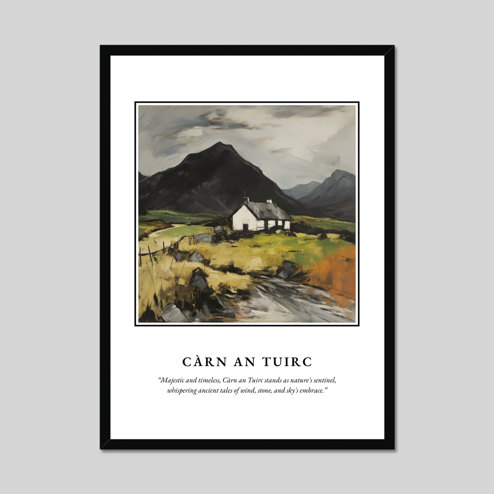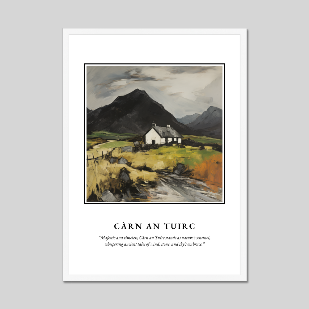Below the painting, a thoughtful inscription reads: “Majestic and timeless, Càrn an Tuirc stands as nature's sentinel, whispering ancient tales of wind, stone, and sky's embrace.” This quote perfectly encapsulates the painting's essence, appealing to art lovers and those with a fondness for the emotive Expressionism style. This framed print is not only a tribute to the natural wonder it portrays but also to anyone who cherishes the beauty of Scotland, whether they’ve visited the Highlands or dream of doing so.