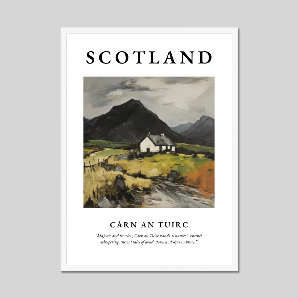 Embrace the captivating allure of the Scottish Highlands with this striking framed poster print, featuring the majestic Càrn an Tuirc. Measuring an impressive 50cm x 70cm, this poster makes an affordable yet impactful statement piece in any space, infusing it with the mystique of Scotland’s natural beauty. Available in elegant black, classic white, or a charming natural wood-effect frame, this versatile piece is set to harmonise with any décor.