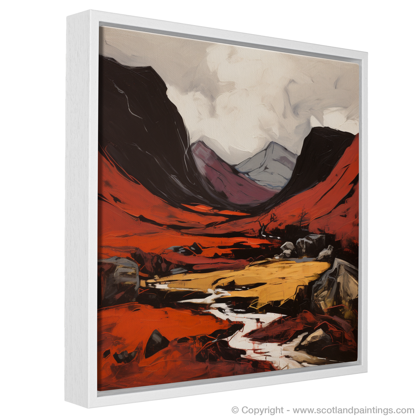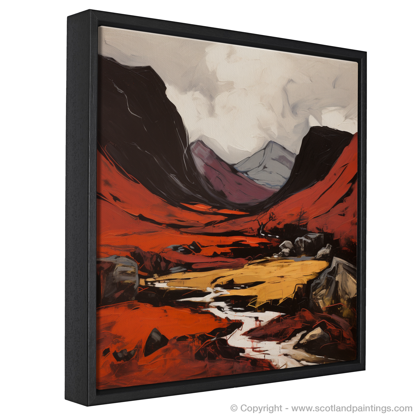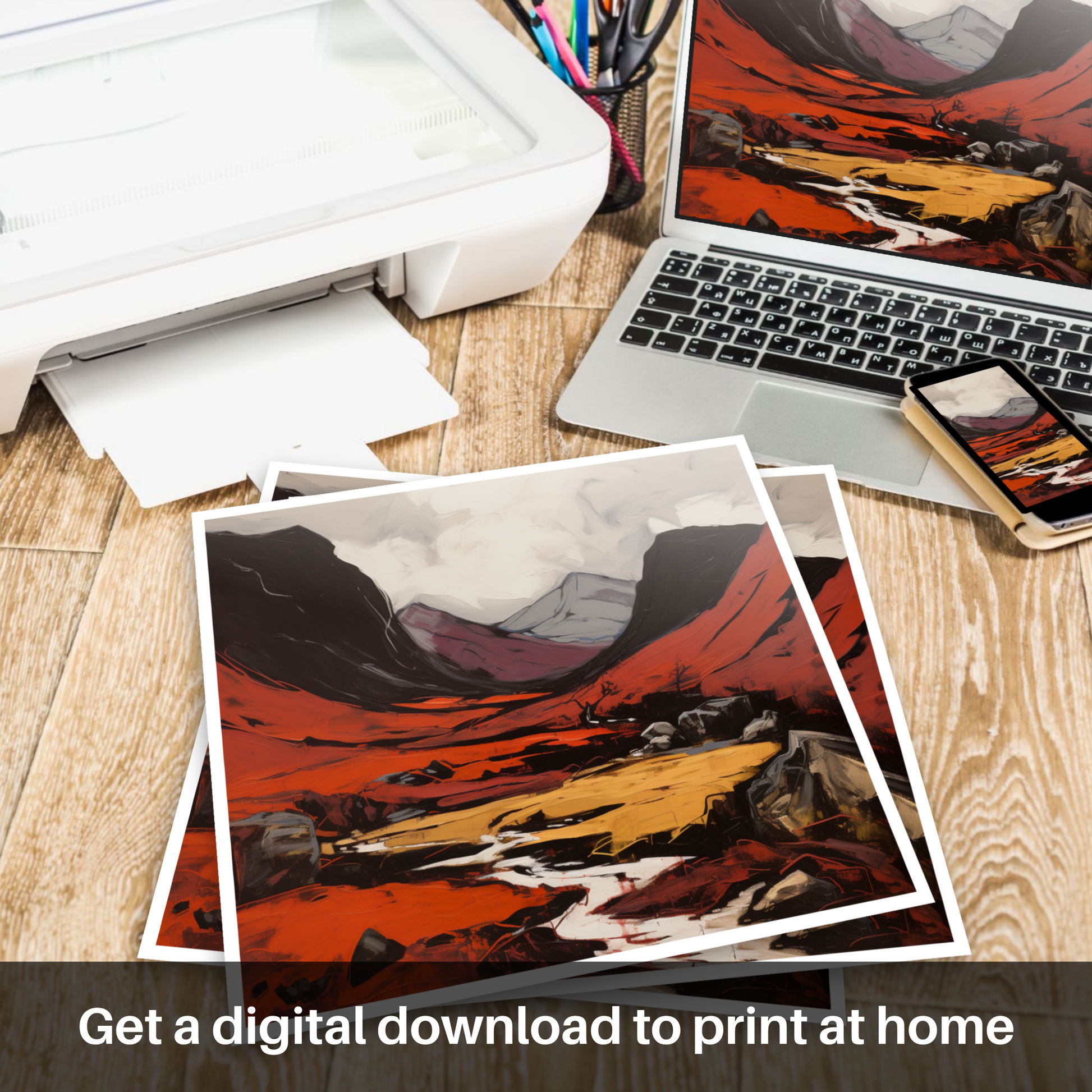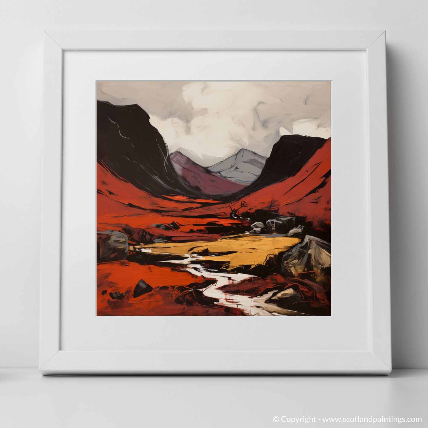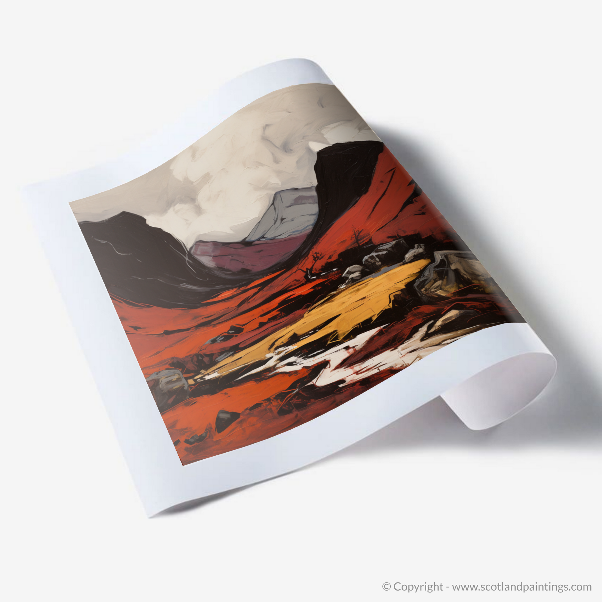 Captured in this expressive print is the raw, untamed beauty of Càrn an Tuirc, a celebrated peak among Scotland's famed Munros. The viewer is invited into a dramatic landscape where bold brushstrokes and a vivid palette convey the rugged terrain and its sombre majesty. Hues of crimson and fiery orange sweep across the canvas, suggesting the wild heathers and the last embers of sunlight that dance upon the rugged hillside, while a stark contrast is presented by the dark, brooding outlines of the mountain crests.