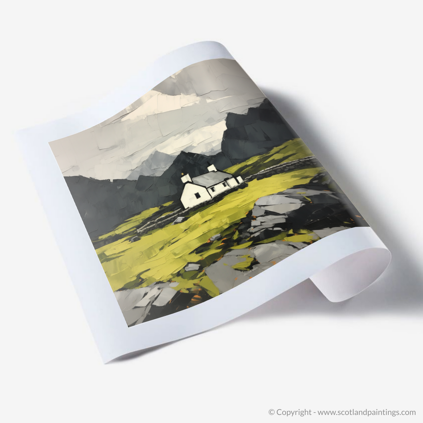 Nestled within this elemental embrace, a solitary whitewashed cottage with a traditional gabled roof stands as a testament to human presence, its stark, cleanly defined walls and chimneys providing a calm point of focus amidst the wilderness. A dry stone wall gently meanders, leading the gaze back into the depth of the highlands and beyond, inviting contemplation of the solitude and silence that this remote dwelling might offer.
