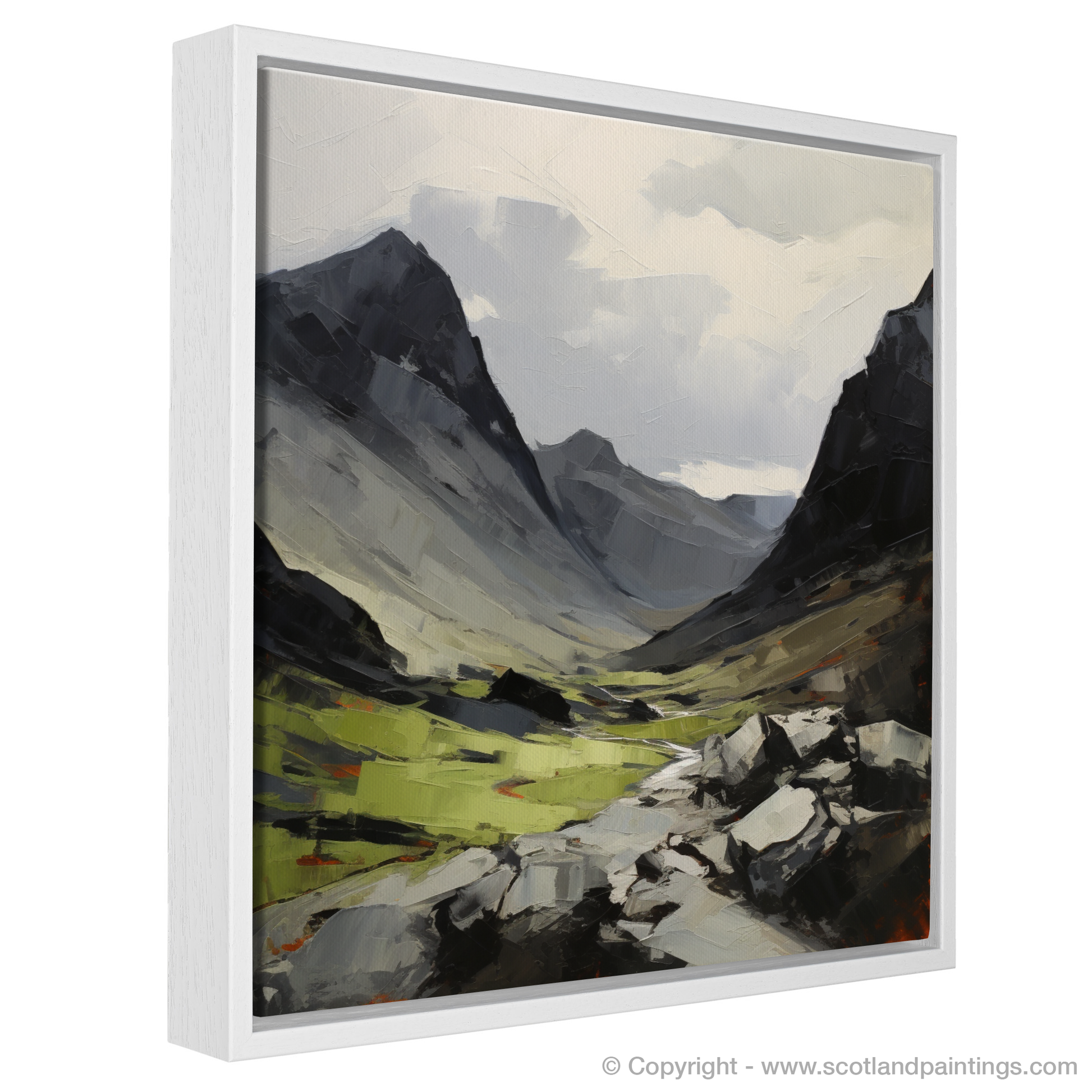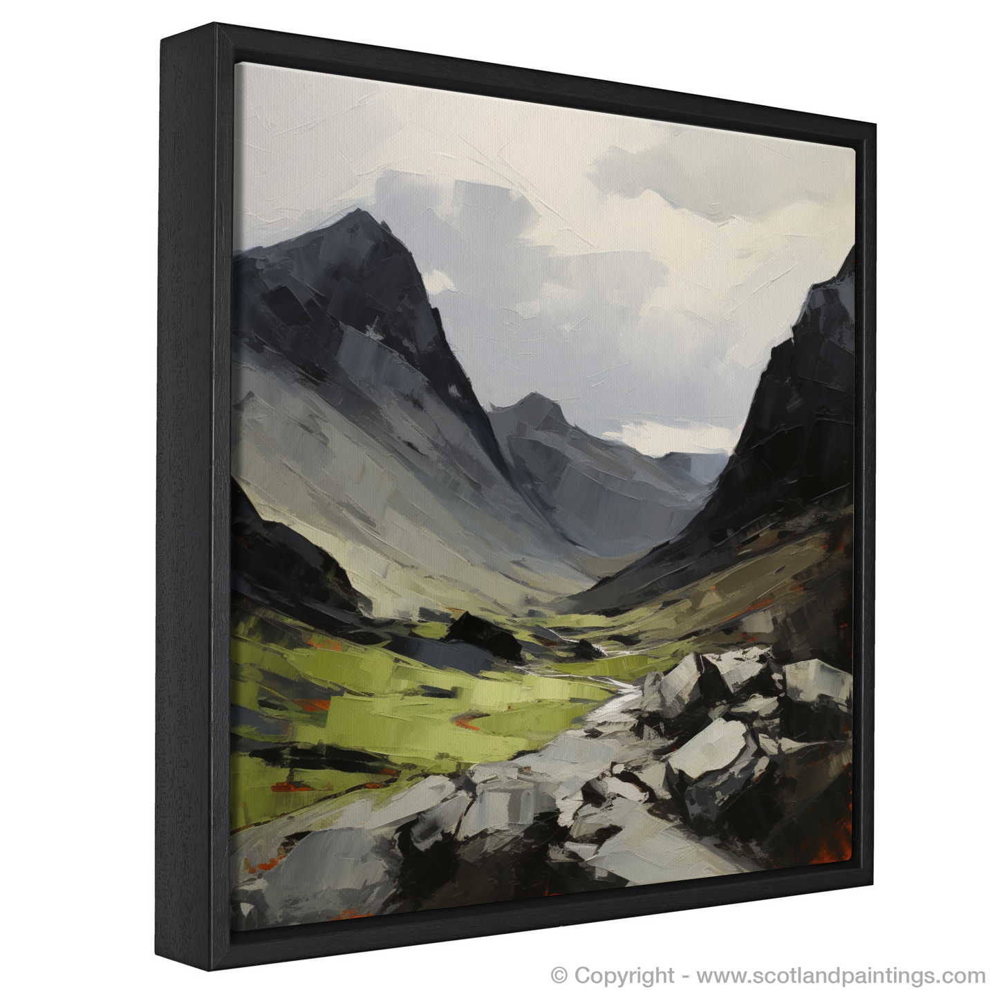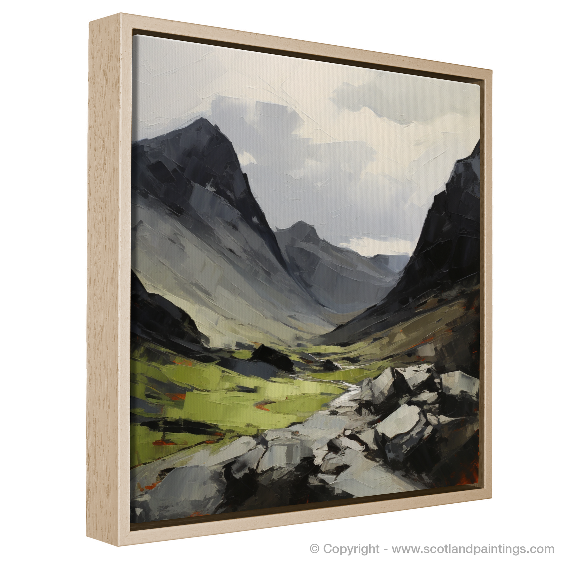 The essence of Expressionism is embodied through the dramatic use of colour and texture, conveying the emotional response to the landscape rather than a literal interpretation. Sharp contrasts between the lush greens of the valley and the stark greys of the towering cliffs stir a sense of the sublime, reminiscent of Scotland's wild and untamed nature.