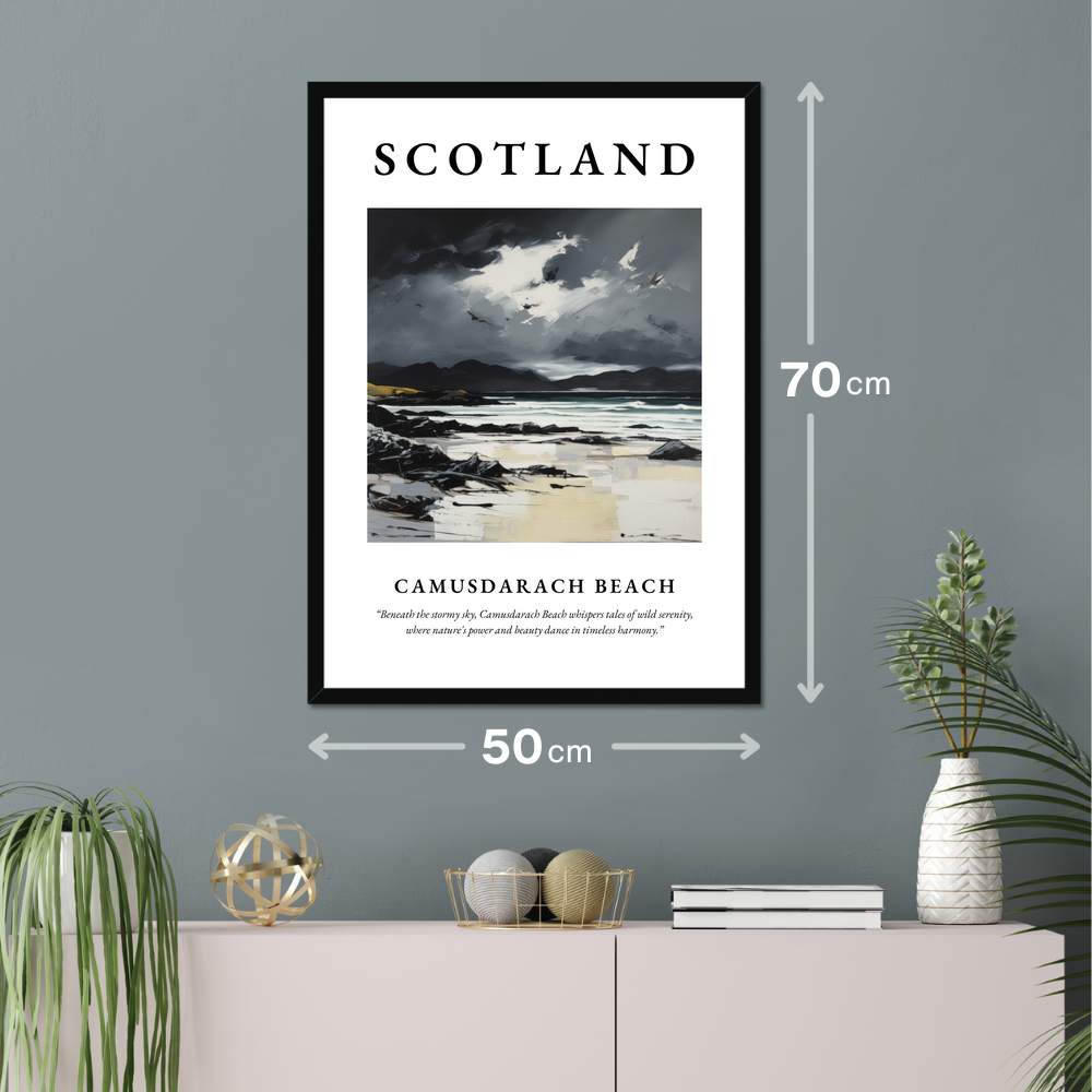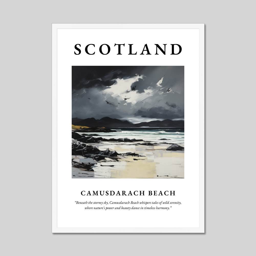 Immerse yourself in the captivating beauty of Scotland with our stunning framed poster print, perfect for those who cherish the enchanting landscapes of this magical country. Measuring a generous 50cm x 70cm, this artwork beautifully encompasses the vast essence of Camusdarach Beach, a serene sanctuary where the dramatic clash between nature's power and tranquillity unfurls. Available in elegant black, sleek white, or a rustic natural wood-effect frame, this exquisite poster effortlessly complements any interior décor style.