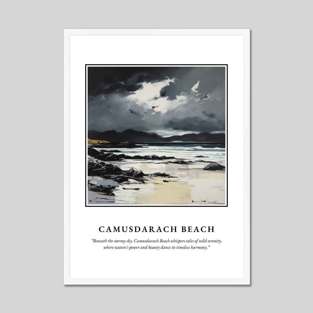 Emblazoned with the evocative quote, "Beneath the stormy sky, Camusdarach Beach whispers tales of wild serenity, where nature's power and beauty dance in timeless harmony," this large-format piece offers an affordable way to transform a substantial wall space, serving as both a conversation starter and a window to the soul-stirring wilderness of Scotland.