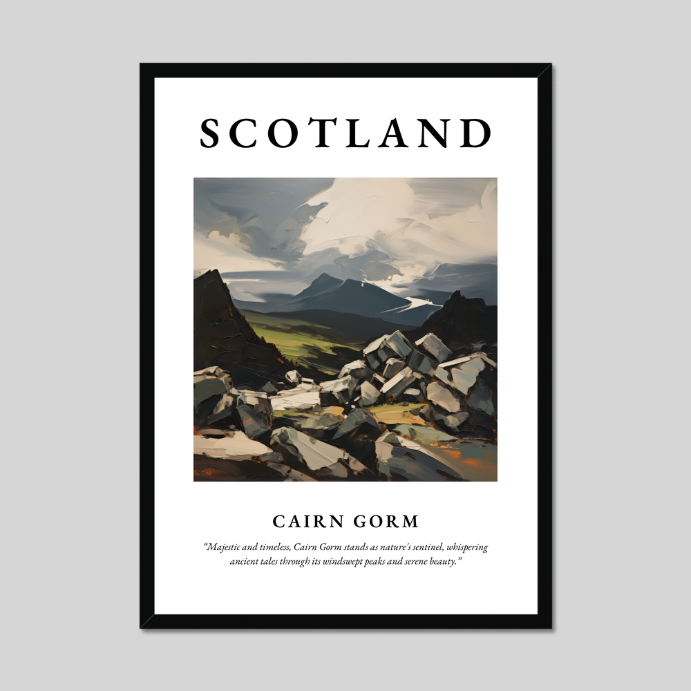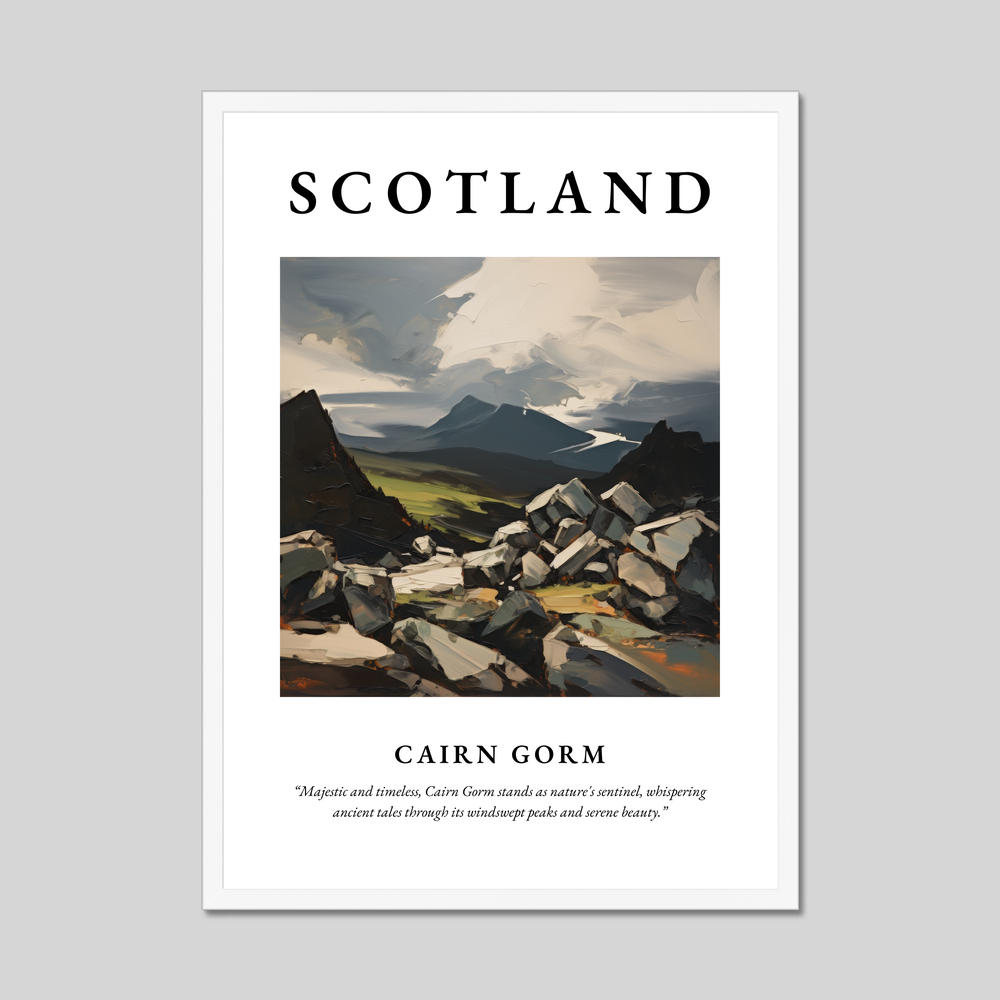 Available in a choice of elegant black, pristine white, or a charming natural wood-effect frame, this poster is a versatile addition to any décor style. The expressionist painting skillfully evokes the dramatic essence of Cairn Gorm, with bold brush strokes and vivid contrasts depicting the rugged terrain and atmospheric skies. This vibrant interpretation exudes the spirit of the Highlands, appealing to art lovers and admirers of expressionism.