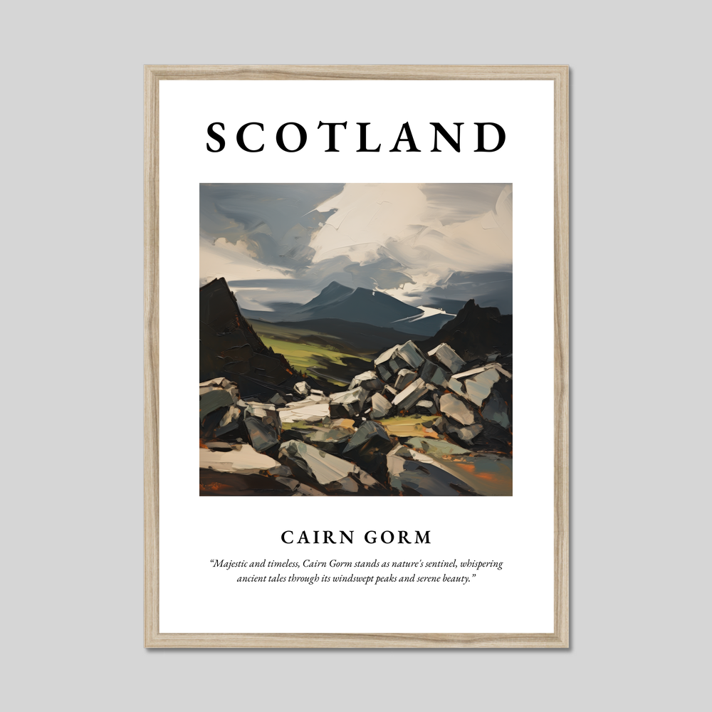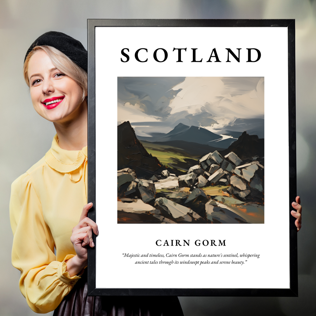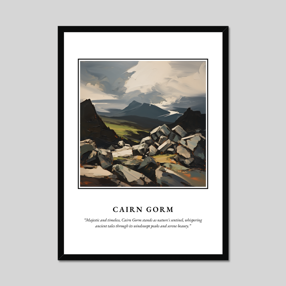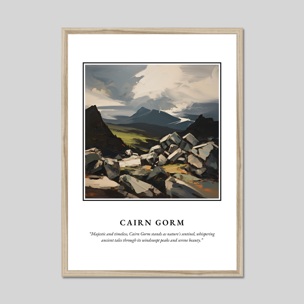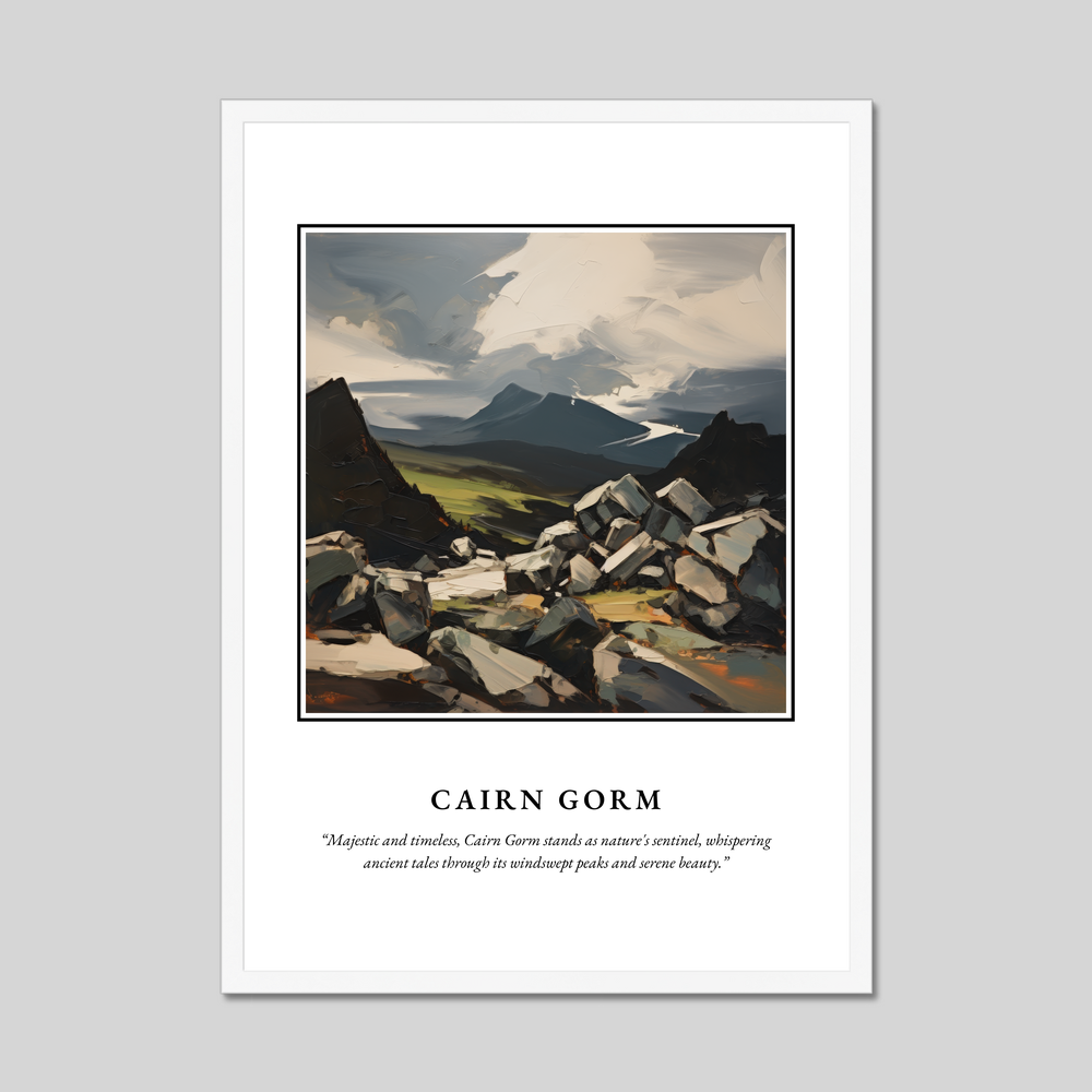 Below the painting, the quote “Majestic and timeless, Cairn Gorm stands as nature's sentinel, whispering ancient tales through its windswept peaks and serene beauty.” adds a poetic touch, resonating deeply with those who have experienced the Highlands’ allure or hold a connection to this enchanting place.