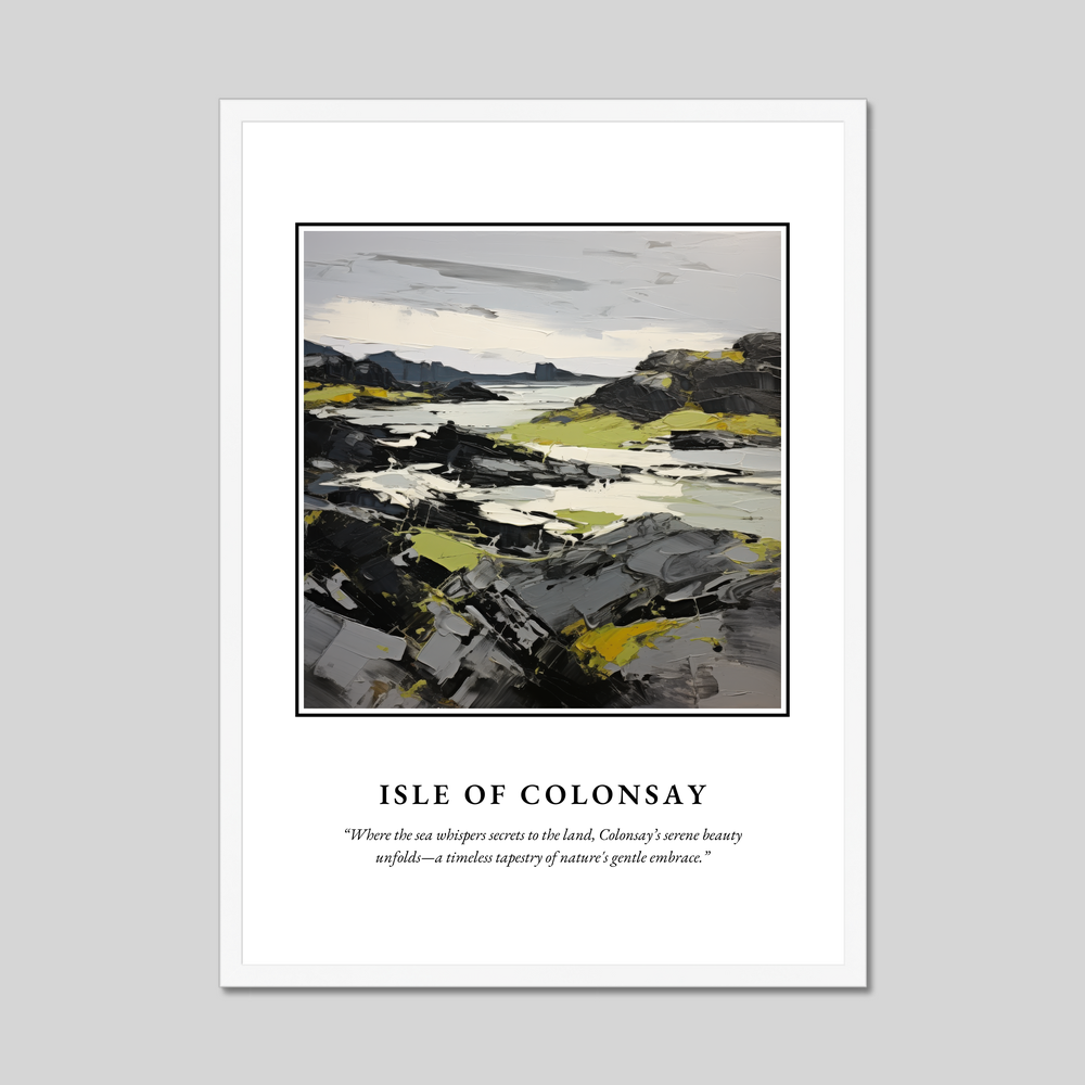 Beneath the painting, the poetic quote encapsulates the allure of Colonsay: “Where the sea whispers secrets to the land, Colonsay’s serene beauty unfolds—a timeless tapestry of nature's gentle embrace.” Whether you're a lover of art, an admirer of the Expressionism style, or someone who cherishes a connection to this Scottish gem, this poster resonates with beauty and meaning.