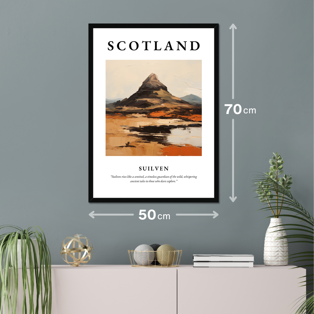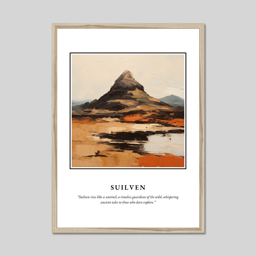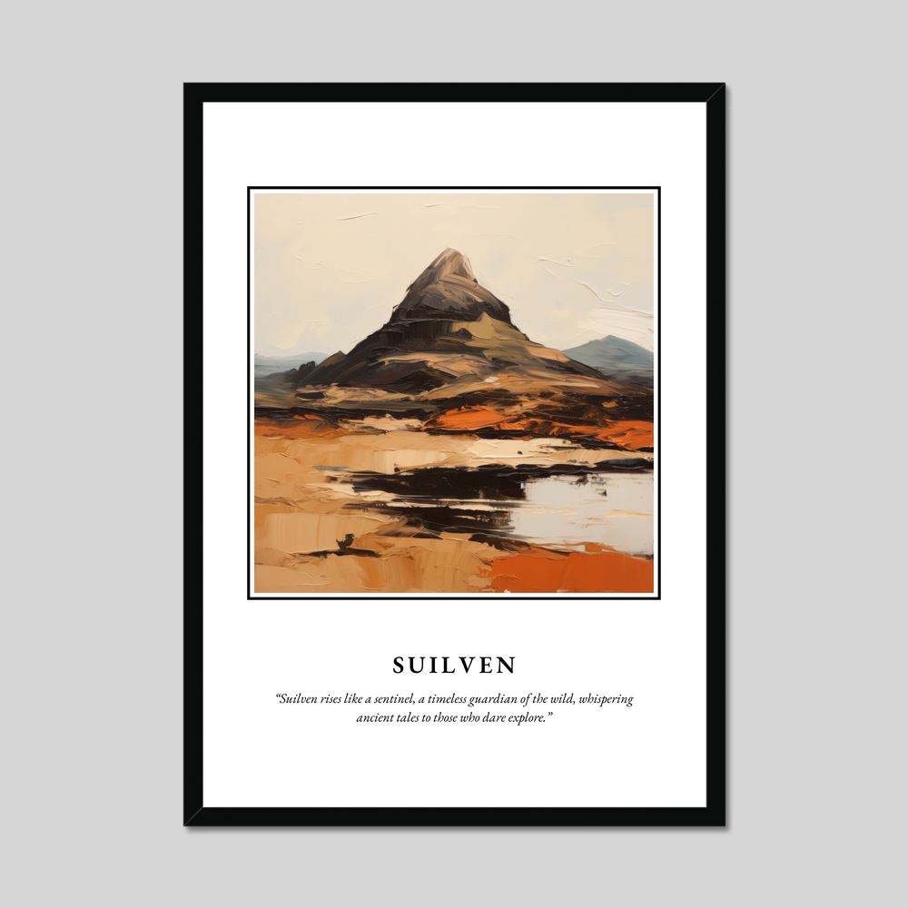 Elevate your space with our exquisite framed poster print featuring the iconic Scottish mountain, Suilven. Measuring an impressive 50cm by 70cm, this large poster commands attention, making it an ideal centrepiece for any room. Available in three tasteful frame options—classic black, crisp white, or a warm natural wood-effect—it seamlessly complements any décor style, ensuring that this piece will captivate and inspire.