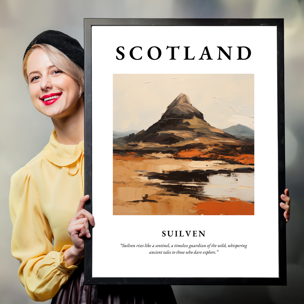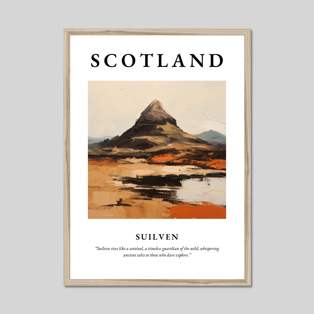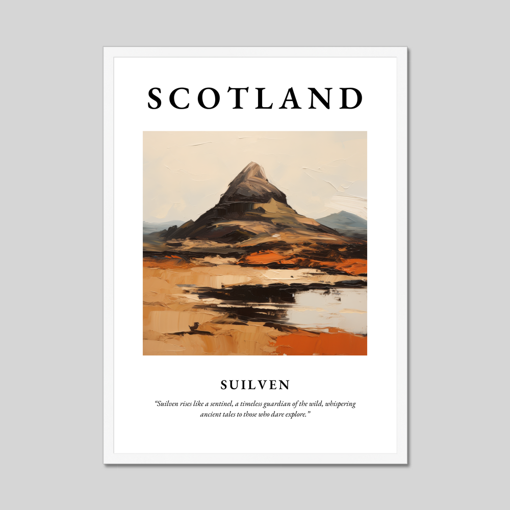 Boldly at the top, the word “SCOTLAND” introduces this striking poster, setting the stage for a breathtaking expressionist depiction of Suilven. The painting captures the mountain's majestic form, an intricate dance of sweeping brushstrokes and vibrant colours that convey the rugged beauty and mystique of Scotland's landscapes. Below the painting, the words, “Suilven rises like a sentinel, a timeless guardian of the wild, whispering ancient tales to those who dare explore,” invite you to lose yourself in the wonders of this awe-inspiring land.