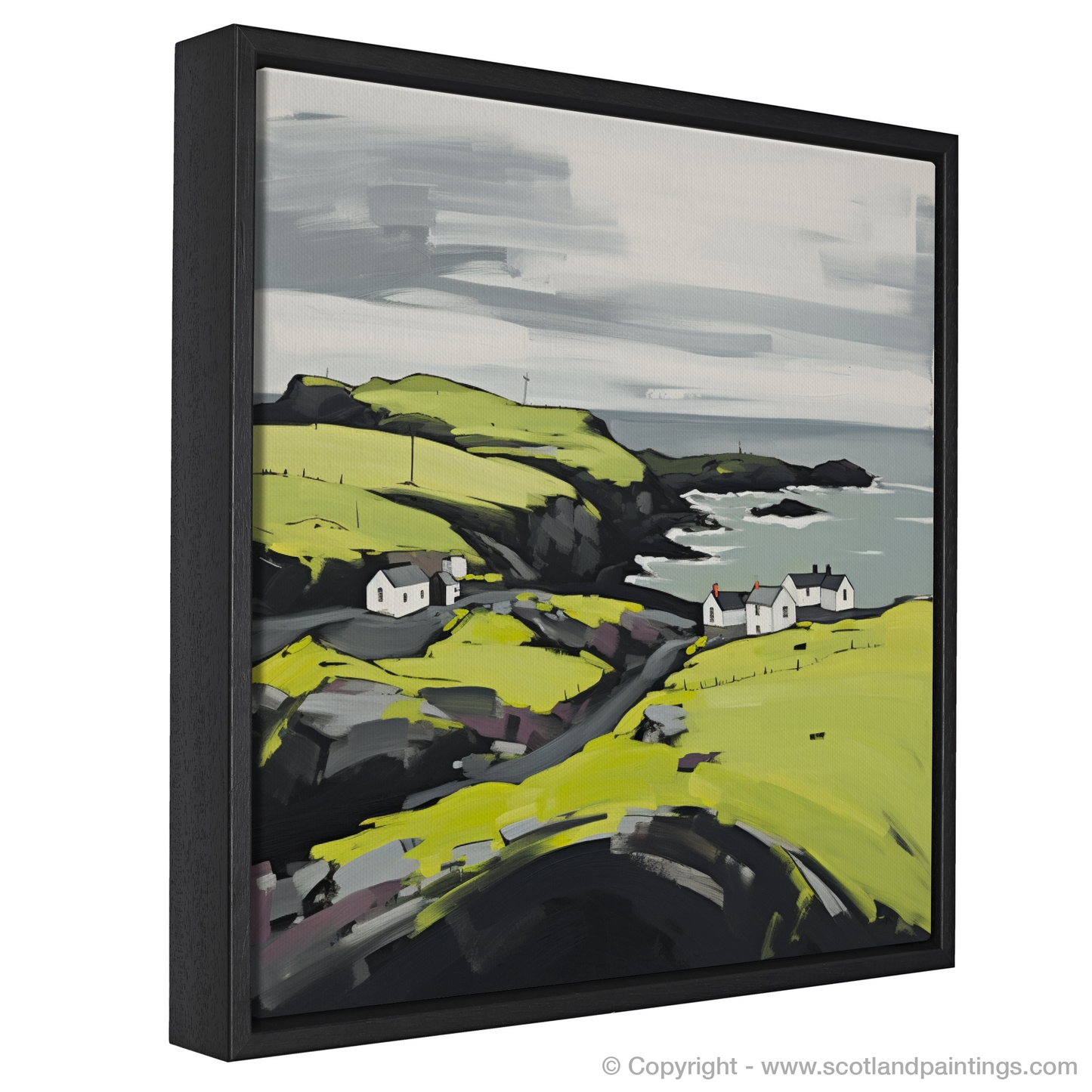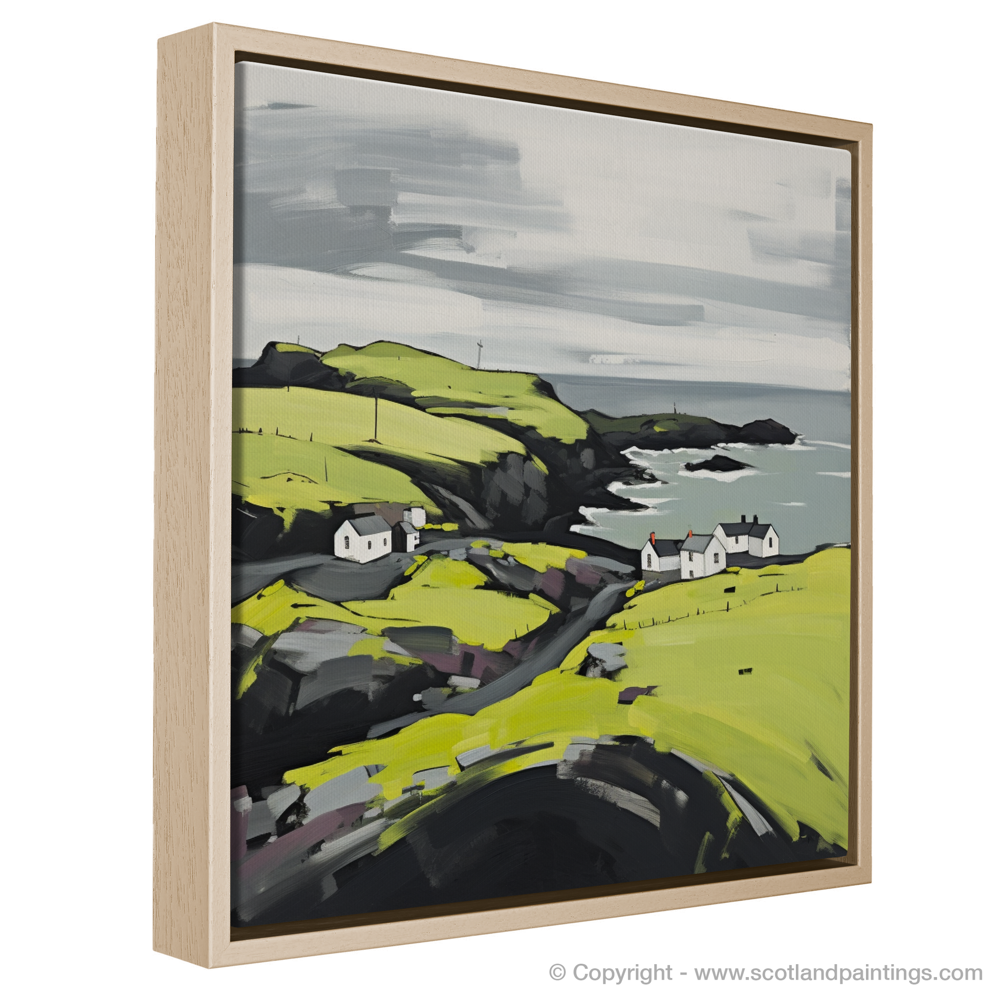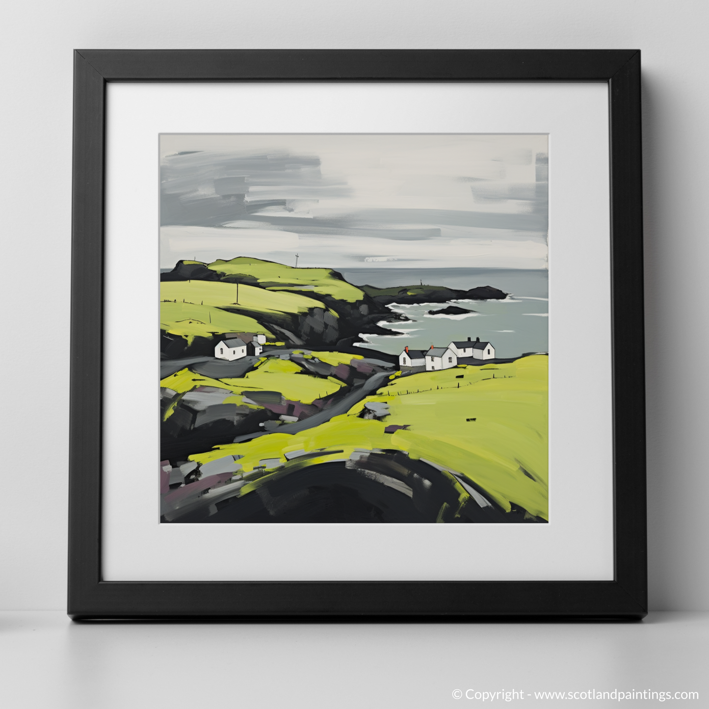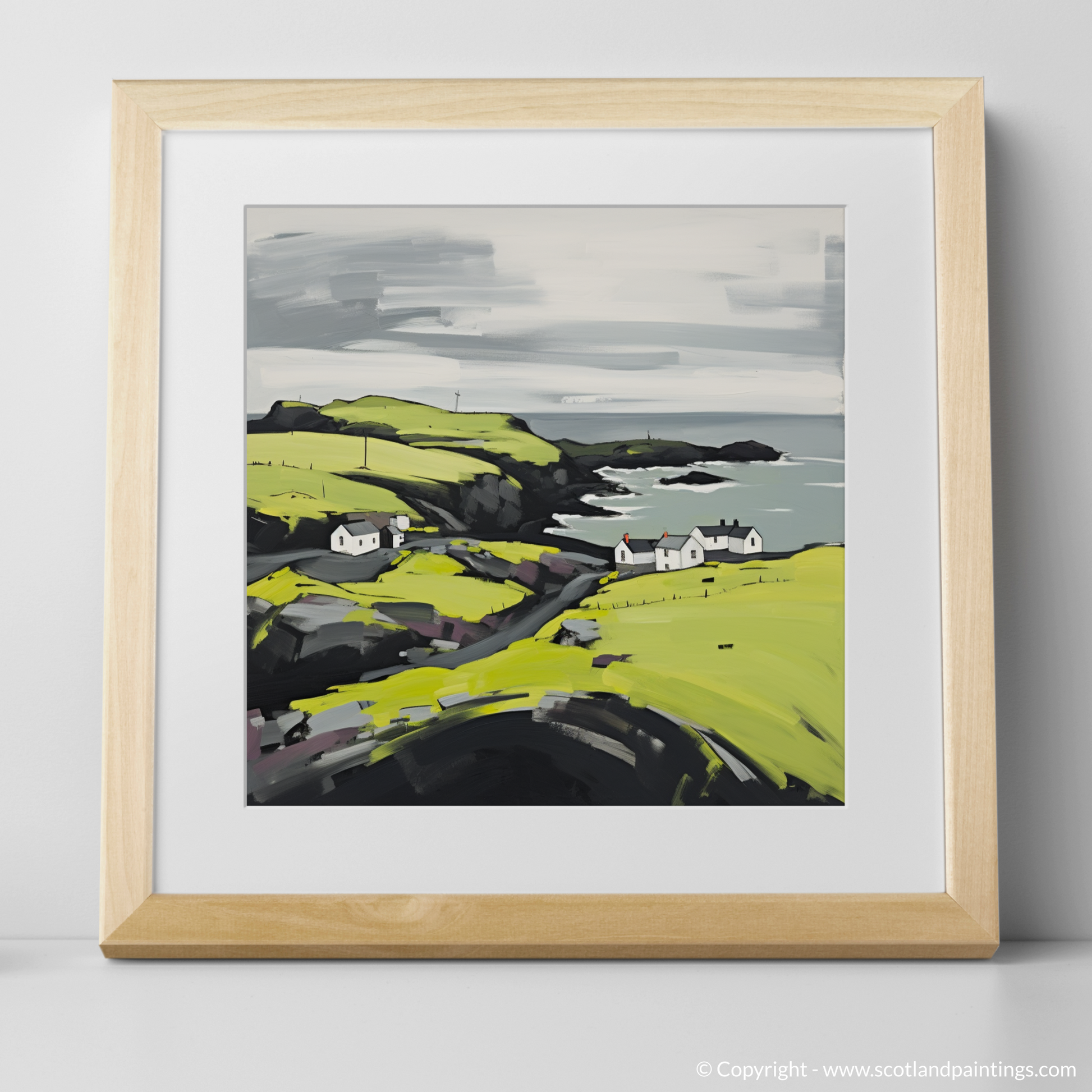 This evocative print captures the raw, untamed beauty of the Shetland Isles with a bold expressionist flair. Lively brushstrokes in a monochromatic palette convey the rugged terrain, characterised by undulating hills and sheer cliffs. Strokes of vibrant yellow break through the scene, suggesting patches of sunlight dancing across the moorland and illuminating the verdant grasses, which appear to ripple like waves in the North Sea breeze.