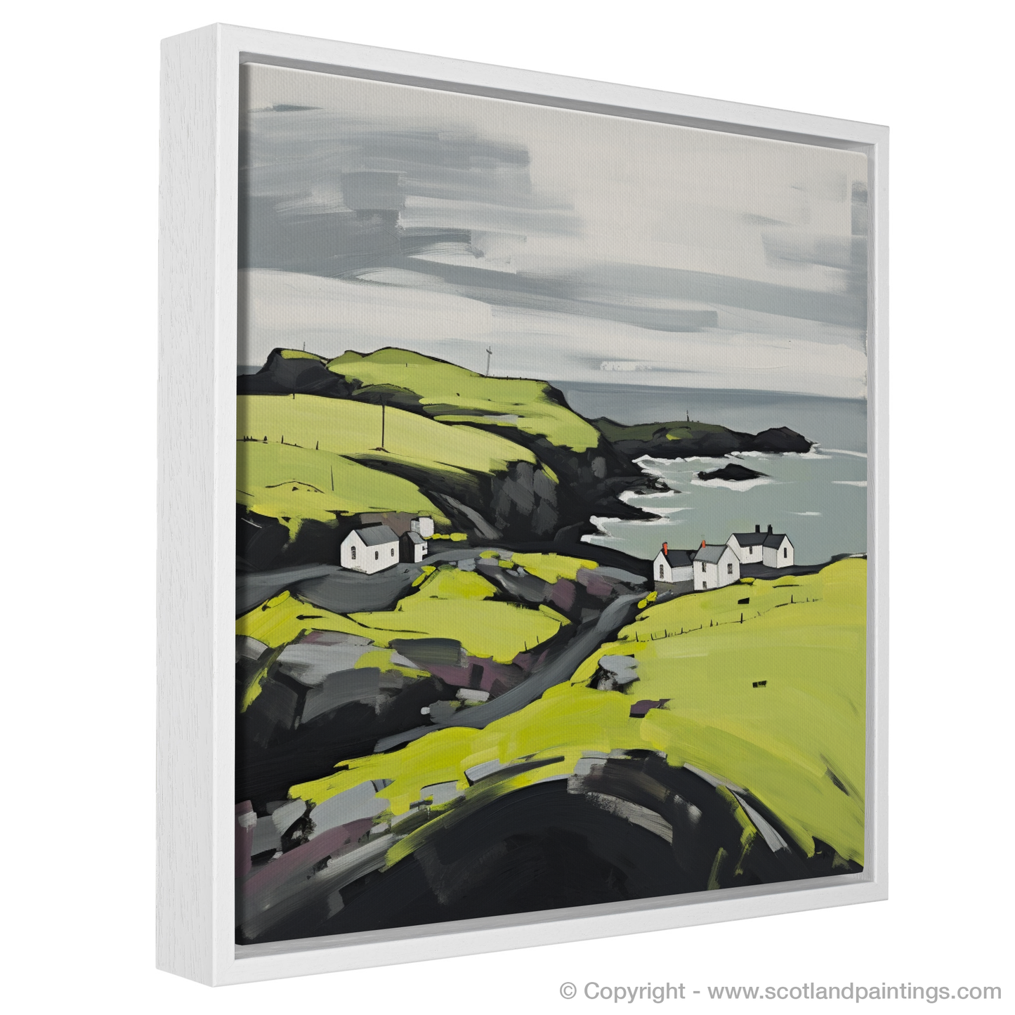 Nestled within this dramatic landscape are the simple yet striking forms of traditional Shetland houses with their white-washed walls and contrasting red roofs, anchoring the composition in a comforting sense of human habitation amidst the wild. The houses are depicted as sturdy, quaint structures in harmony with their environment, their geometric shapes both juxtaposing and complementing the more fluid elements of the surroundings.
