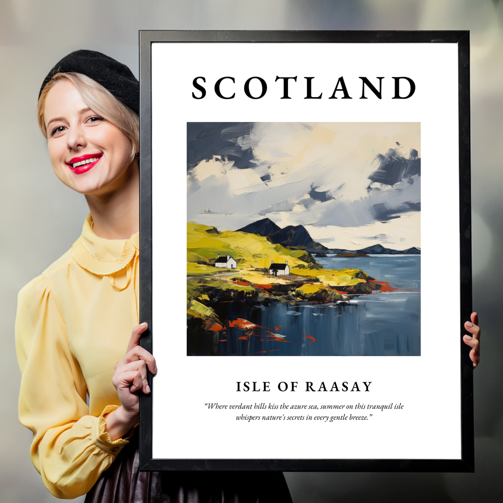 The poster features the bold, captivating word “SCOTLAND” at the top, followed by an exquisite expressionist painting of the Isle of Raasay. The vivid use of colour and dynamic brushstrokes transport the viewer to a place where verdant hills stretch towards the azure sea, perfectly encapsulated by the quote: “Where verdant hills kiss the azure sea, summer on this tranquil isle whispers nature's secrets in every gentle breeze.” This artwork embraces the emotion and movement of Expressionism, appealing to art enthusiasts and admirers of this unique style.