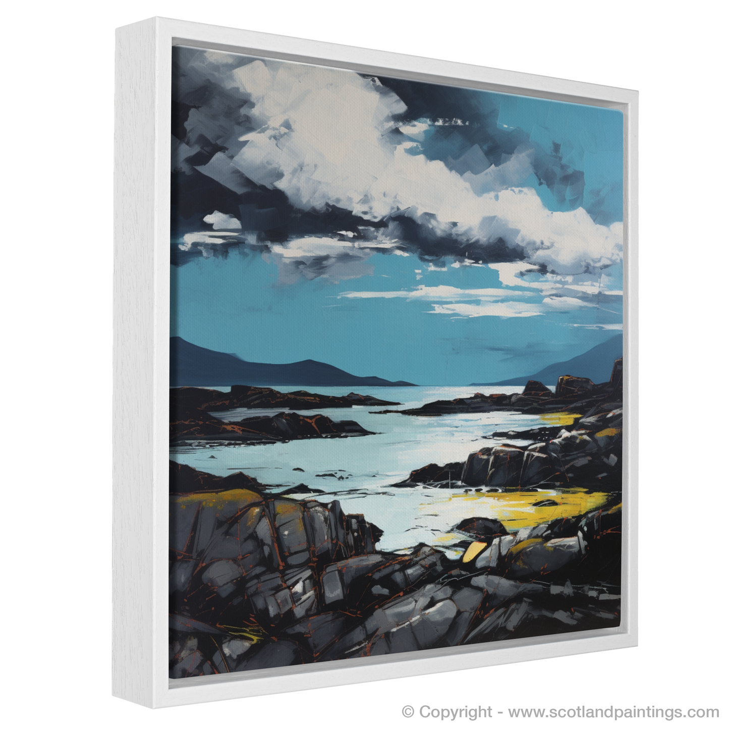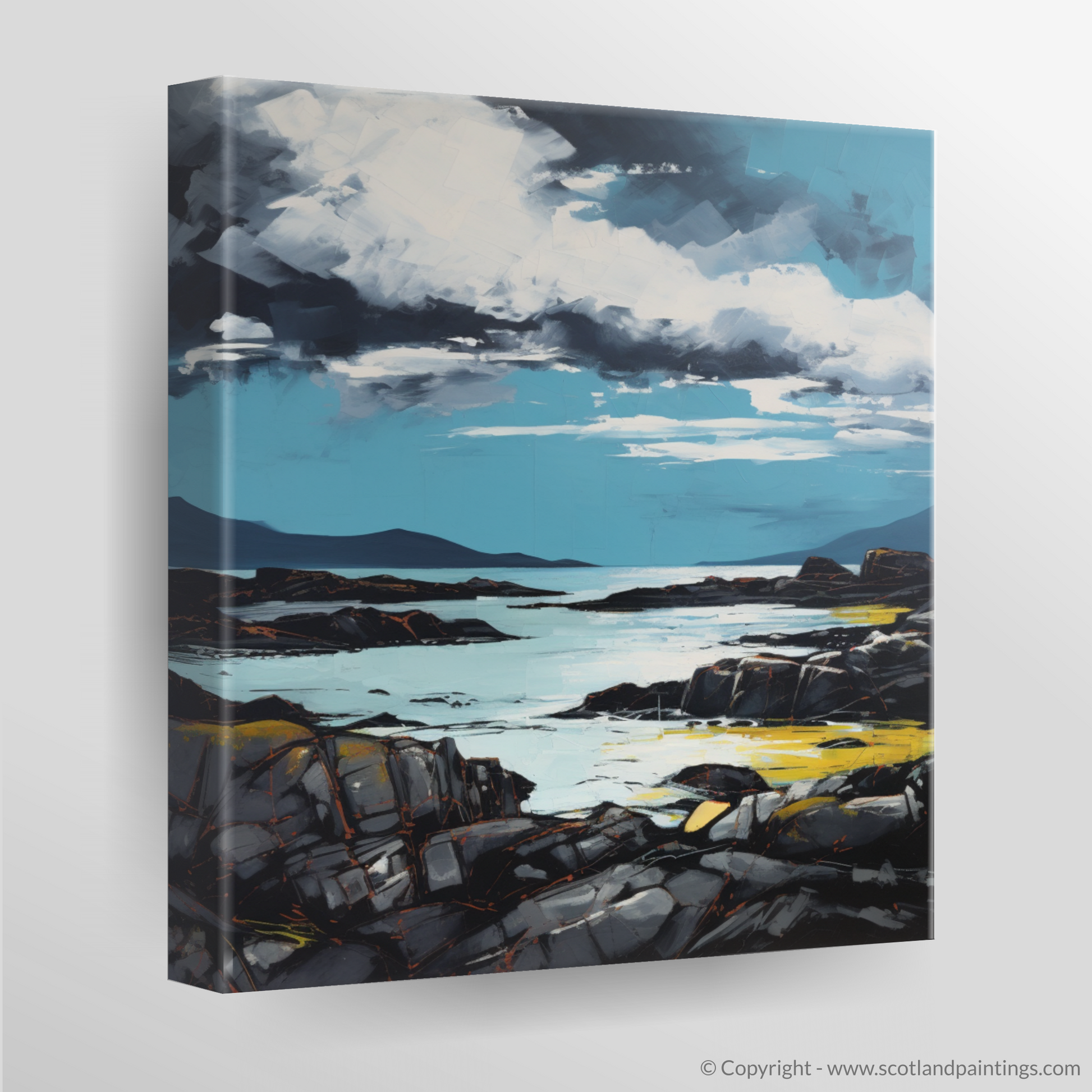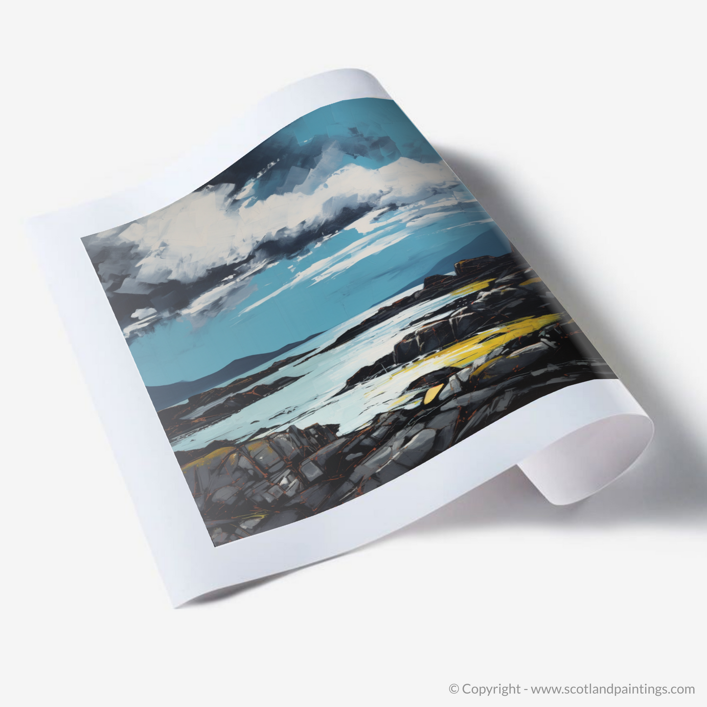 Discover the rugged beauty of the Isle of Harris encapsulated in this evocative expressionist print. Inspired by the unique landscapes of the Outer Hebrides, this piece conjures the raw, elemental spirit of Scotland's islands with its bold brushwork and striking use of colour.
