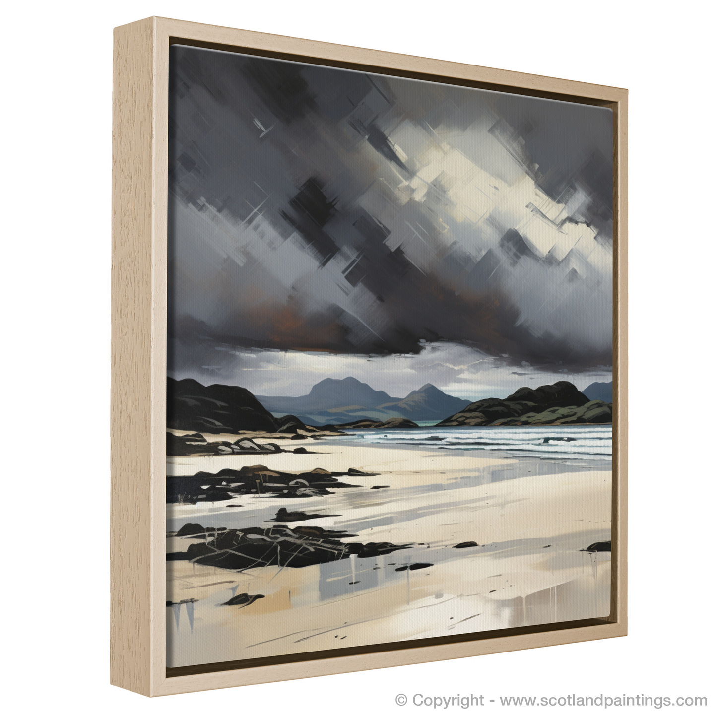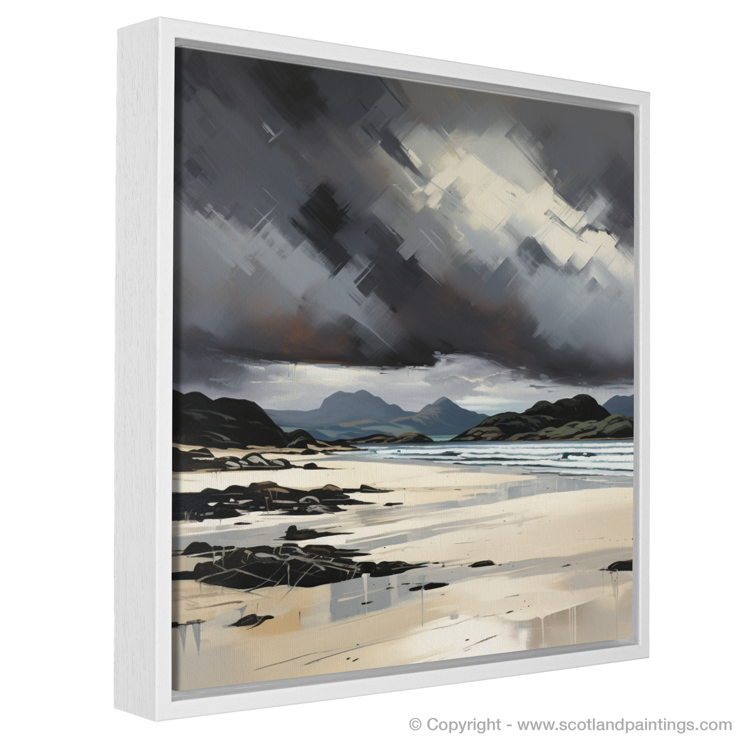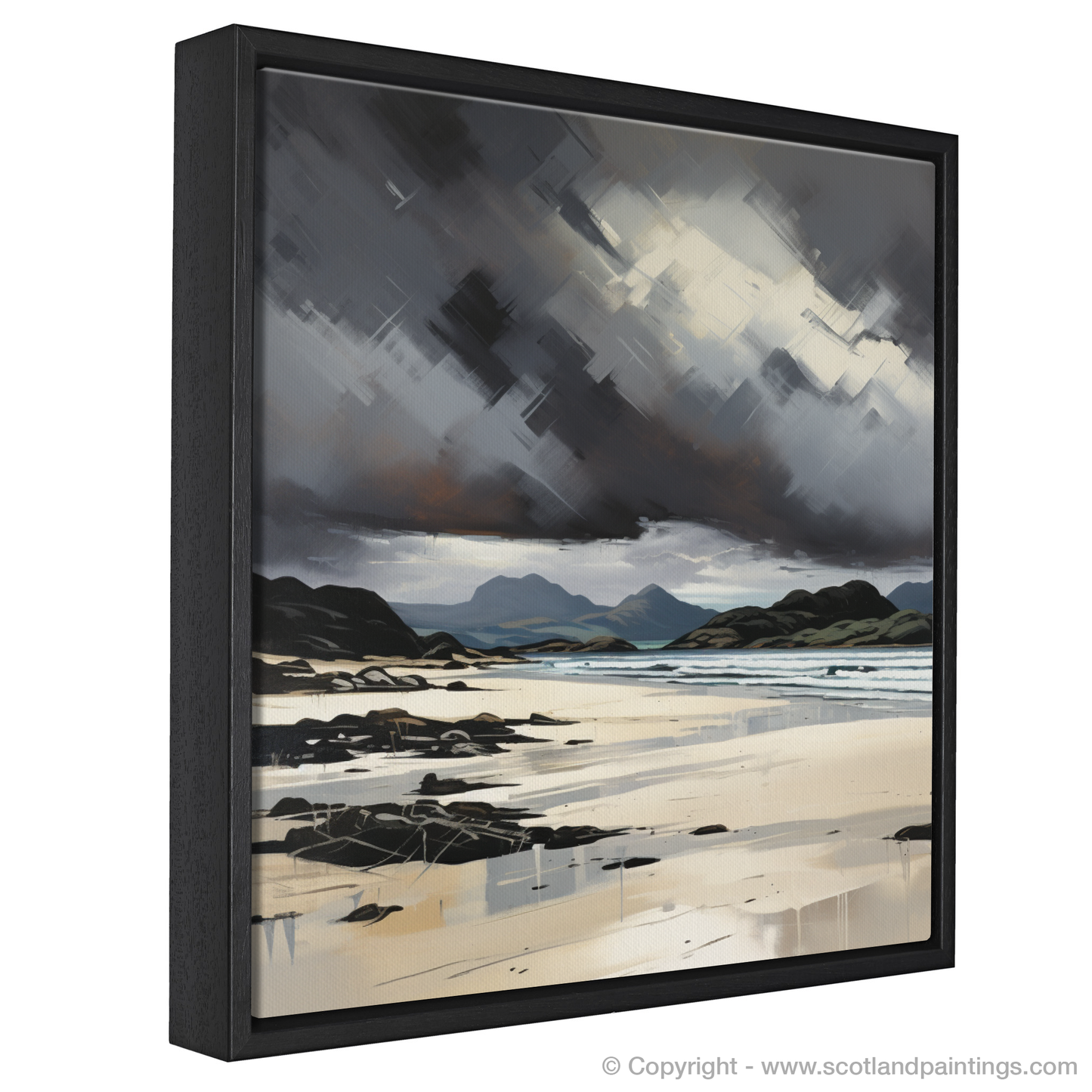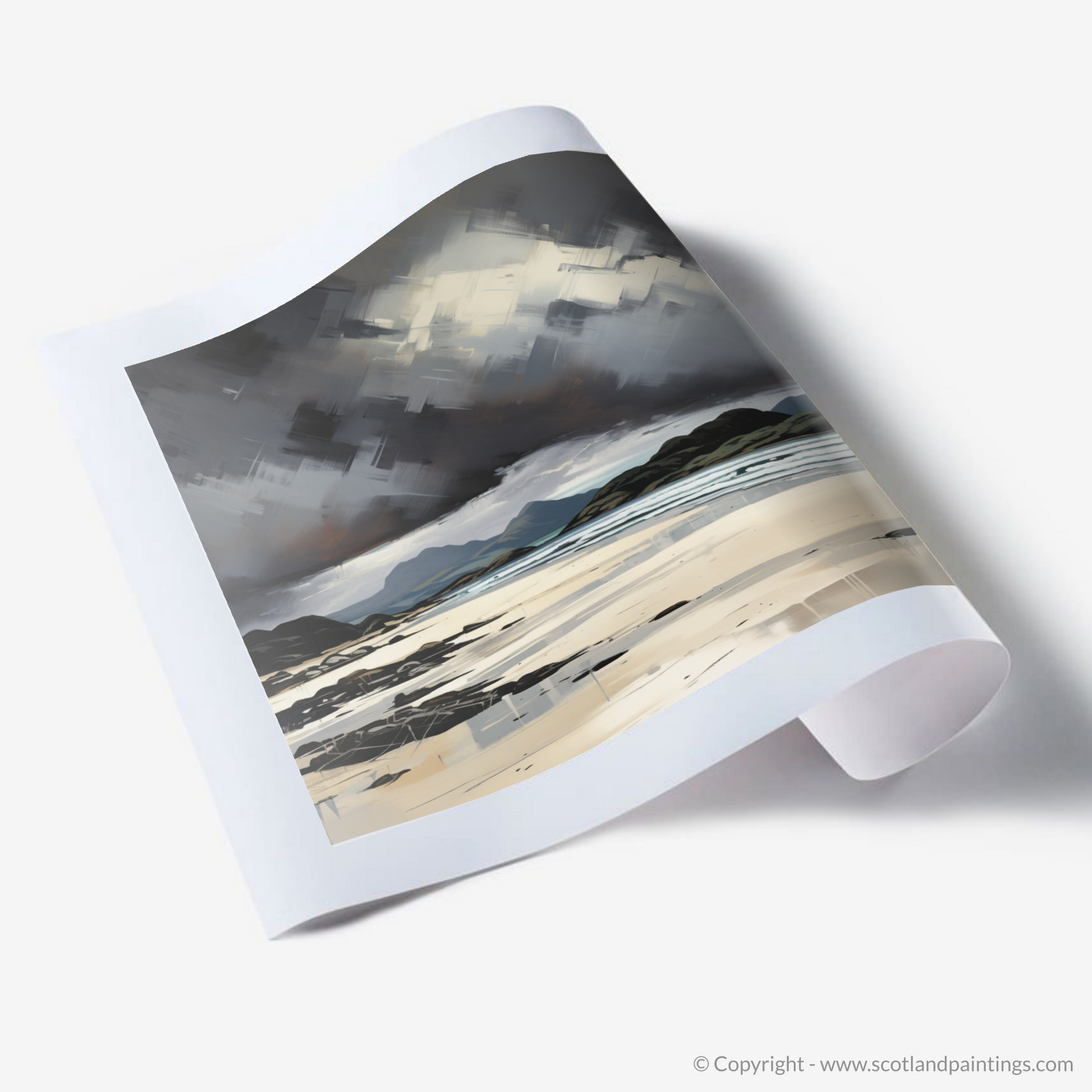 Capturing the raw essence of Mellon Udrigle Beach, this evocative print brings to life the tumultuous beauty of the Scottish coastline. The dynamic composition features swirling storm clouds dominating the overhead space, rendered with dramatic strokes of charcoal and grey, interjected with piercing whites that cut through the tumult like shards of light. This maelstrom in the heavens conveys a sense of unrest, as if nature itself is in the throes of contemplation.