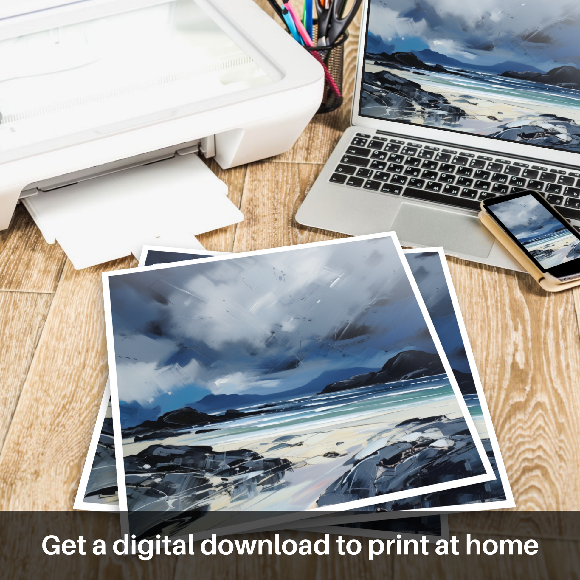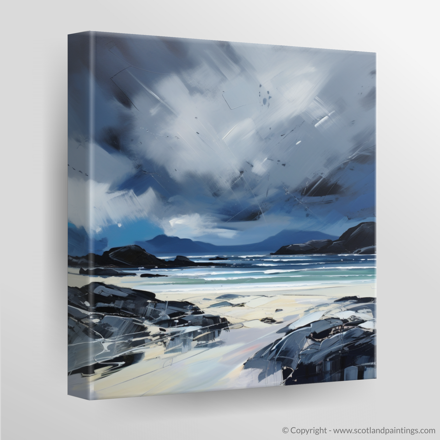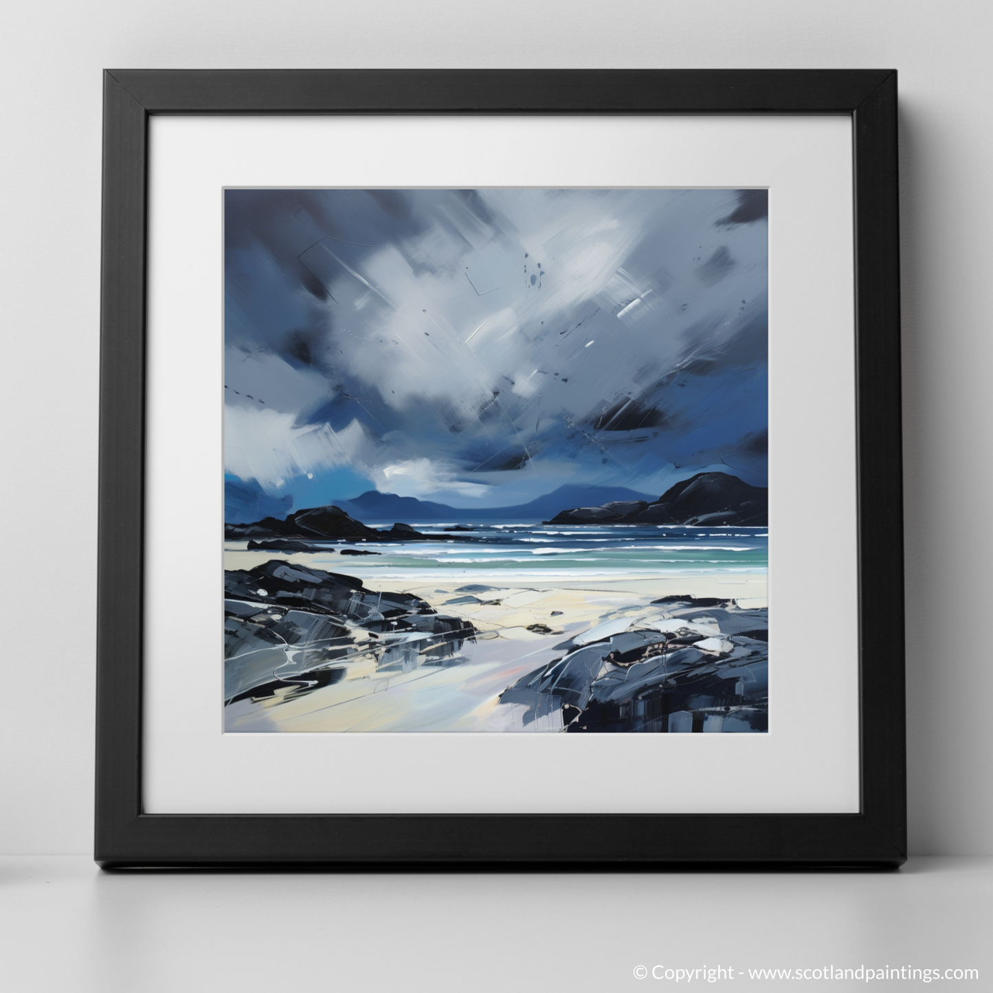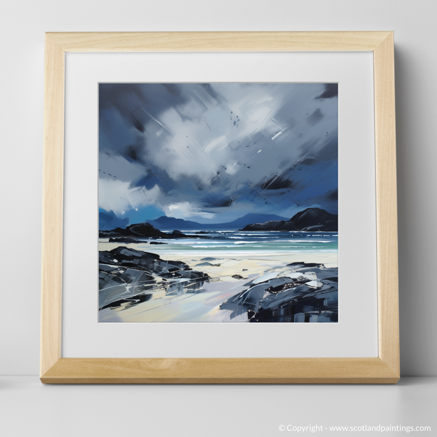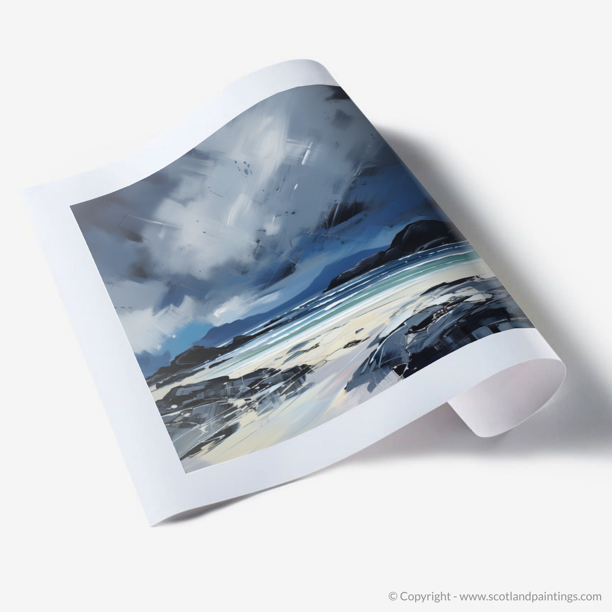 This evocative print captures the untamed essence of Mellon Udrigle Beach, set against the dramatic backdrop of a stormy Scottish sky. The piece is a stirring symphony of contrasting colour and emotion, embodying the raw intensity of nature that is so characteristic of Scotland's coastal landscapes.