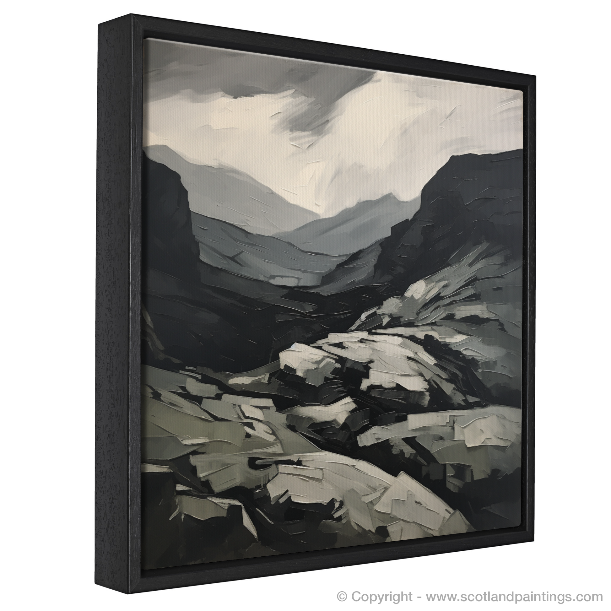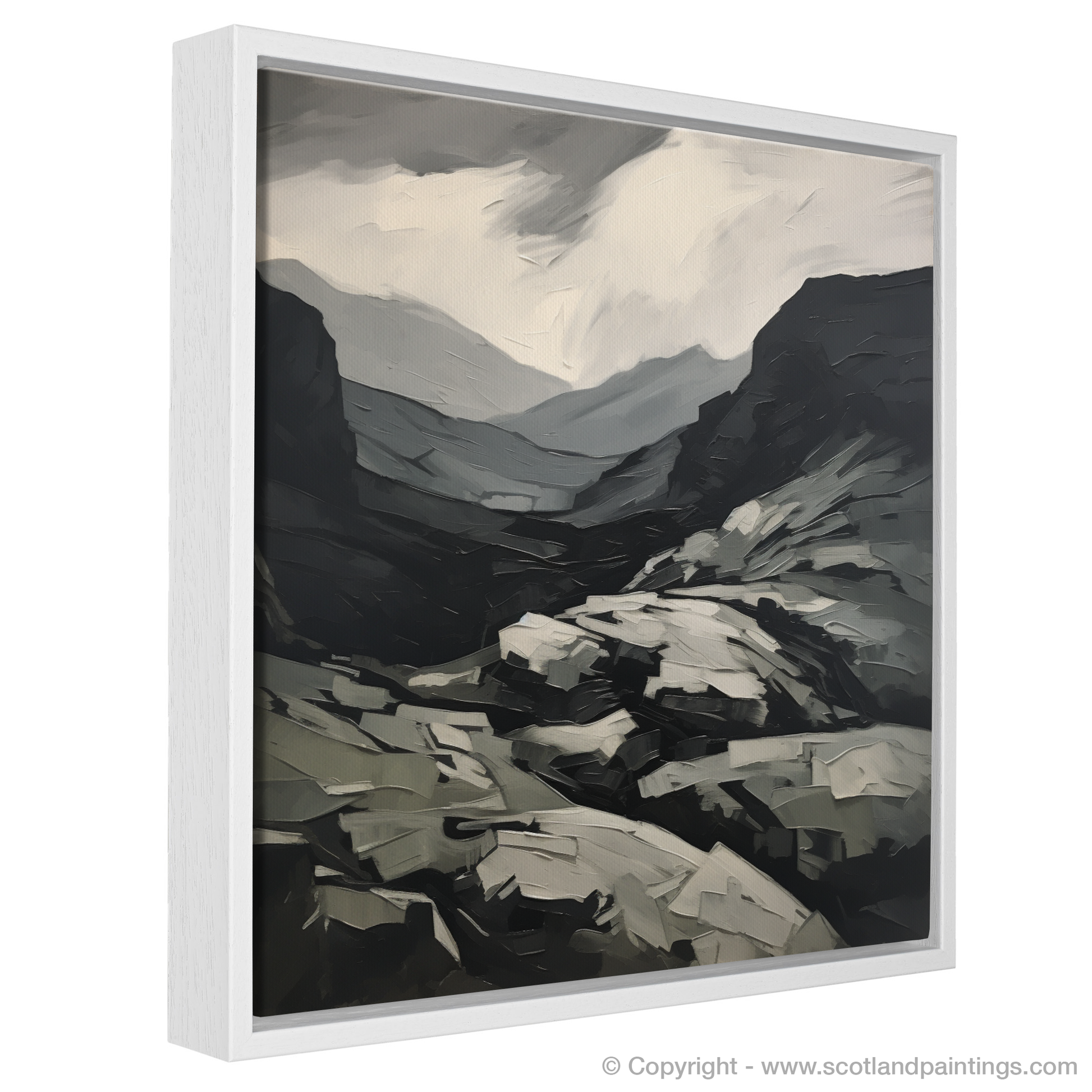 The sky, depicted in a swirl of monochromatic hues, brings forth an energy that is both foreboding and mesmerising, reflecting the often unpredictable Scottish weather. Below, the mountain's surface is rendered through a series of jagged and fragmented shapes, mirroring the craggy, broken rock faces that characterise Càrn Aosda's imposing presence.