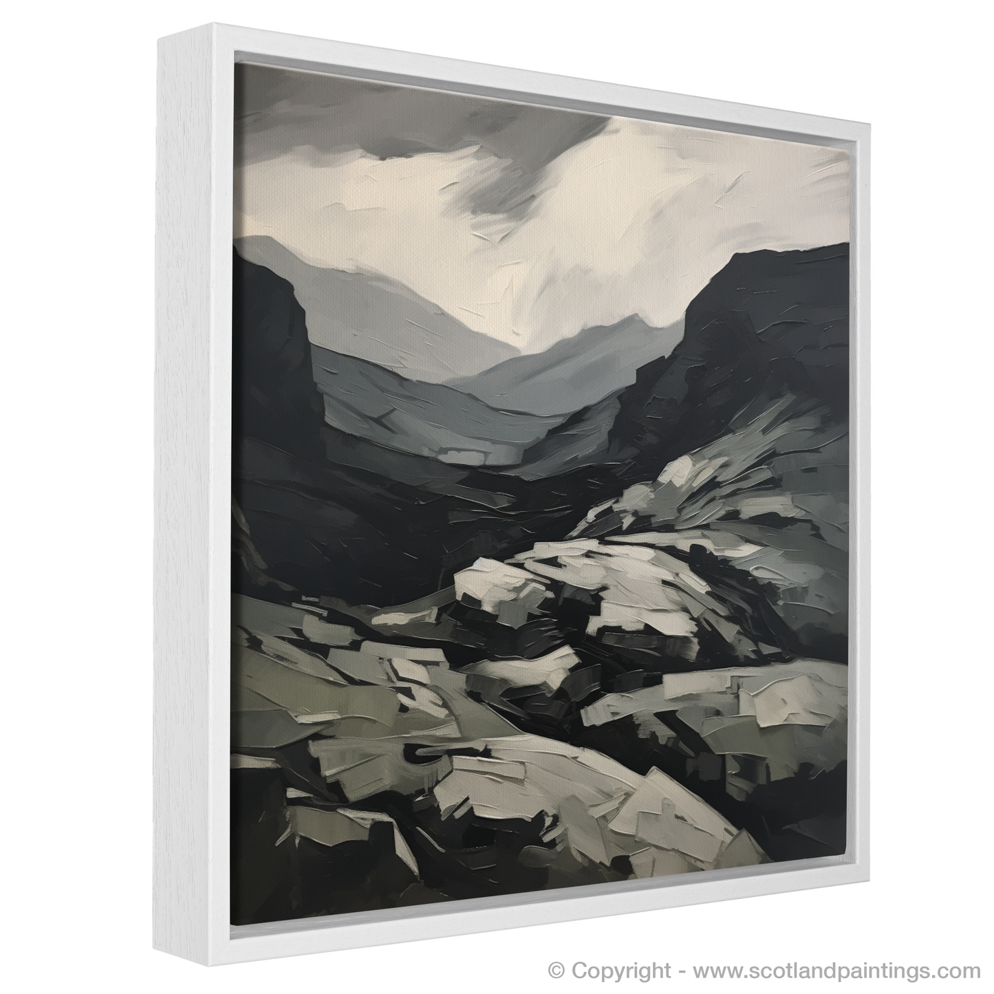 Broad, impasto-like applications of paint suggest the wild, untamed texture of the highland terrain. The palette is deliberately limited, employing a range of greys, blacks, and whites to dramatic effect, which not only enhances the print's atmospheric depth but also allows the viewer's gaze to travel effortlessly across the canvas.