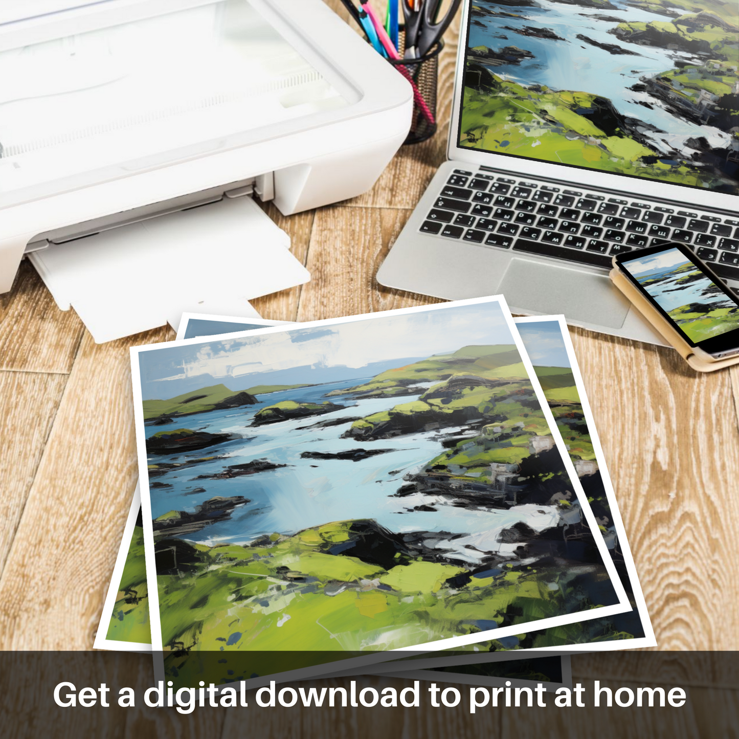 The print unfolds a picturesque scene where the contrasts of colour capture the eye: the lush verdancy of the grasslands; the deep azure of the tranquil sea inlets; and the stark black of the jagged rocks that punctuate the coastline. The artist’s bold, impasto brushstrokes imbue the scenery with a sense of movement and life, as if a gentle breeze were sweeping over the island.