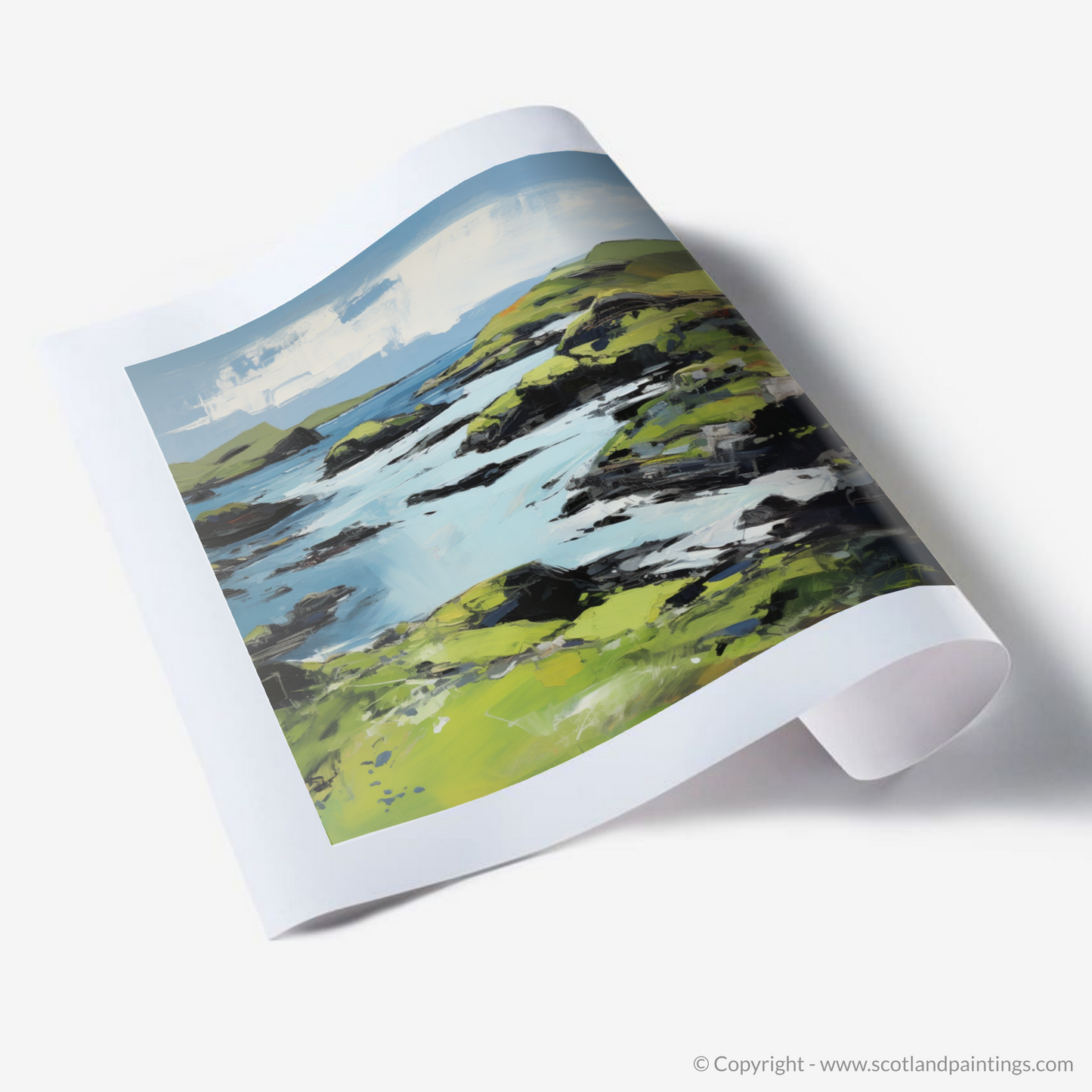 Captured within this vibrant expressionist print is the essence of the Isle of Ulva, a jewel of the Inner Hebrides, basking in the full glory of the summer season. The artwork, evocative and rich in texture, uses a dynamic palette of greens, blues, and whites to represent the lively interplay of light and shadow across the Scottish landscape.