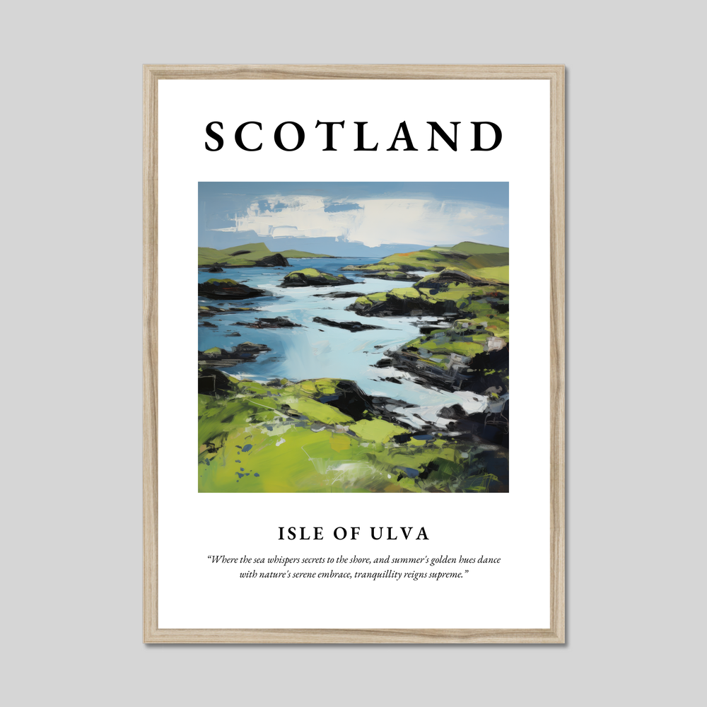 The central focus of the poster is a mesmerising painting of Isle of Ulva, brought to life through the expressive strokes of the Expressionism style. Endowed with vibrant hues and dynamic forms, the artwork captures the serene charm of Isle of Ulva’s landscape, where azure waters gently caress the verdant shorelines. This impassioned portrayal invites onlookers to experience the tranquil whispers of the sea, touched by nature's golden summer hues.