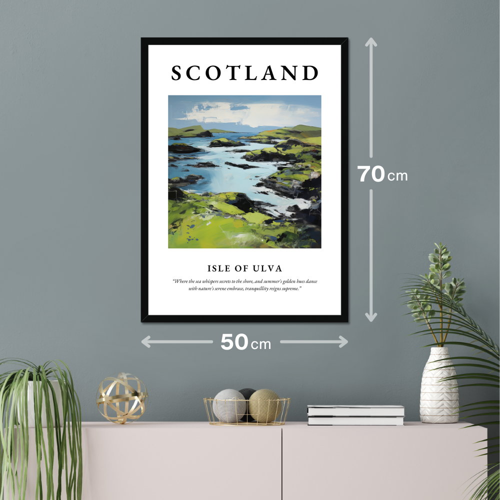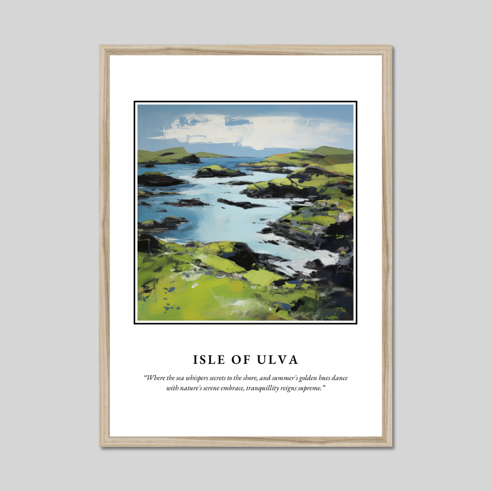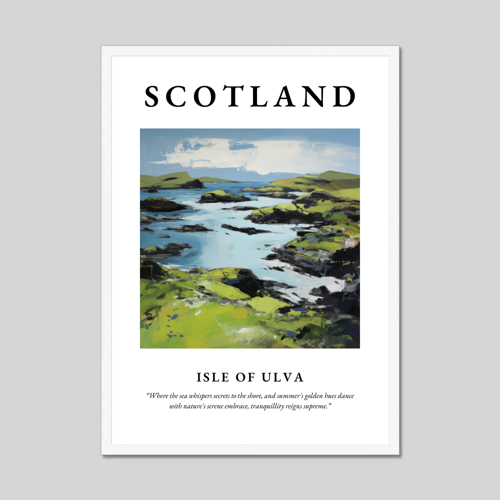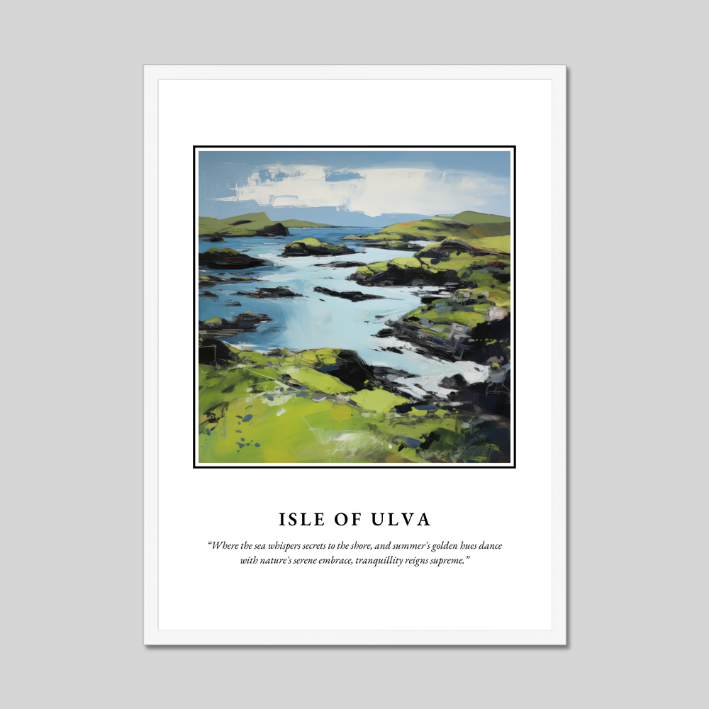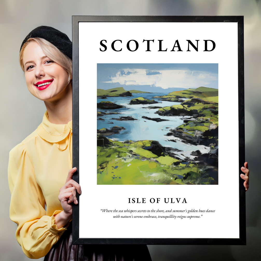 In this poster, the painting reflects the island's enchanting allure, making it a perfect memento for those who have wandered its shores or dreamt of its beauty. Whether you hold a cherished memory of visiting Ulva or simply wish to invite a piece of Scotland’s magic into your home, this expressive work of art will transport you to a place where serenity and grandeur coexist.