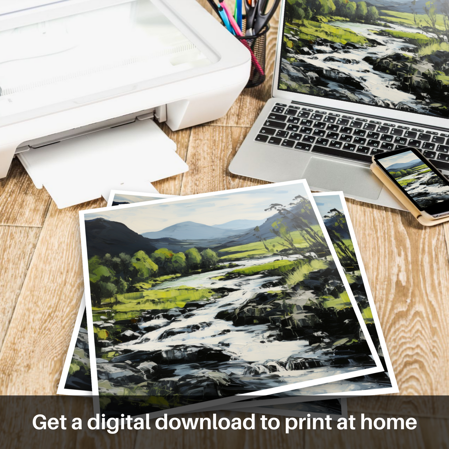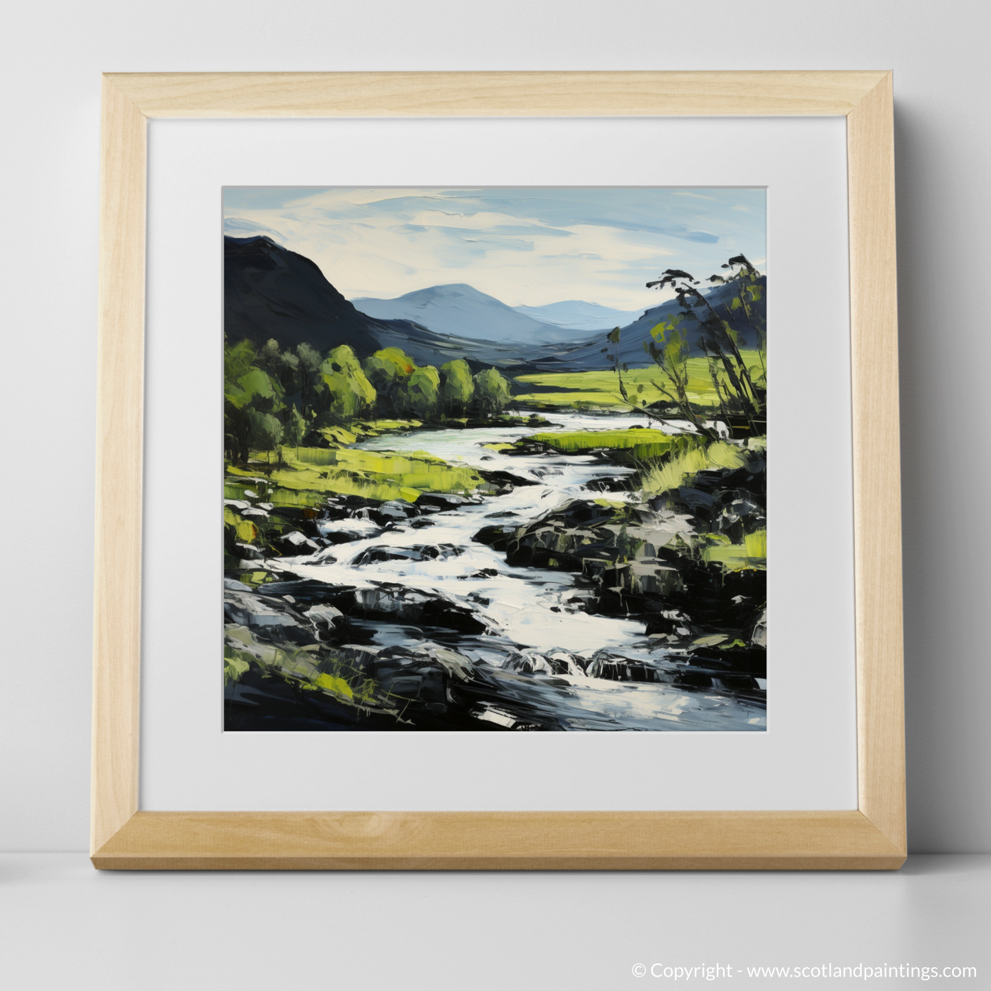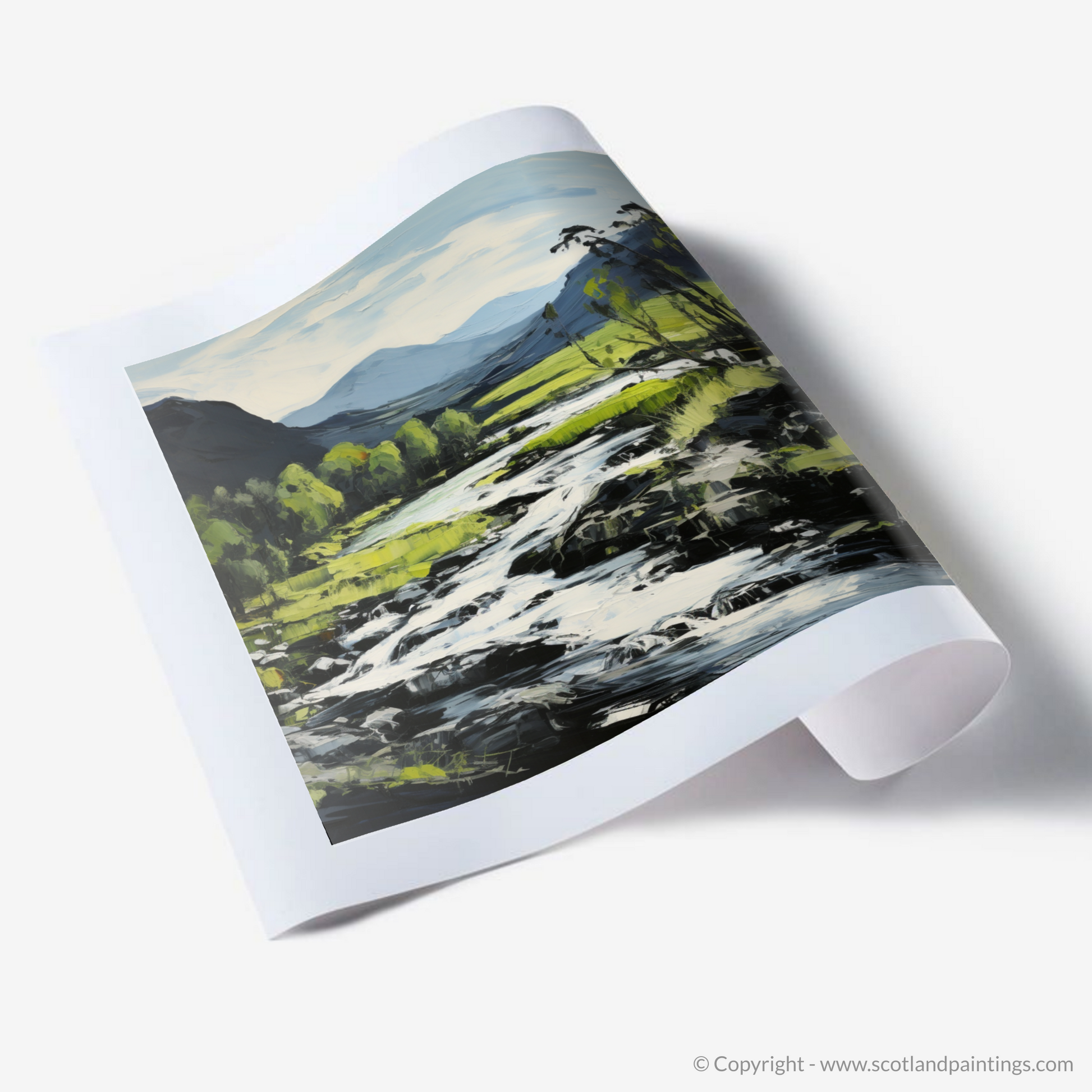 Capturing the untamed beauty of Scotland's natural landscapes, this vibrant print is a visual homage to the River Garry as it meanders through the lush Scottish Highlands on a bright summer day. The dynamic brushstrokes characteristic of Expressionism inject a sense of movement in the flowing water, creating a lively contrast to the serene backdrop. A rich palette of greens highlights the verdancy of the summer foliage, whilst bold whites and deep blues depict the sparkling cascades of the river as it tumbles over rocky crags. Dark, earthy tones provide a grounding effect, underscoring the ruggedness of the Highlands terrain.