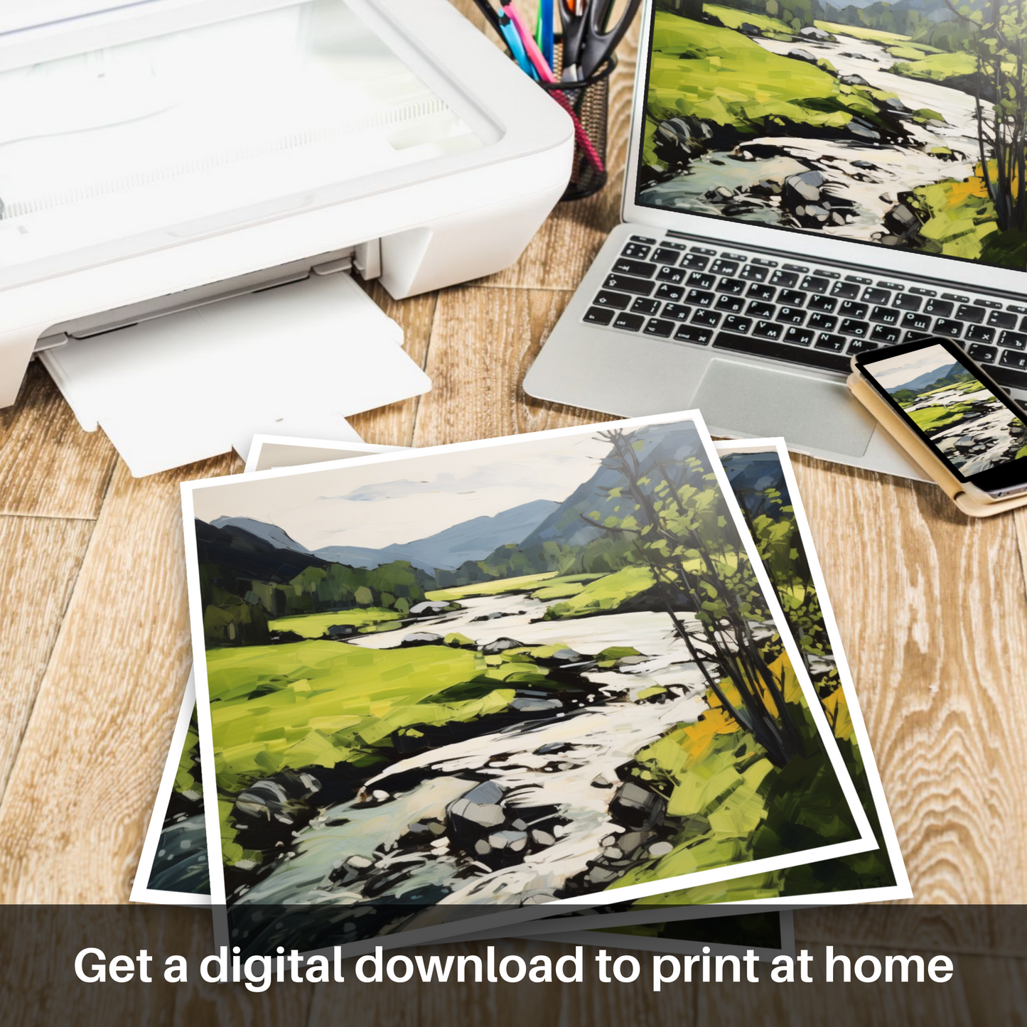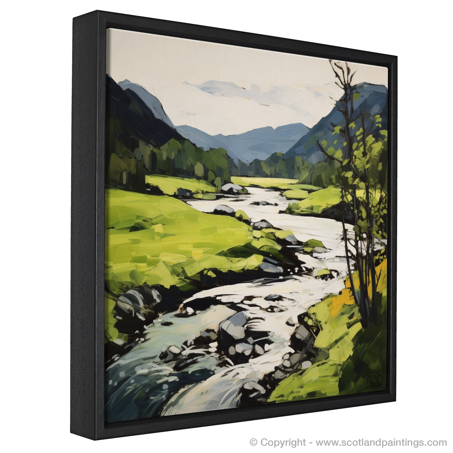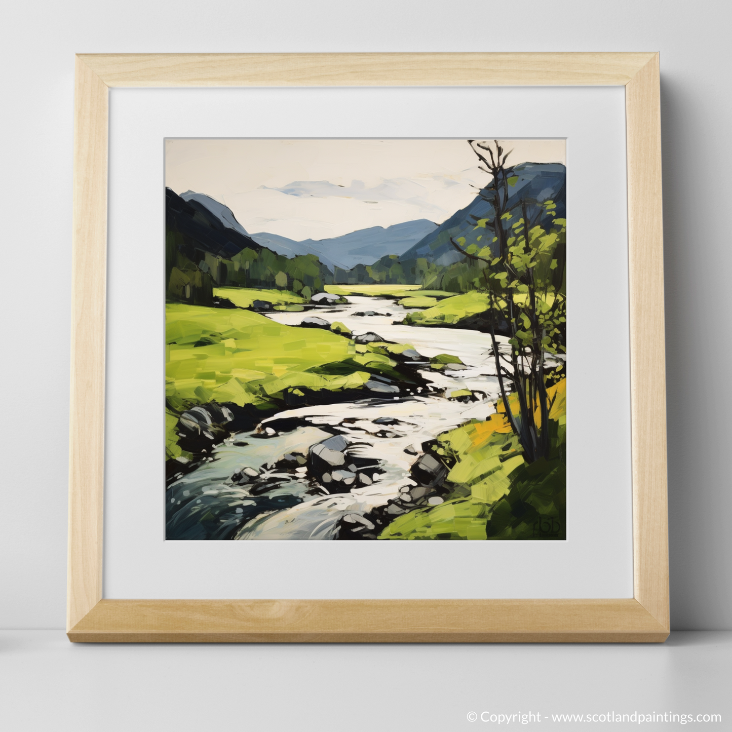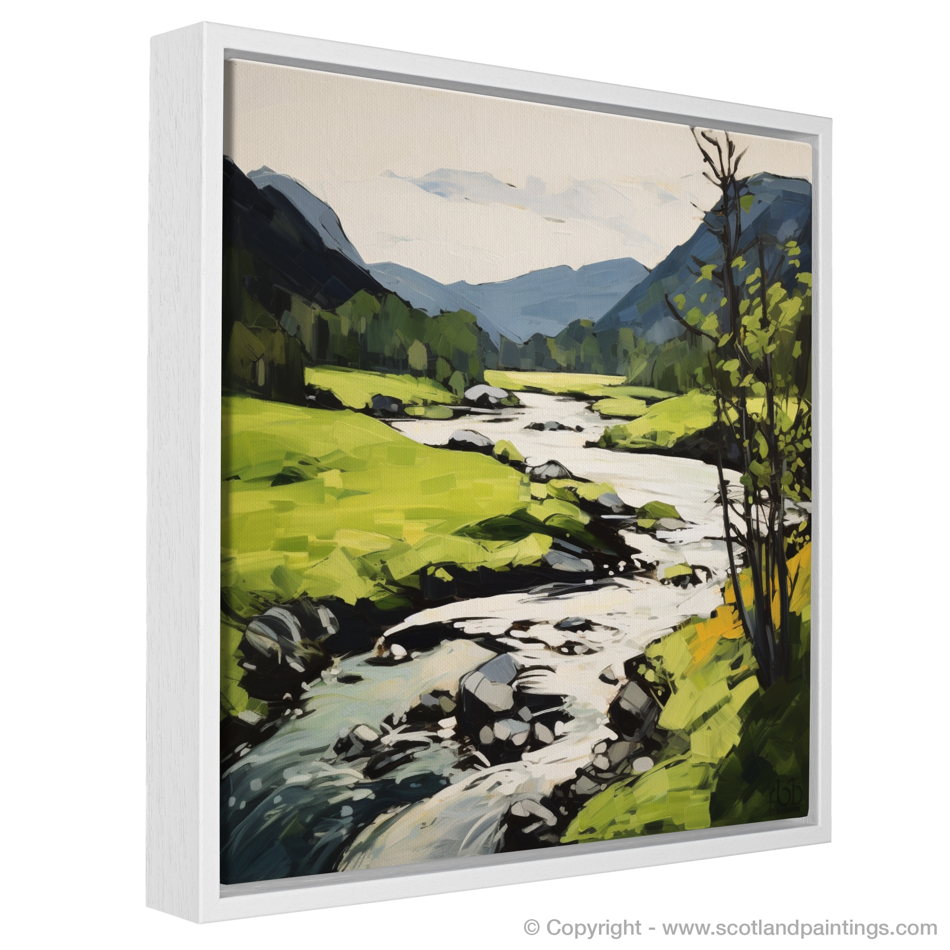 In this work, the artist has embraced a palette dominated by a lush array of greens, reflecting the vigorous life of the Highland summer. Bold, dynamic brushstrokes bring a sense of movement to the scene, suggesting the gentle flow of the river and the soft sway of foliage in a warm breeze.