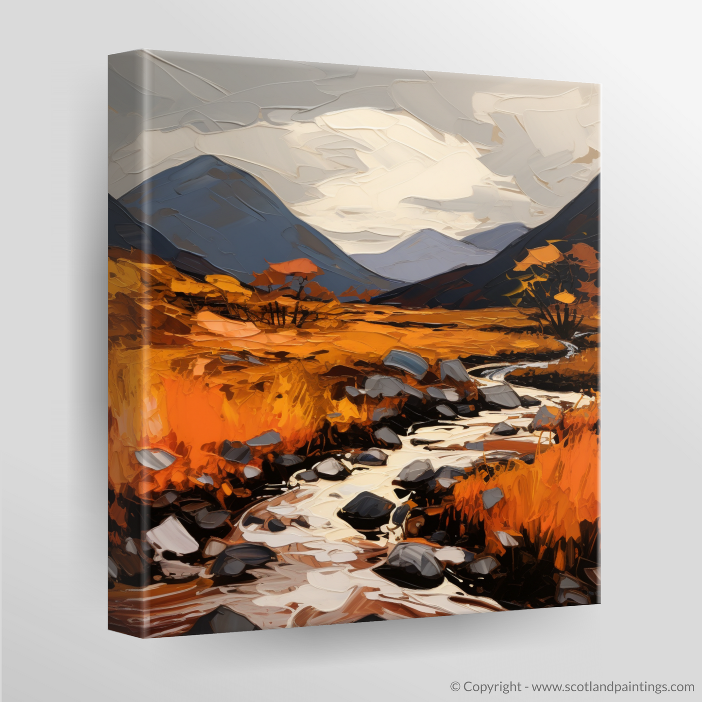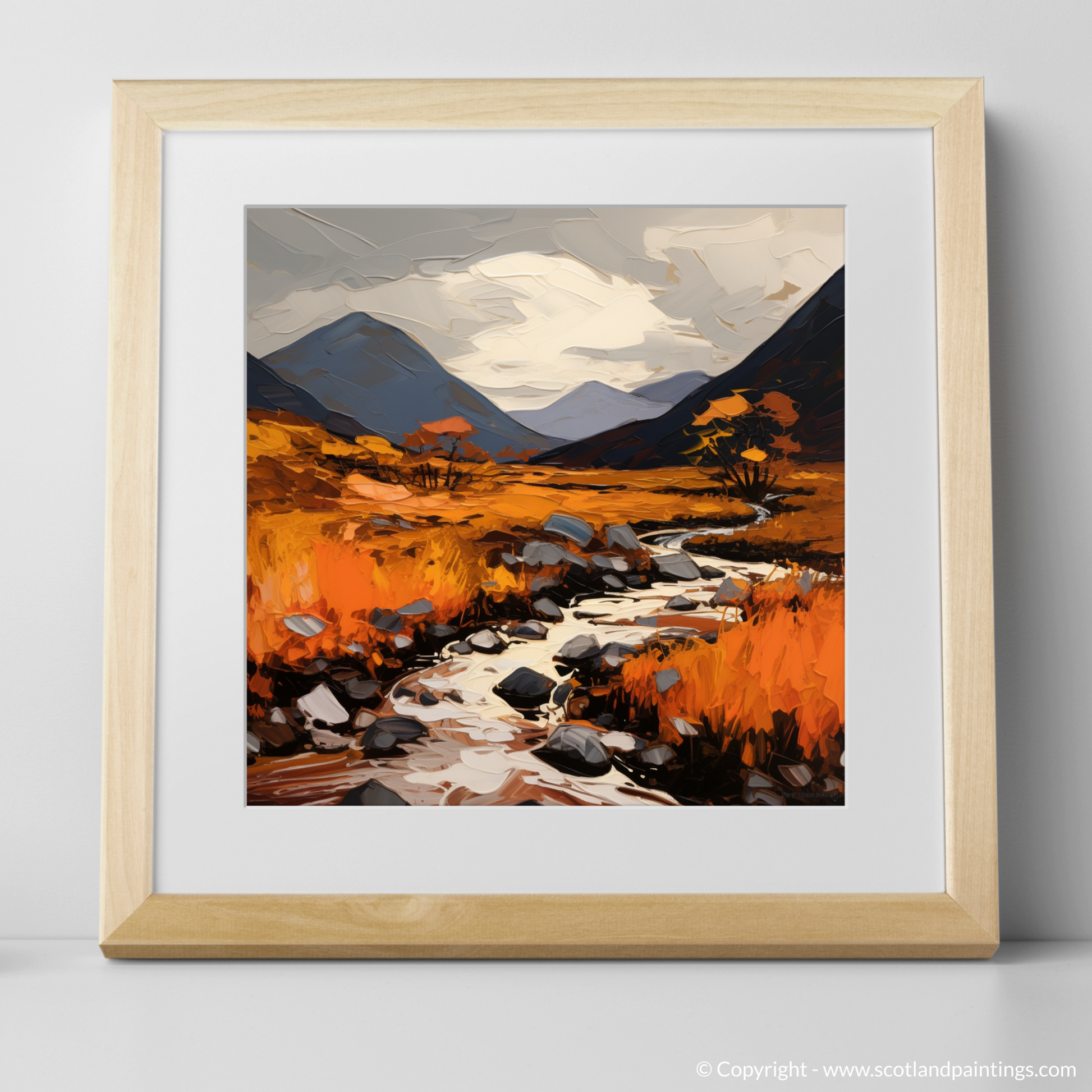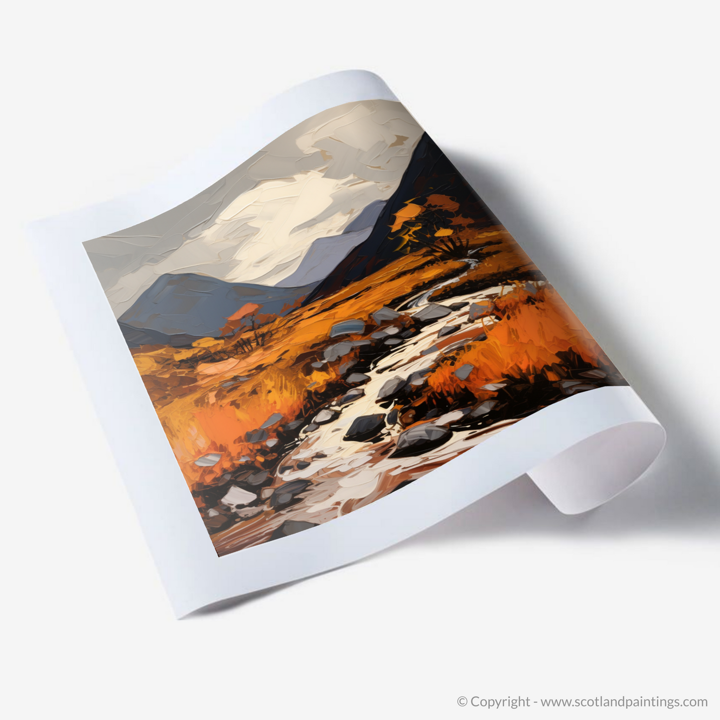Each brushstroke contributes to the overall effect of movement and transformation, suggesting the fleeting nature of the season, as though the landscape is alight with the last burst of life before winter's grasp. This print is sure to be a conversation starter, an evocative piece that brings the wild beauty of Glencoe into any space it adorns.