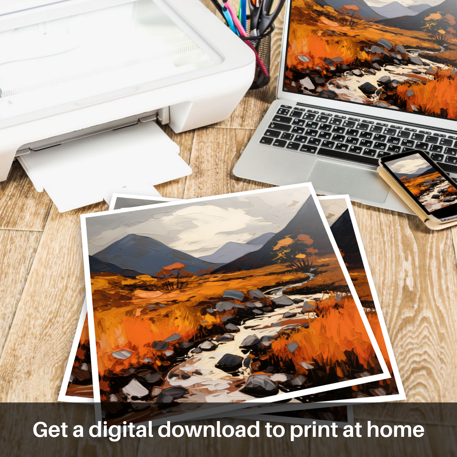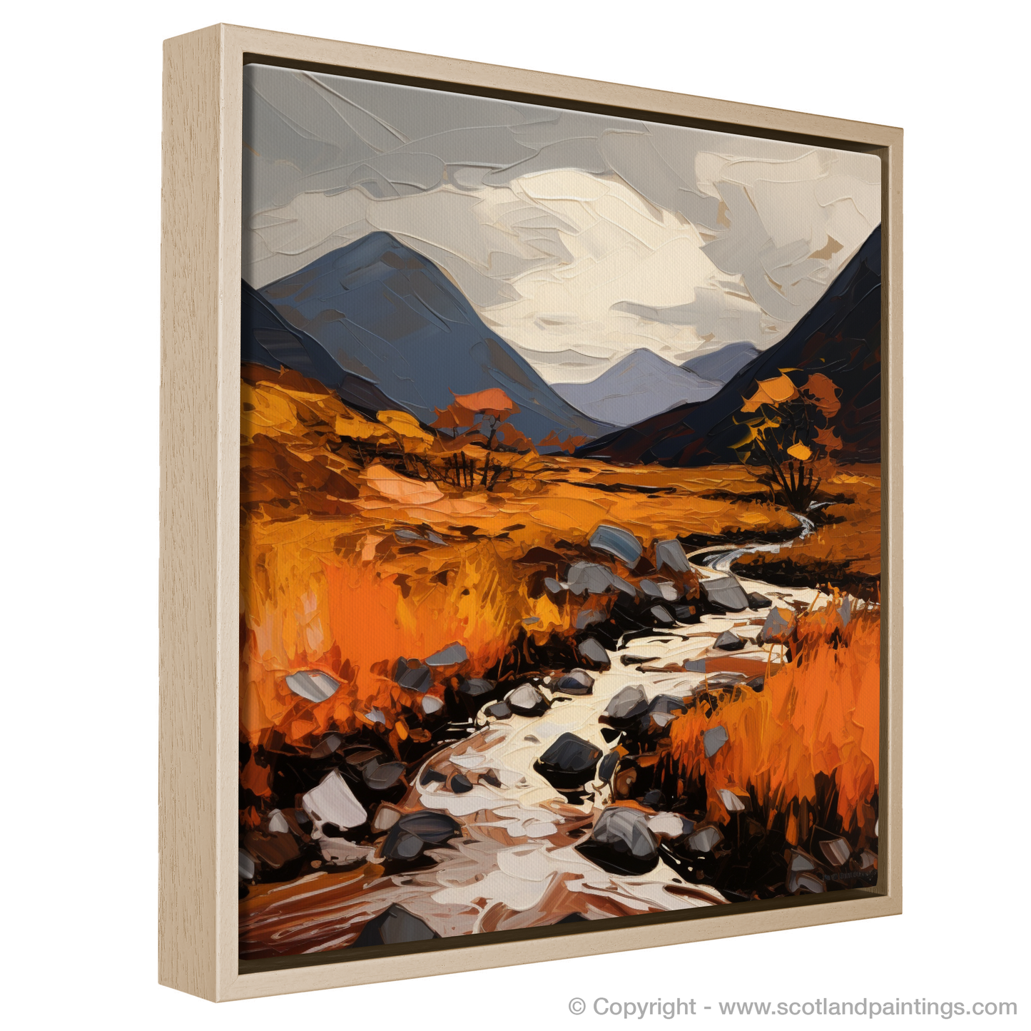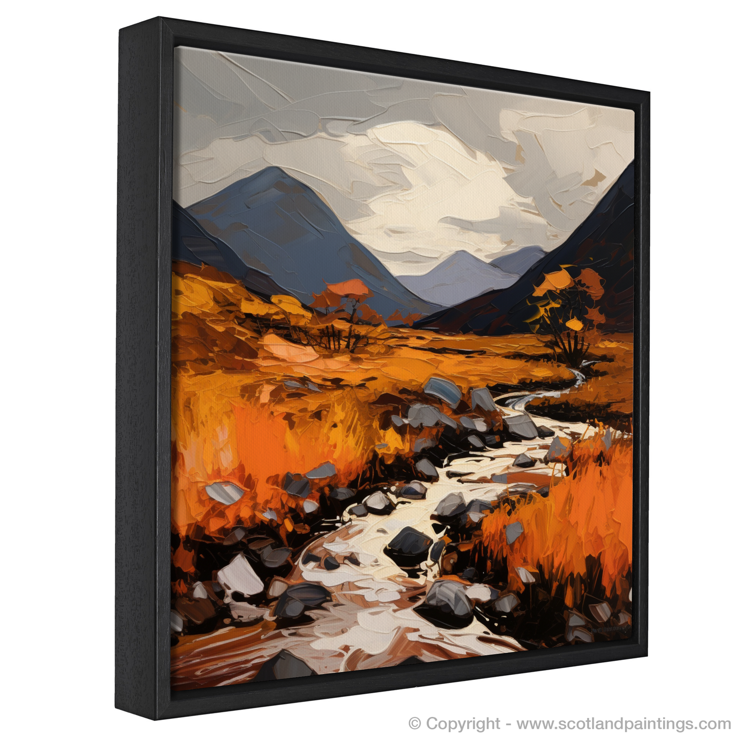 Each brushstroke contributes to the overall effect of movement and transformation, suggesting the fleeting nature of the season, as though the landscape is alight with the last burst of life before winter's grasp. This print is sure to be a conversation starter, an evocative piece that brings the wild beauty of Glencoe into any space it adorns.