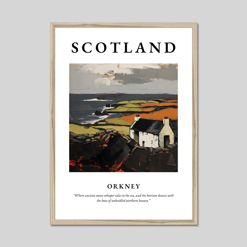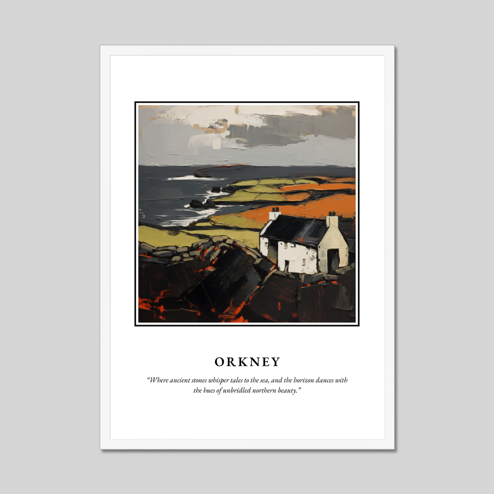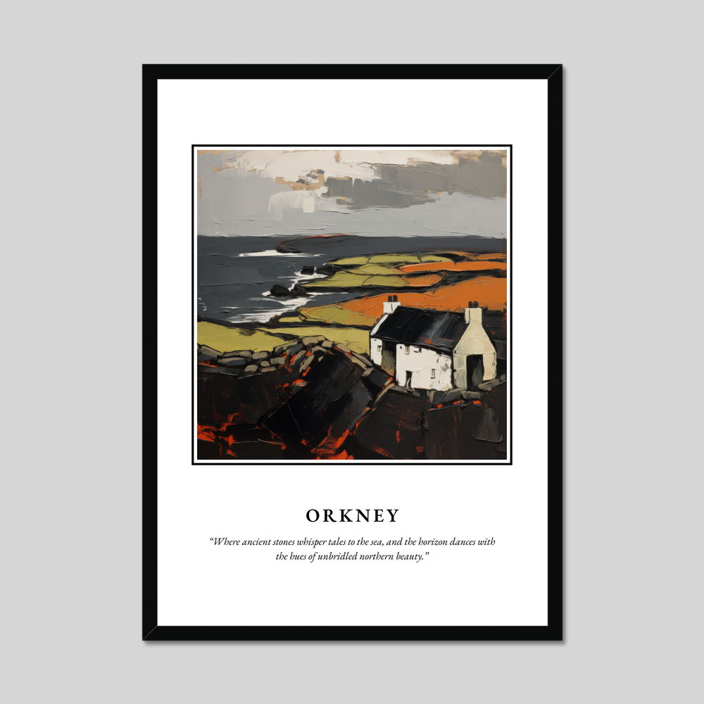 Available in a choice of black, white, or natural wood-effect frames, this poster complements any decor, offering a glimpse into the serene vistas where land meets the sea. The evocative quote below the painting reads, "Where ancient stones whisper tales to the sea, and the horizon dances with the hues of unbridled northern beauty.” Every glance at this print is a reminder of serene shores and rolling waves, perfect for art lovers and those who hold Orkney close to their hearts.