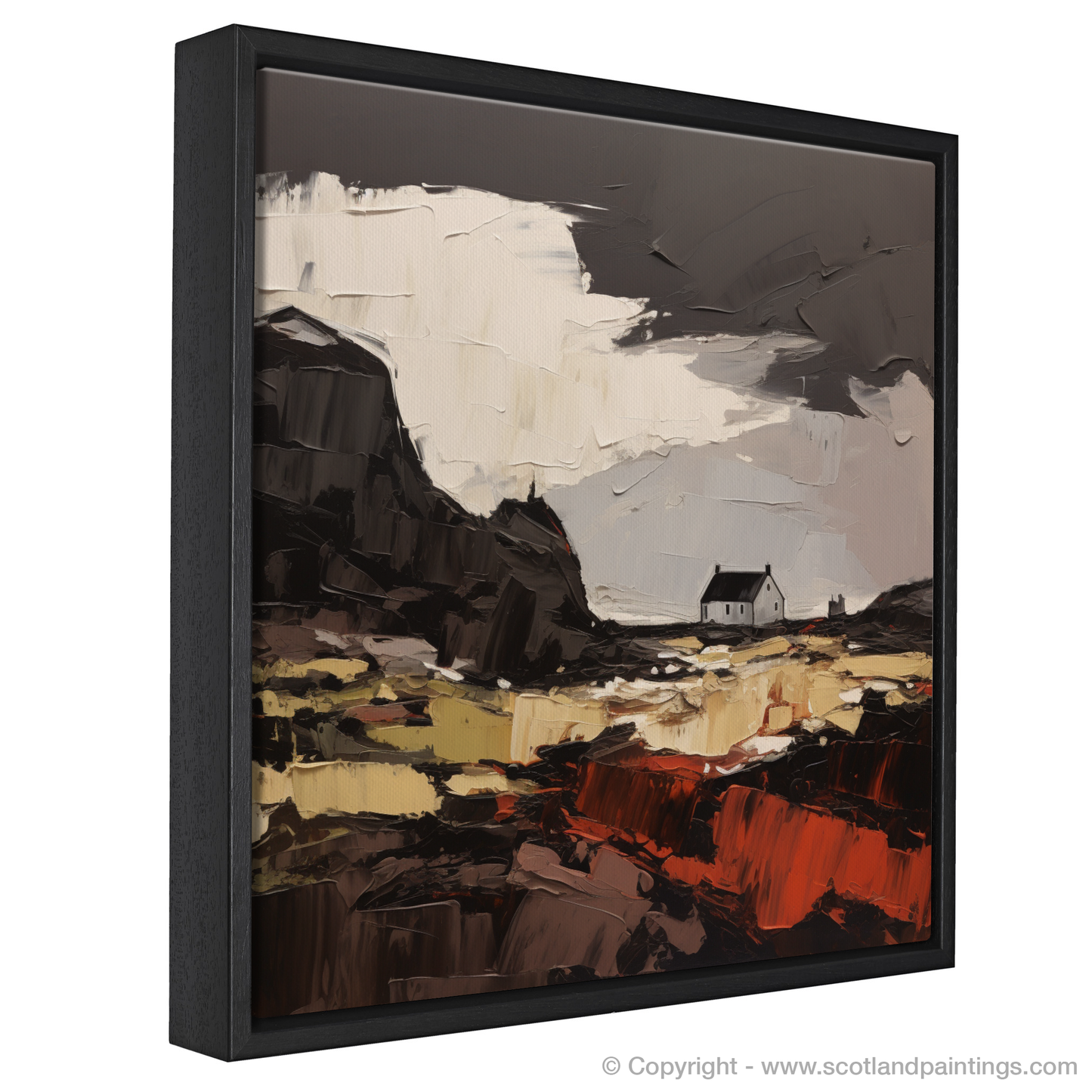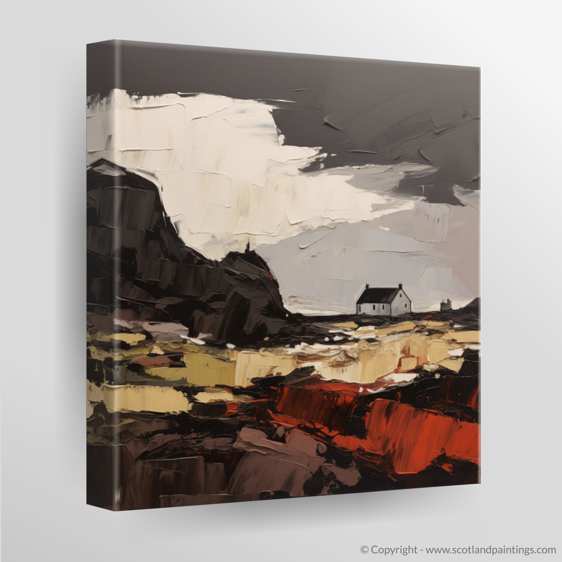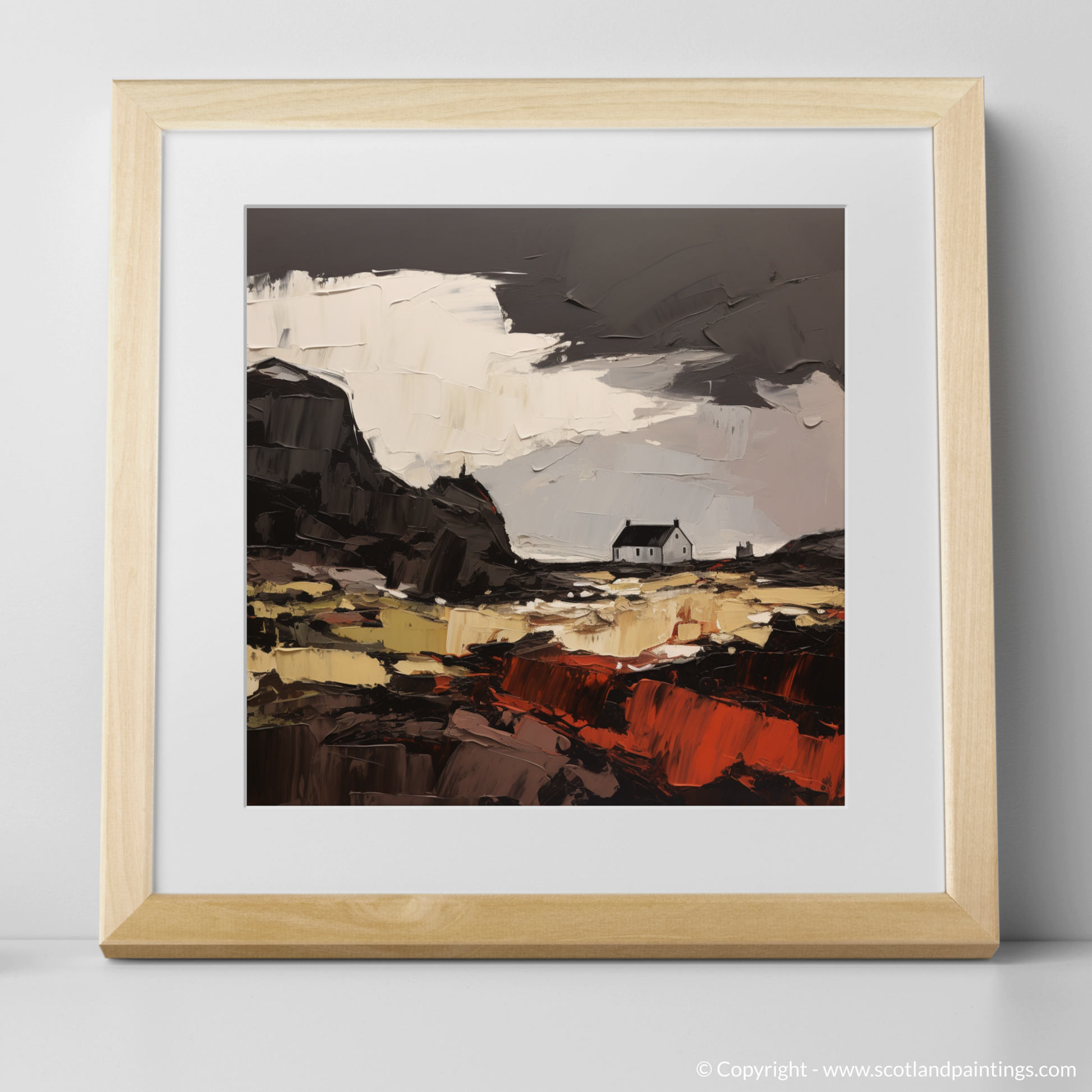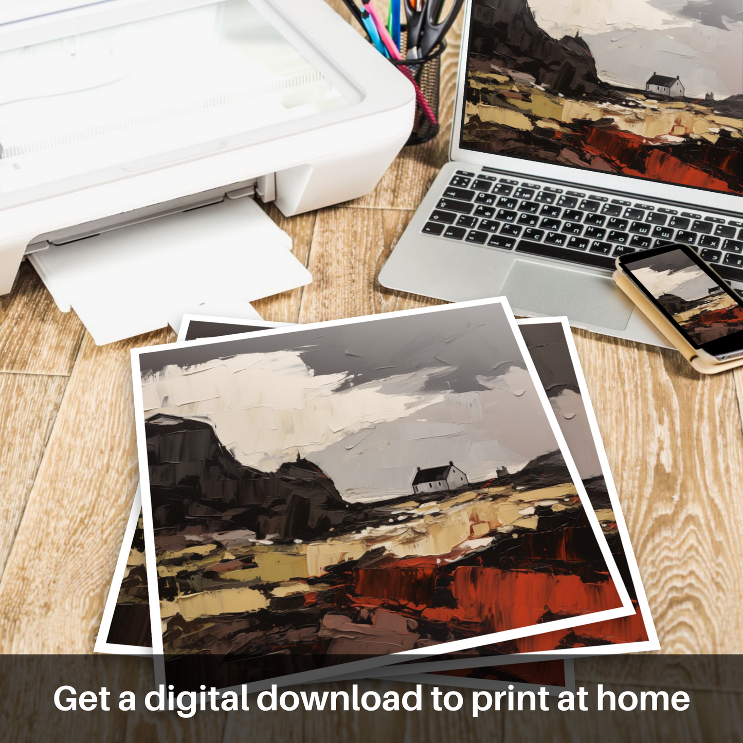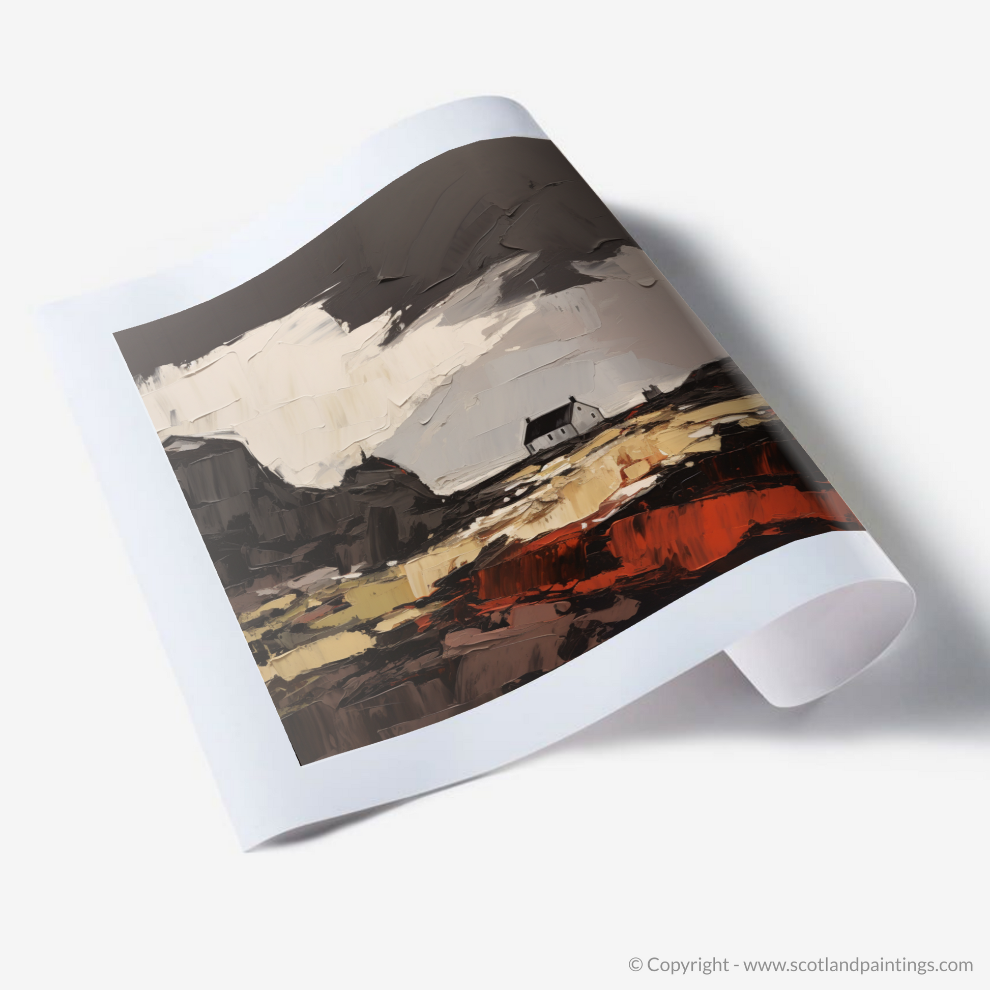 Captivating and evocative, this expressive artwork highlights the rugged majesty of Càrn Mairg, one of Scotland's esteemed Munros. Bold, impulsive brushstrokes and a rich, earthen palette of deep browns, umbers, and rustic reds convey the untamed beauty of the Highlands. Juxtaposed against the brooding sky, swathed in shades of smoky grey and pure white, the artwork conjures the dynamic and changeable weather typical of the region.