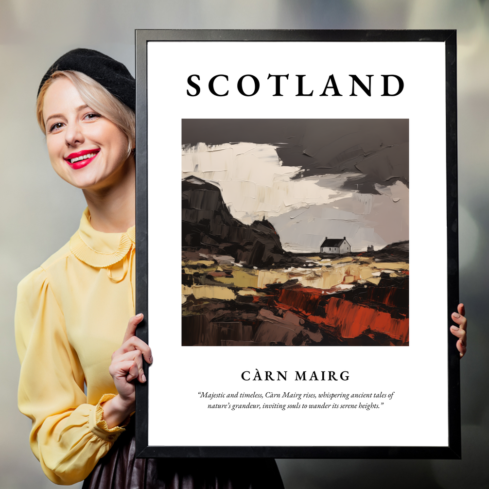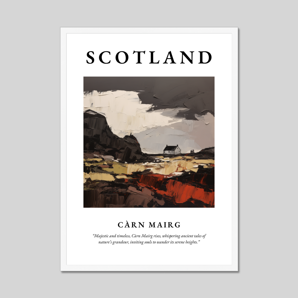 The poster features the bold inscription "SCOTLAND" at the top, evoking a sense of national pride and allure. Below, a breathtaking Expressionist painting of Càrn Mairg captures the mountain's timeless spirit. The artwork, characterised by its bold brushstrokes and dynamic contrasts, beautifully portrays the rugged terrain against dramatic skies, conveying a sense of movement and emotion that invites prolonged contemplation. Beneath the painting, the evocative quote: “Majestic and timeless, Càrn Mairg rises, whispering ancient tales of nature’s grandeur, inviting souls to wander its serene heights,” adds an extra layer of depth and meaning.