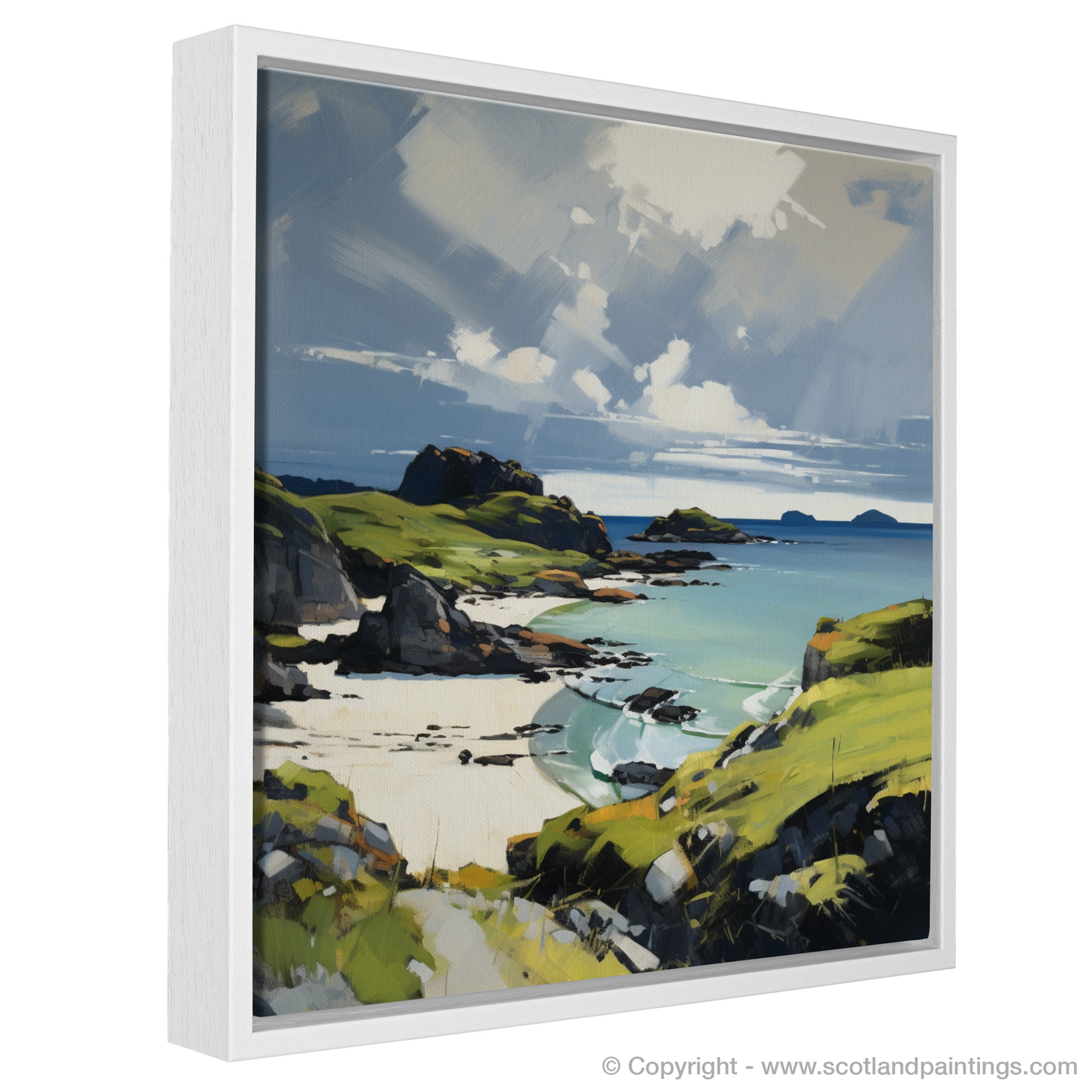 Capturing the wild, untamed beauty of Achmelvich Bay, Sutherland, this exquisite expressionist print invites the onlooker to explore the rugged charm of Scotland's coastline. Dynamic brushstrokes depict a vivacious sky, where swirls of grey and white clouds compete for dominance, hinting at the capricious weather known to caress these northern shores.