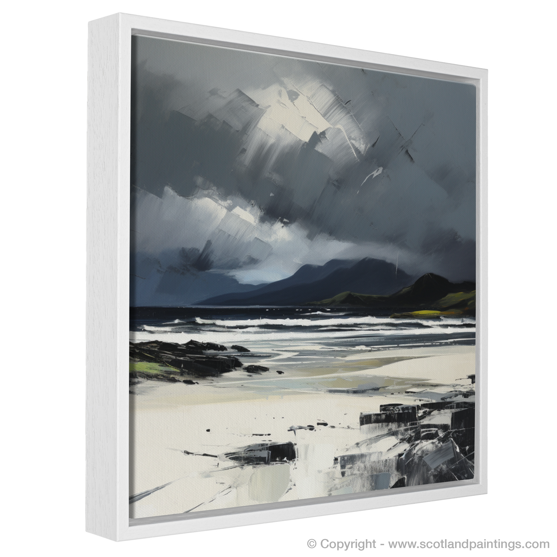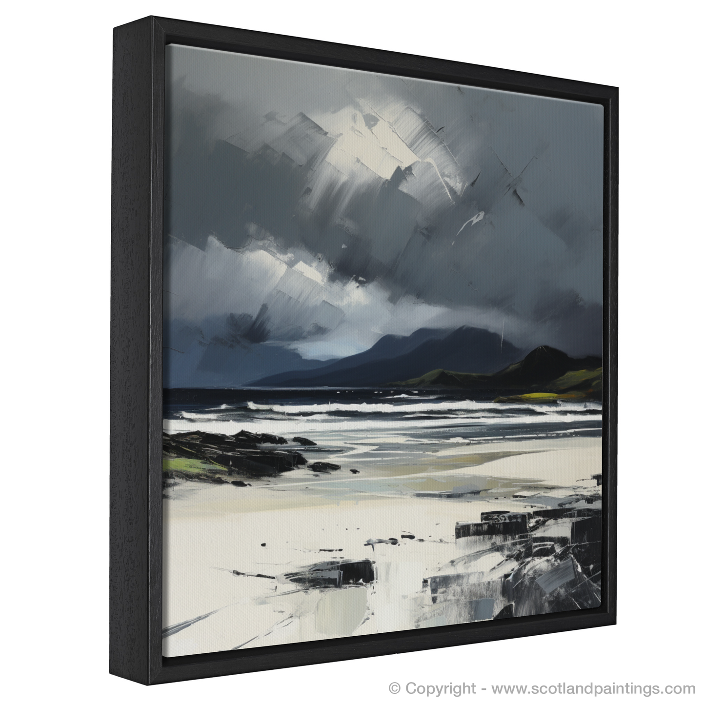 Captured with an impassioned swathe of the brush, this evocative print brings the turbulent beauty of Camusdarach Beach to your space. The dynamic and moody skies, rendered in dramatic greys and whites, swirl above the serene, undulating hills of the Hebrides, their form shrouded in the mystery of a shadowy palette. Amidst this stormy backdrop, the beach reveals itself in a stark contrast of opalescent sands, bounded by dark, brooding rocks that anchor the scene with their weighty presence.