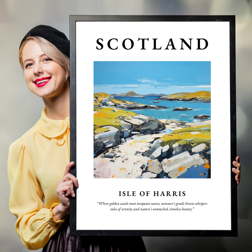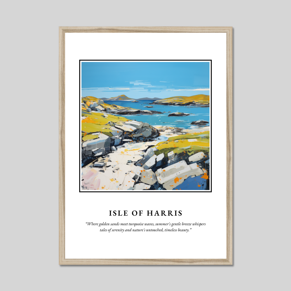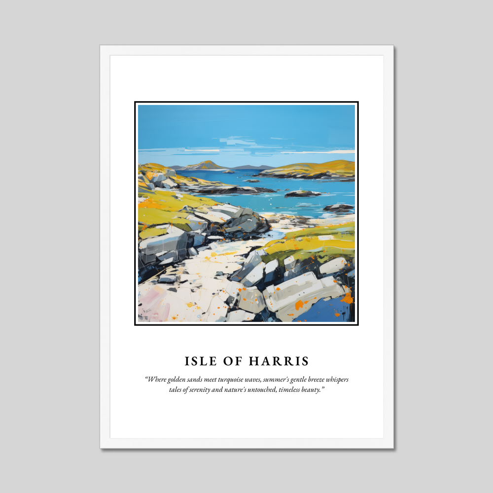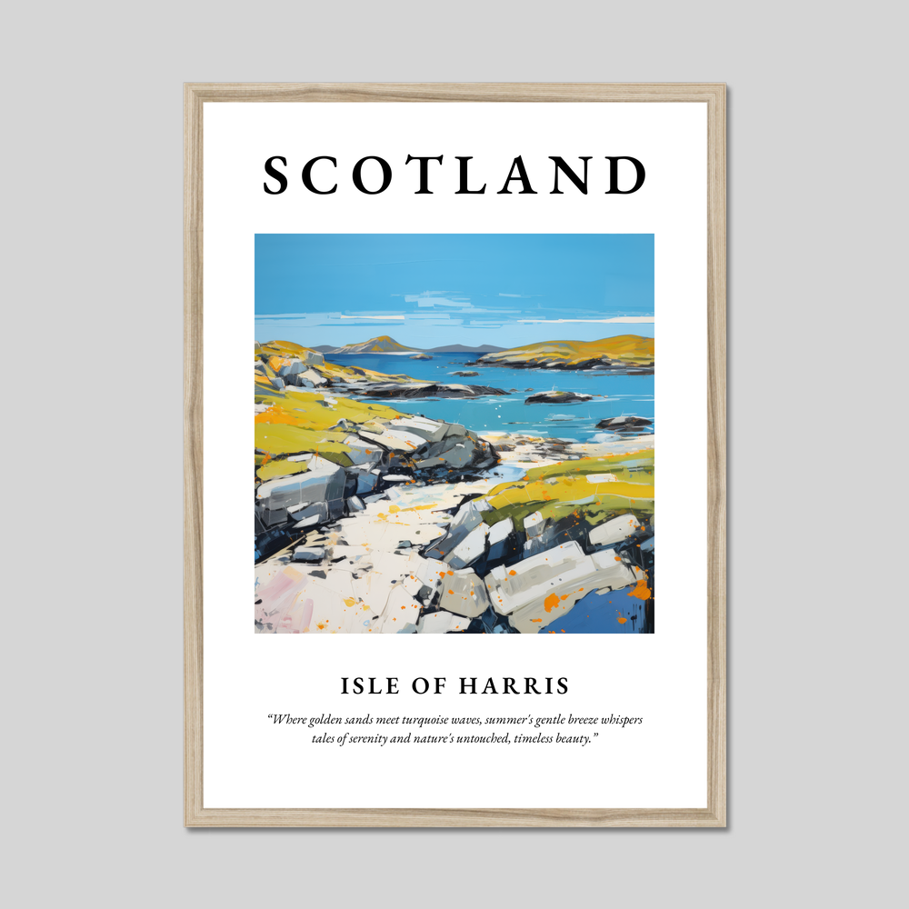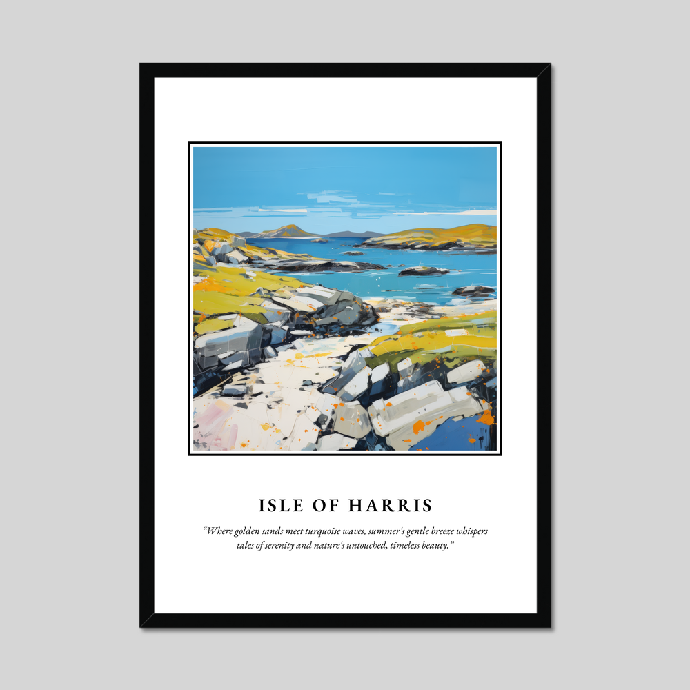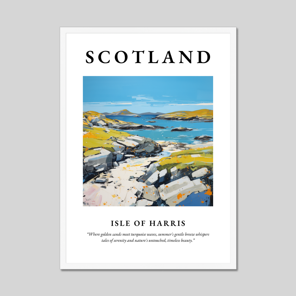 Visitors to Harris are often captivated by its unique blend of landscapes, from sweeping beaches to rolling hills. Known for its tranquillity and rich wildlife, the isle is a haven for those seeking both adventure and peace. This framed poster print not only celebrates the scenic charm of Harris but also invites you to imagine the gentle breezes and whispering tales that have echoed across its shores for centuries. Let this artistic tribute transform your space into a haven of beauty and inspiration.