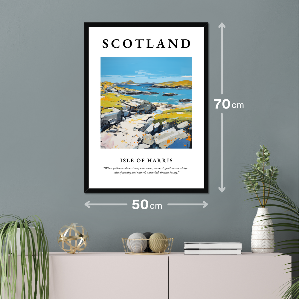 Introducing a stunning addition to your wall decor that invites the serene beauty of the Scottish Isles into your living space. Our large, 50cm x 70cm framed poster print showcases the captivating allure of the Isle of Harris, a paradise where golden sands meet turquoise waves. With "SCOTLAND" emblazoned in bold letters at the top, this piece promises to be a striking focal point, available in your choice of black, white, or natural wood-effect frames.