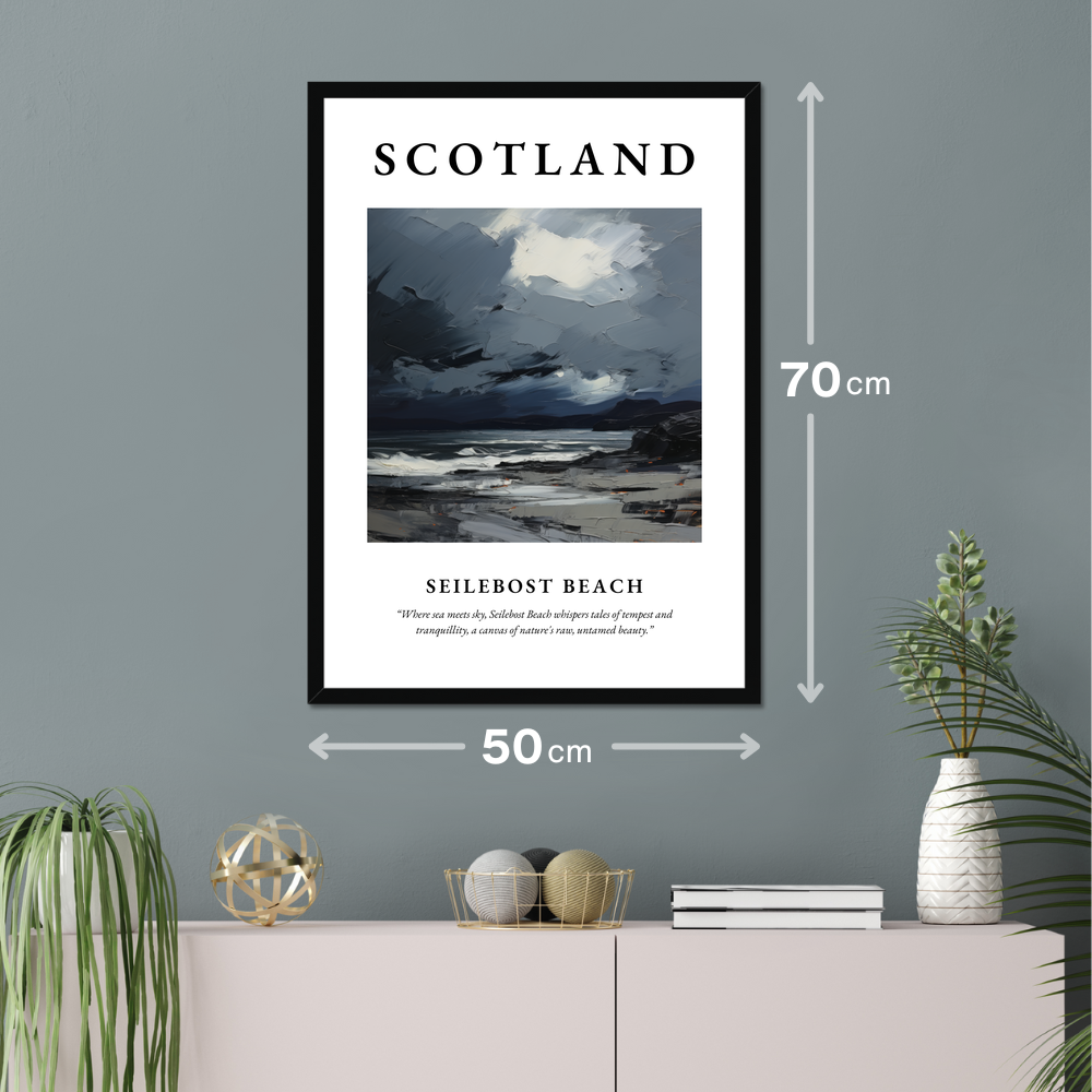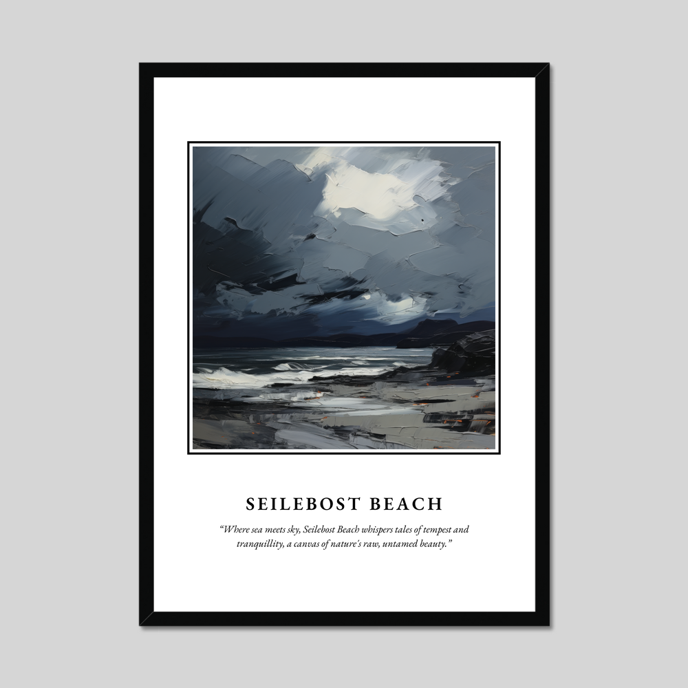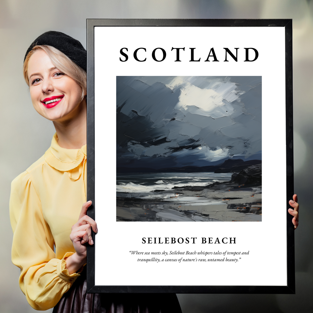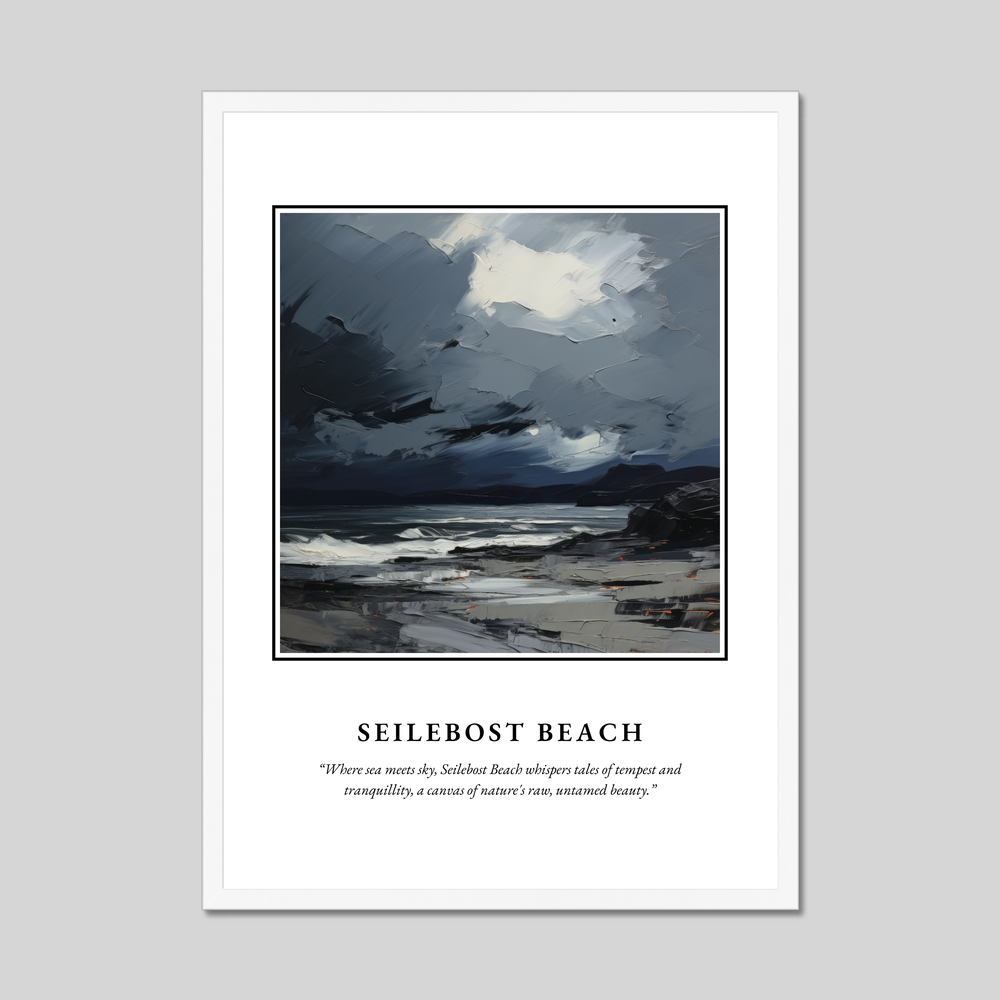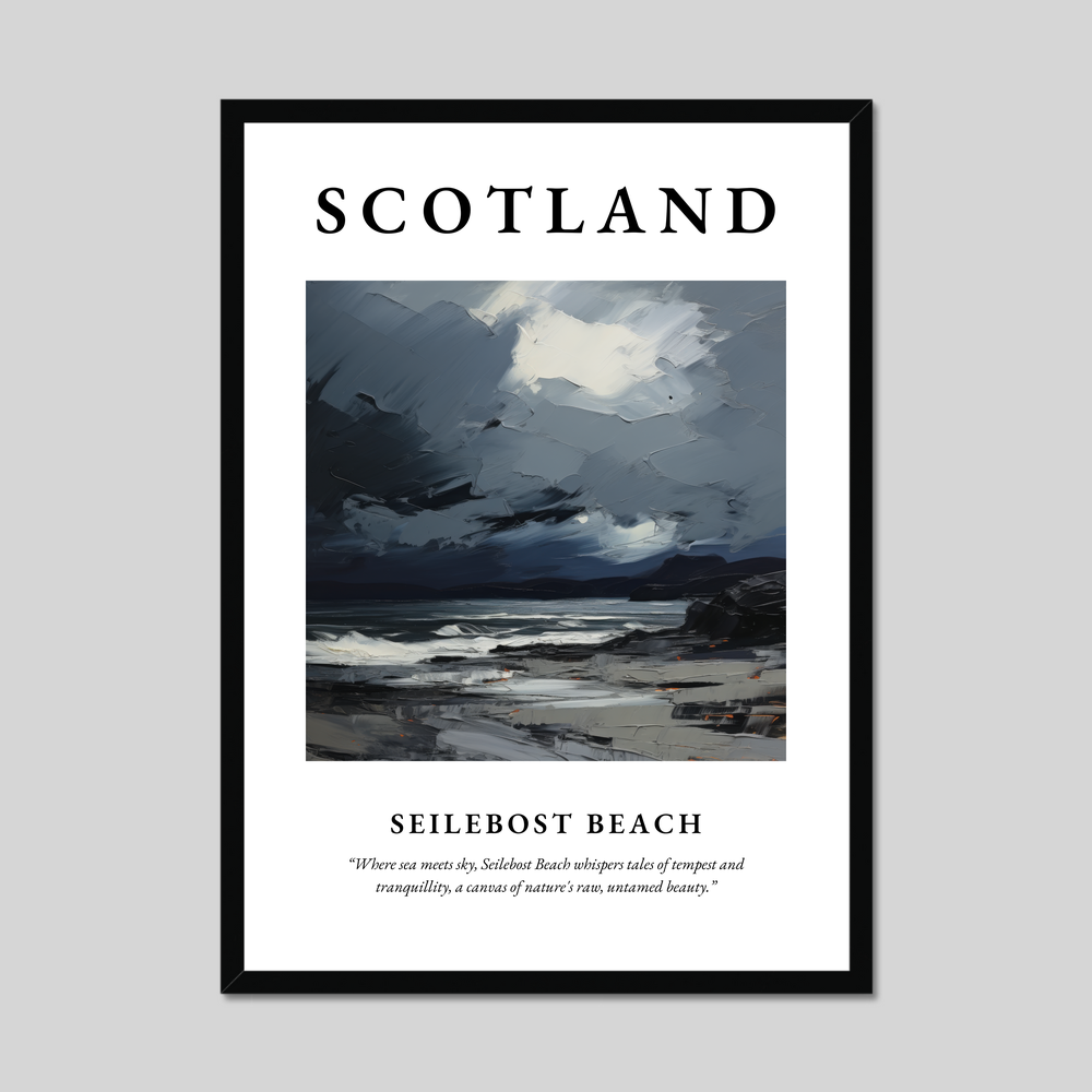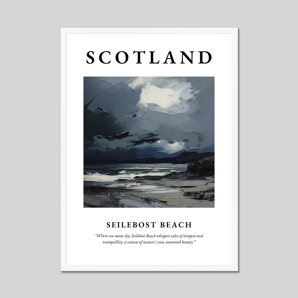 Transport yourself to the wild, majestic coastlines of Scotland with our stunning framed poster print, measuring an impressive 50cm x 70cm. This captivating piece from our “Scottish Beaches” collection features a vibrant expressionist depiction of Seilebost Beach, where every brushstroke captures the untamed beauty and mood of this iconic location. The poster boldly announces “SCOTLAND” at the top, inviting viewers into a world of stellar landscapes and rugged allure. Beneath the evocative painting, the words “Where sea meets sky, Seilebost Beach whispers tales of tempest and tranquillity, a canvas of nature's raw, untamed beauty” beckon you to explore its depths.