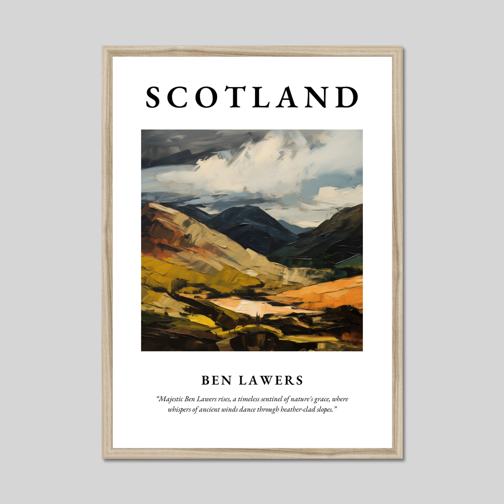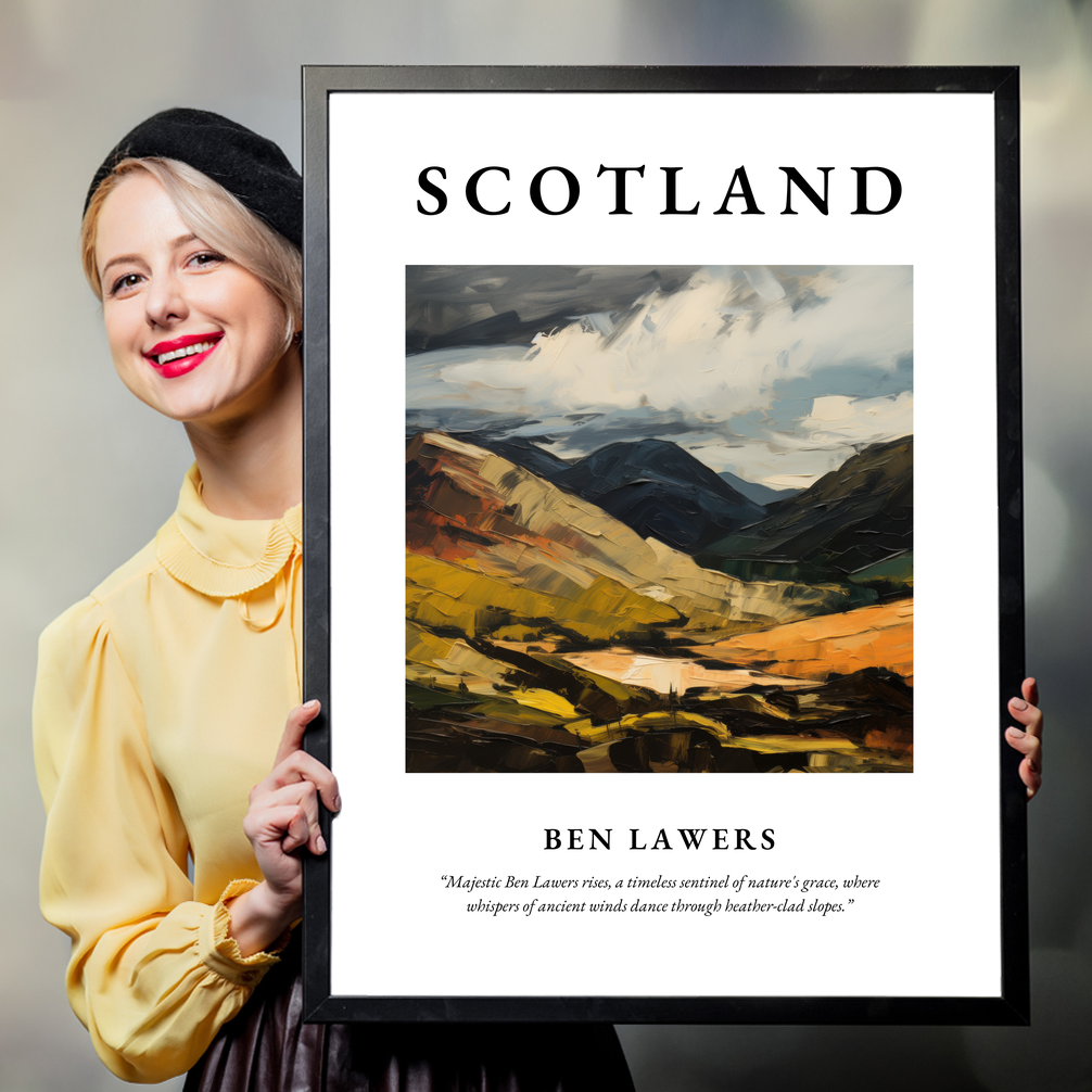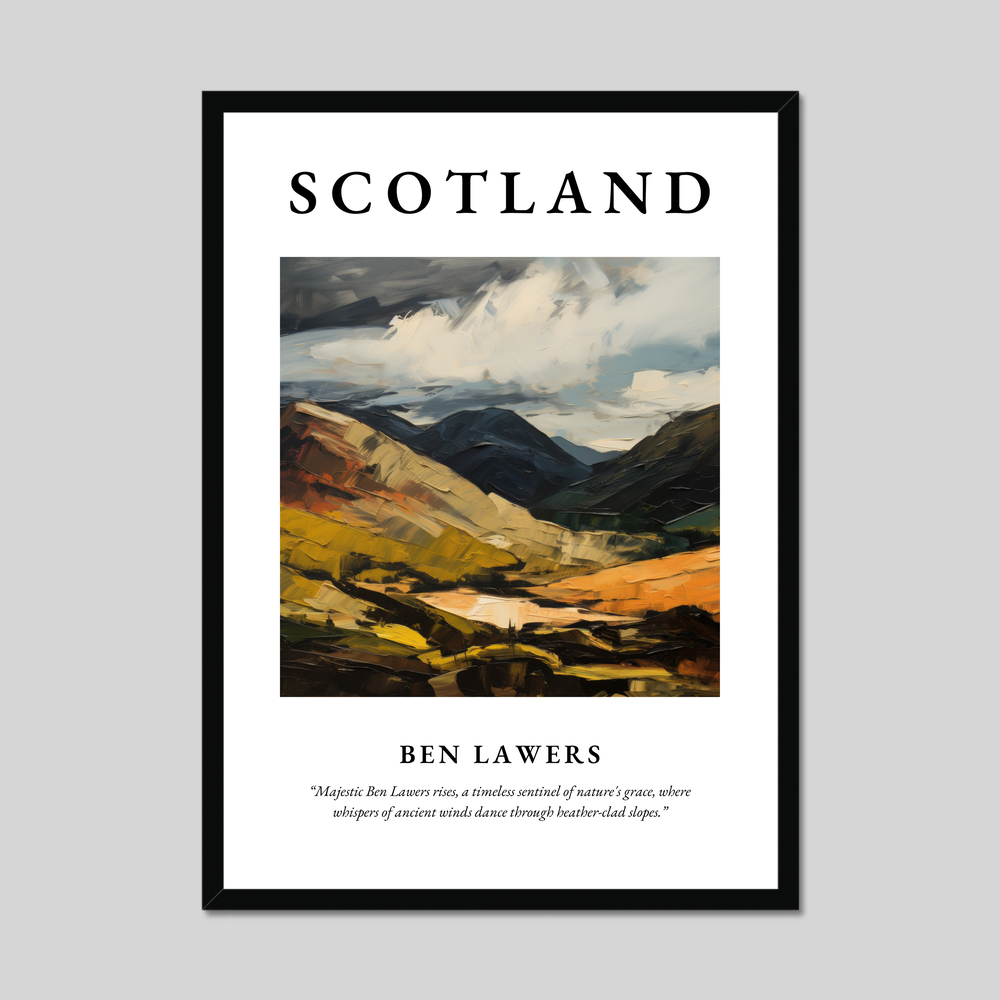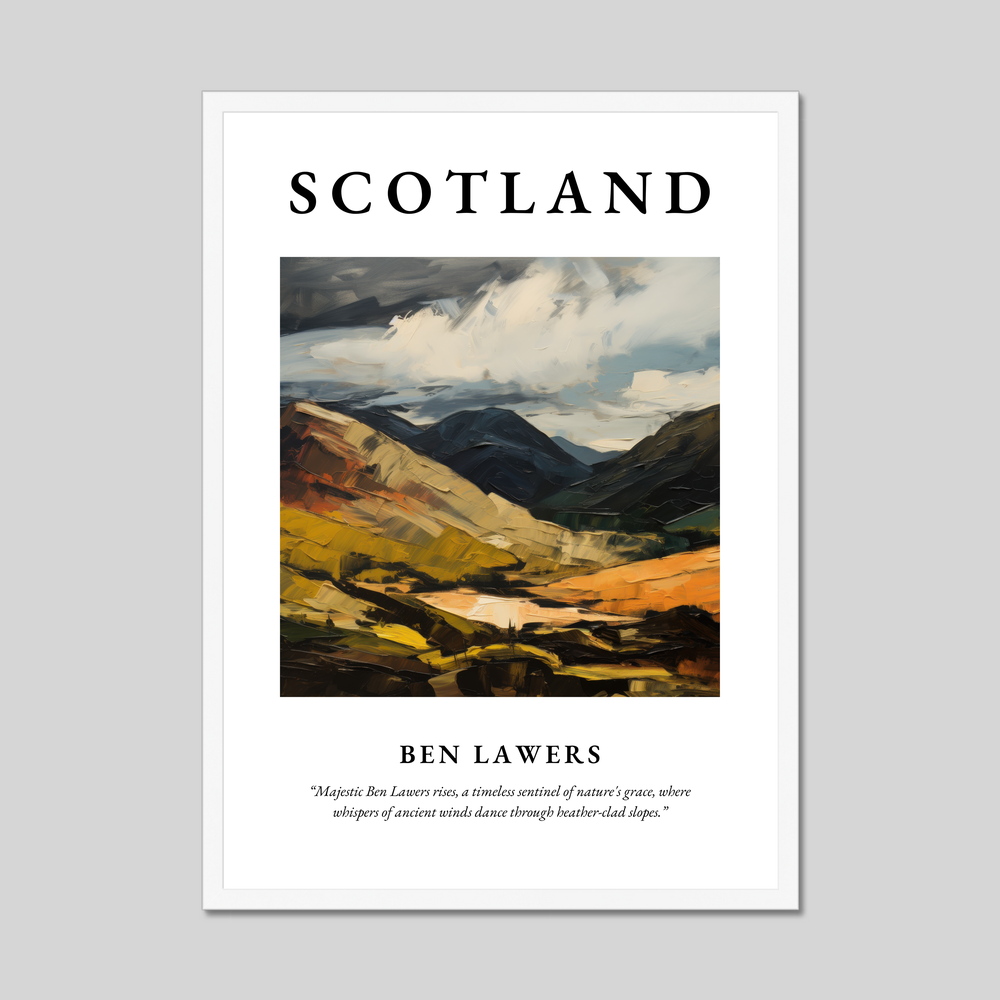 The poster's layout begins with "SCOTLAND" emblazoned across the top in bold lettering, immediately transporting your thoughts to the dramatic landscapes of this historic nation. Below, a dynamic painting of Ben Lawers bursts forth with vibrant colours and bold brushstrokes that define the Expressionism style. This artwork captures the ever-changing moods of the mountain, with sweeping, textured strokes of russet brown, deep green, and golden hues, invoking a sense of movement and emotion. Beneath the painting, a poignant quote whispers the magic of the landscape: "Majestic Ben Lawers rises, a timeless sentinel of nature's grace, where whispers of ancient winds dance through heather-clad slopes."