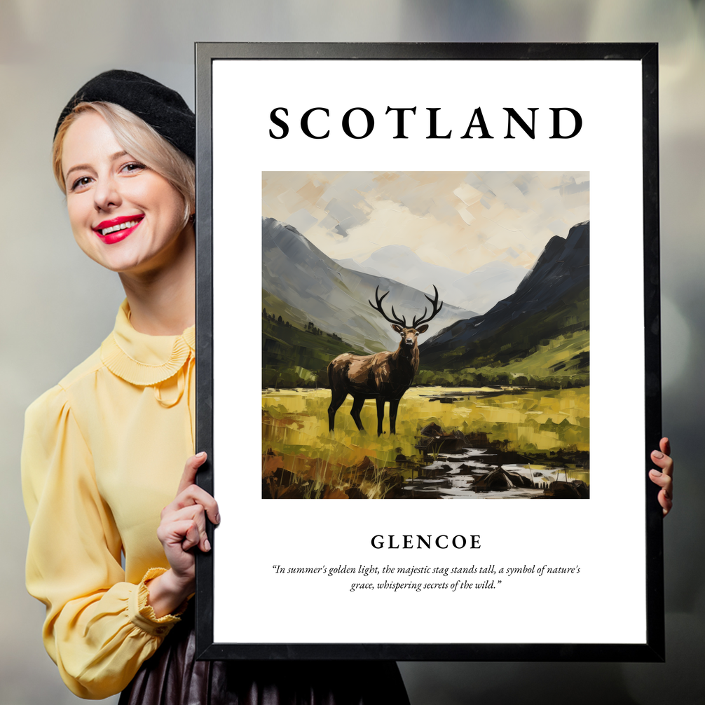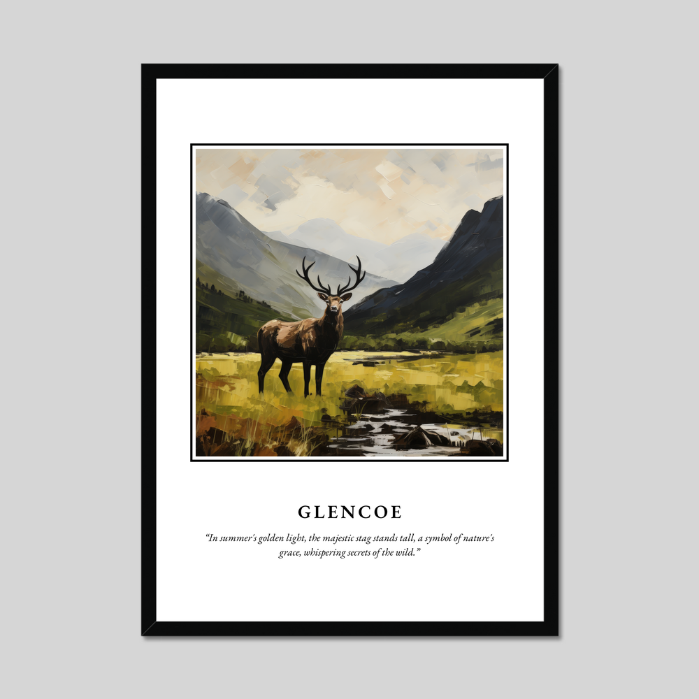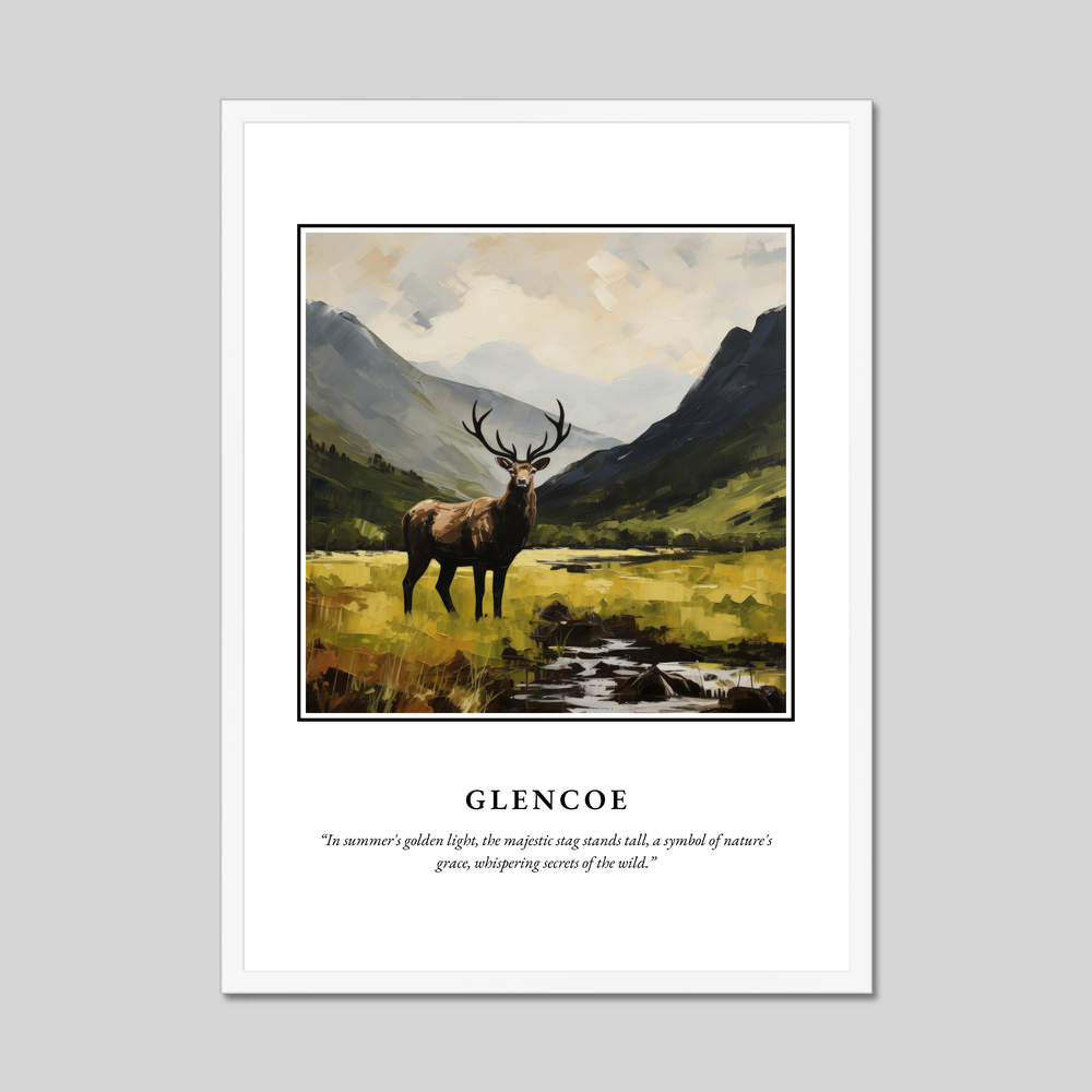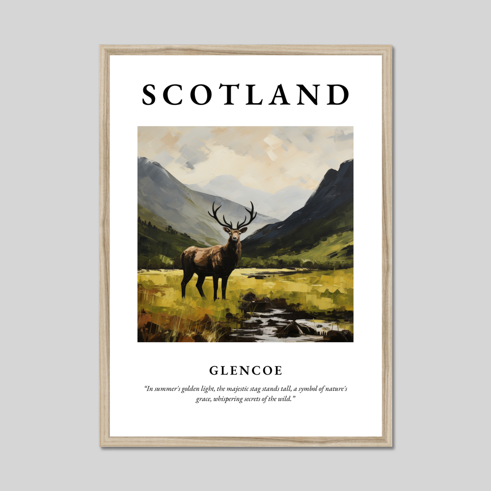 Immerse yourself in the enchanting landscape of Scotland with our striking framed poster print, a timeless tribute to the beauty of Glencoe. Measuring an impressive 50cm x 70cm, this large artwork is an affordable way to make a statement in any room, capturing the splendour of the Scottish Highlands with a dynamic touch of Expressionism. The poster is topped with “SCOTLAND” in bold lettering, anchoring a vivid painting of Glencoe beneath. A gentle reminder of nature's poetry accompanies the scene: “In summer's golden light, the majestic stag stands tall, a symbol of nature's grace, whispering secrets of the wild.”