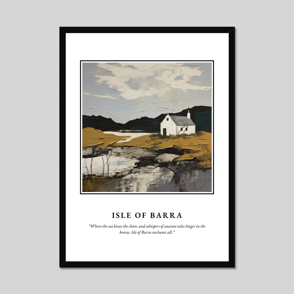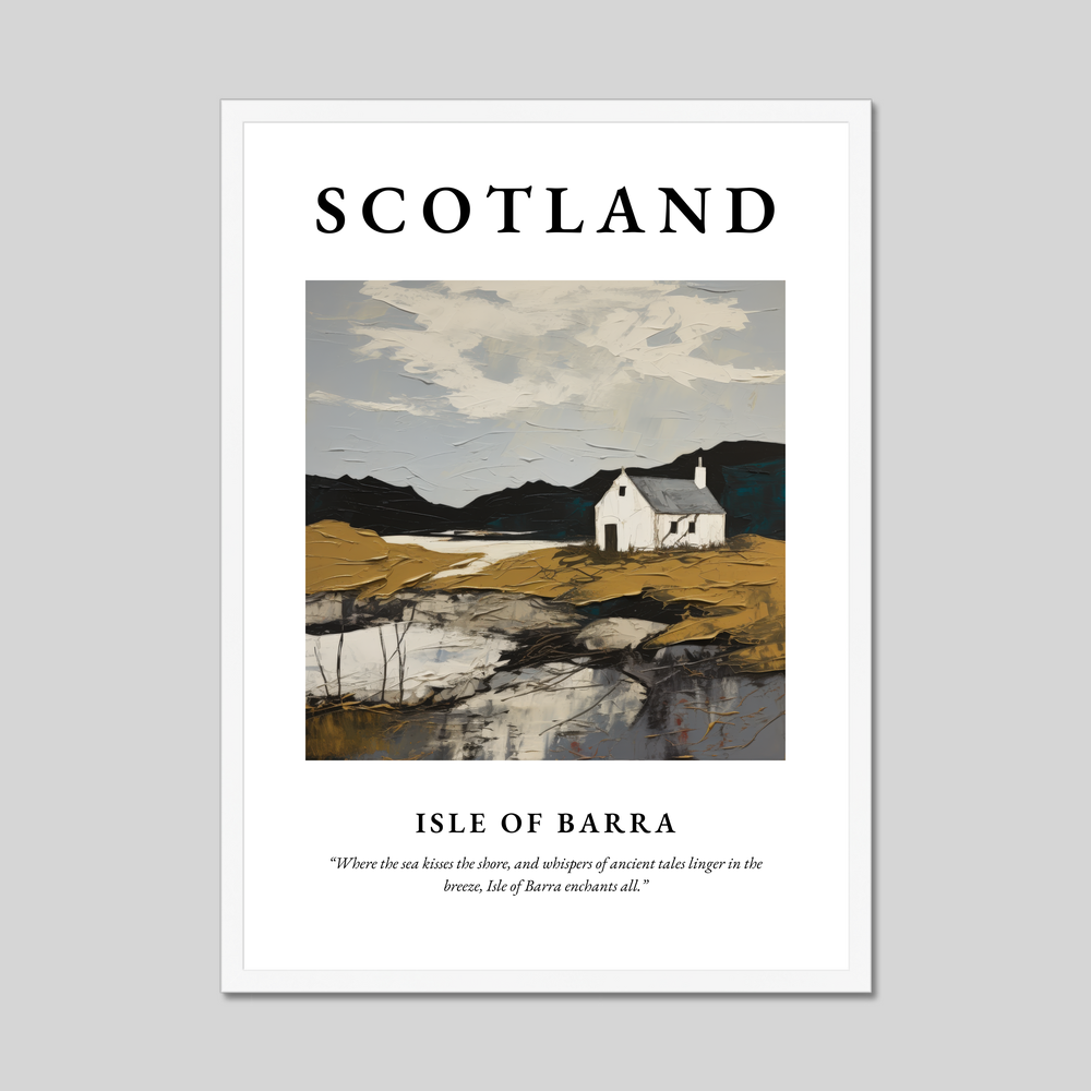 The bold "SCOTLAND" at the top sets the tone for a journey into the expressive tapestry that follows. The painting, crafted in a mesmerising Expressionism style, captures the essence of Isle of Barra's rugged beauty. With bold brushstrokes and dynamic contrasts, the artwork invites you into a landscape where vibrant earth tones meet the soft whisper of the sky. Below the painting, the evocative quote, “Where the sea kisses the shore, and whispers of ancient tales linger in the breeze, Isle of Barra enchants all,” further encapsulates the spirit of this magical place.