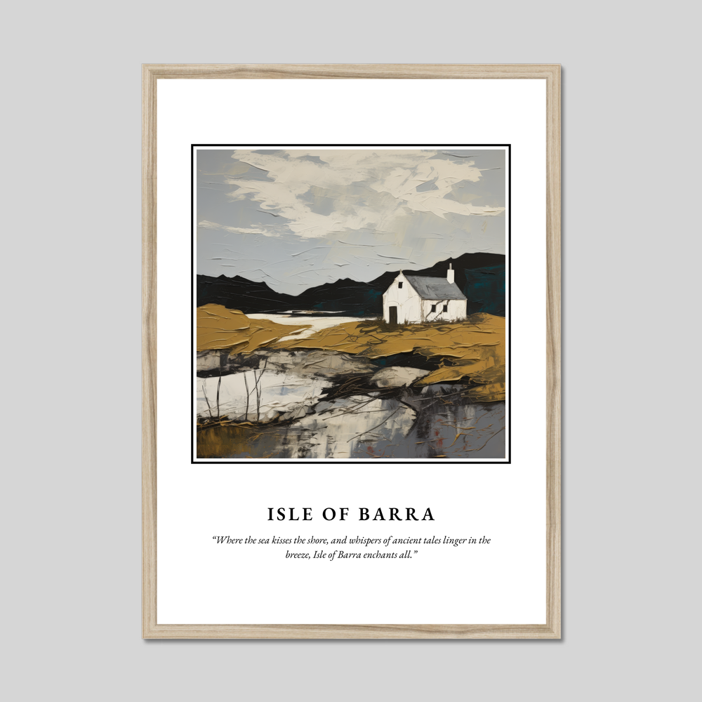 Embrace the enchanting allure of the Scottish Isles with our breathtaking framed poster print, a tribute to the captivating Isle of Barra. Measuring a striking 50cm x 70cm, this poster makes a statement on any wall without the need to break the bank. Choose from sleek black, crisp white, or a warm natural wood-effect frame to perfectly complement your decor.