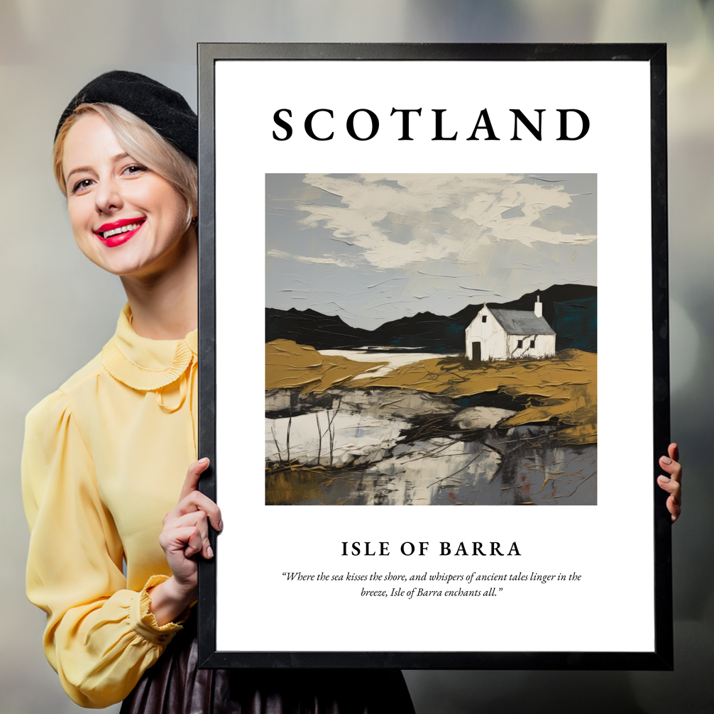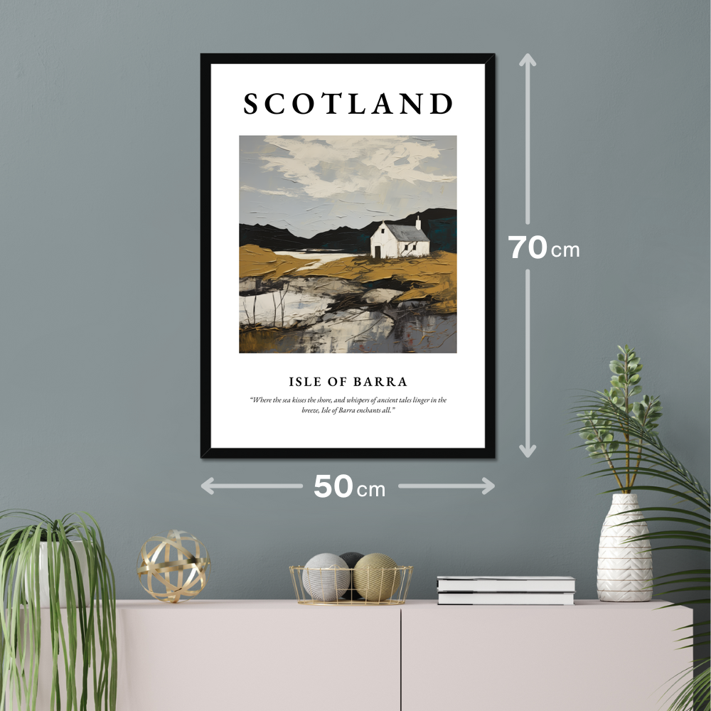 Ideal for those who hold a fondness for Scotland, have visited its shores, or simply appreciate striking art, this poster serves as a daily reminder of the tranquillity and beauty found on the Isle of Barra. Its generous size allows it to cover a large wall area, making it an impressive addition to any room.