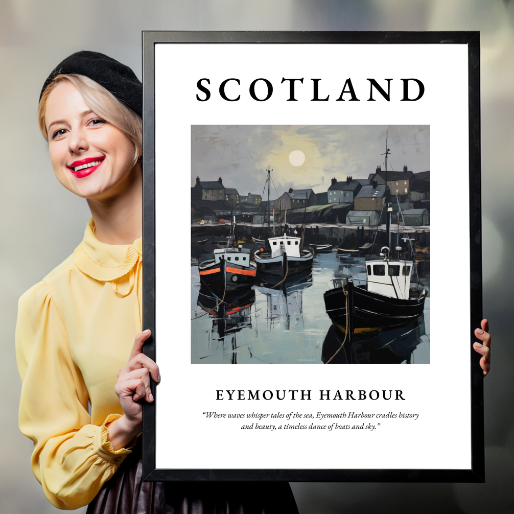 At the top, the word "SCOTLAND" stands out in bold, inviting letters, setting the stage for the expressive artwork beneath. The painting, executed in an evocative Expressionism style, showcases Eyemouth Harbour in all its dramatic splendour. With its dynamic brushstrokes and rich palette, the scene breathes life into the bustling harbour, where sturdy boats rest gracefully upon serene waters under a softly lit sky. Below this captivating artwork, the quote, “Where waves whisper tales of the sea, Eyemouth Harbour cradles history and beauty, a timeless dance of boats and sky,” poetically encapsulates the essence of this extraordinary locale.
