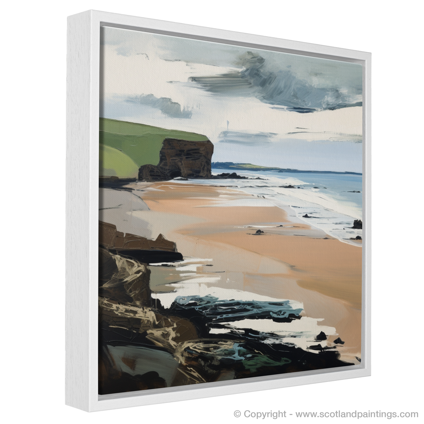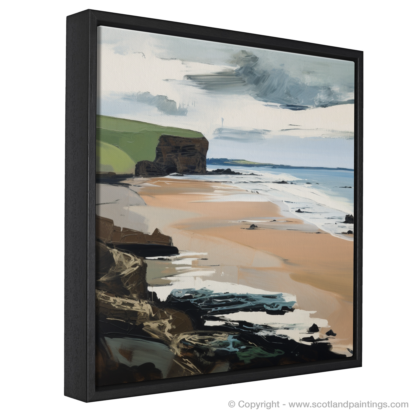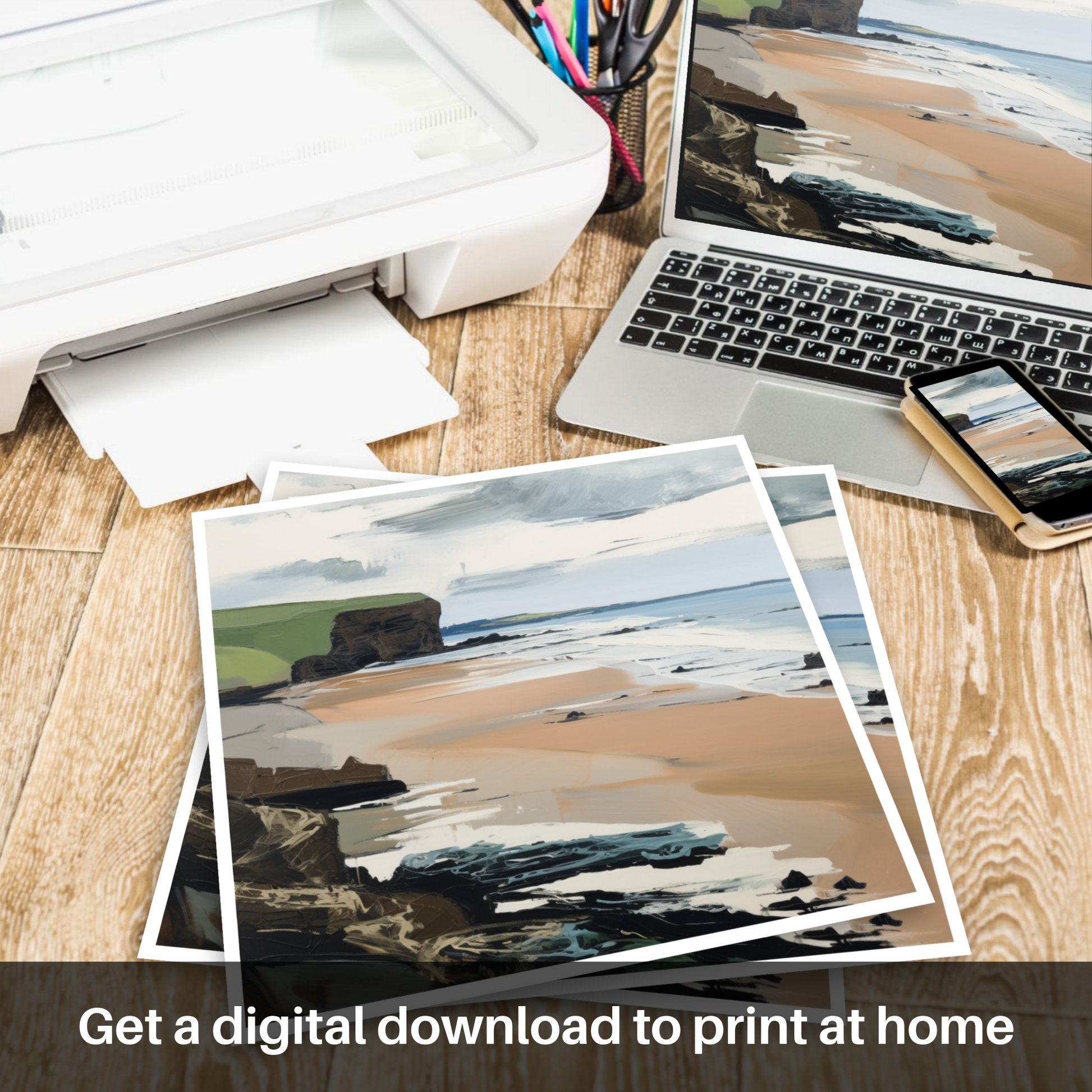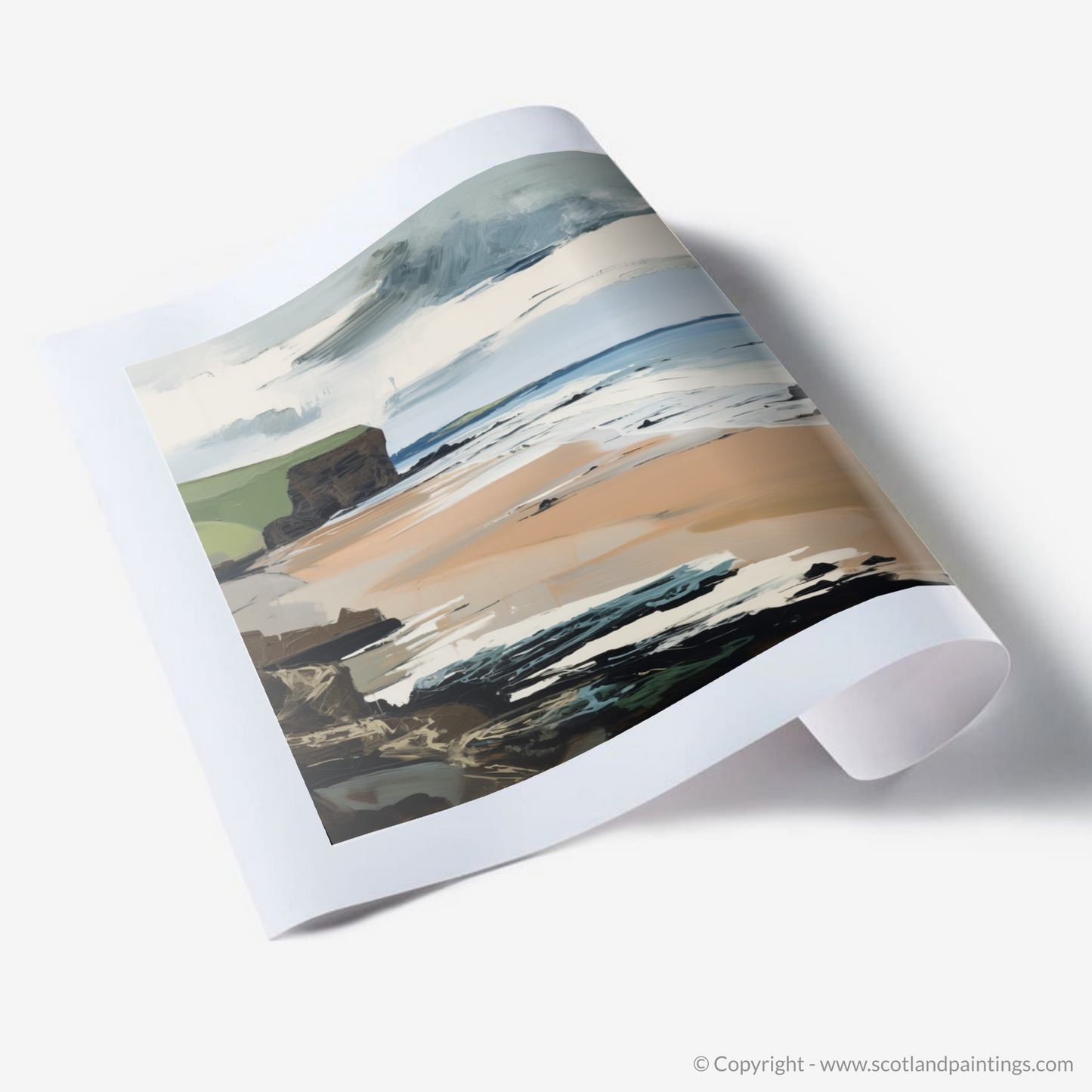 Capturing the raw beauty of Lunan Bay, Angus, this evocative expressionist print conjures the wild, untamed essence of Scotland's coastal summers. The artwork features an energetic panorama where land meets sea, rendered with bold strokes and a vibrant palette. Creamy sands, carved by the rushing tides, stretch into the distance, intersected by dramatic outcrops of dark, weathered rocks.