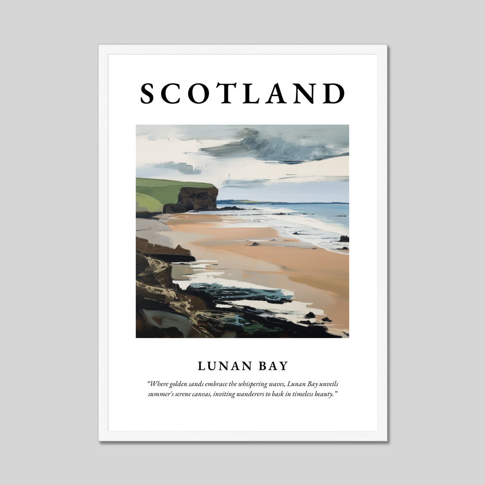 At the top, the bold declaration of “SCOTLAND” sets the tone, inviting art lovers and travel enthusiasts alike to indulge in this visual journey. The featured painting of Lunan Bay, executed in the expressive and emotive style of Expressionism, brings to life the serene and timeless beauty of this coastal gem. Beneath the artwork, the quote “Where golden sands embrace the whispering waves, Lunan Bay unveils summer's serene canvas, inviting wanderers to bask in timeless beauty” perfectly captures the essence of the scene, making it a cherished addition for anyone with fond memories of the bay or a love for evocative artwork.