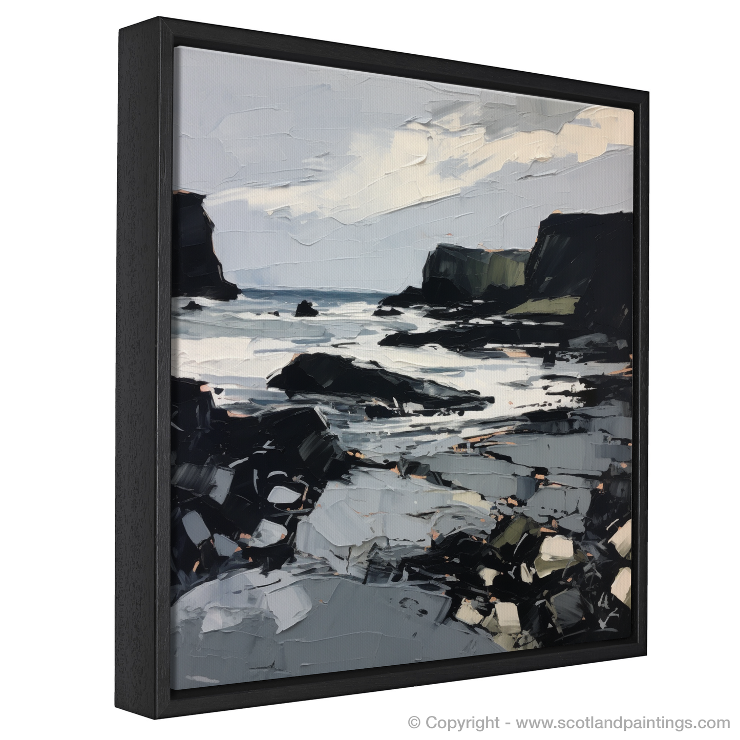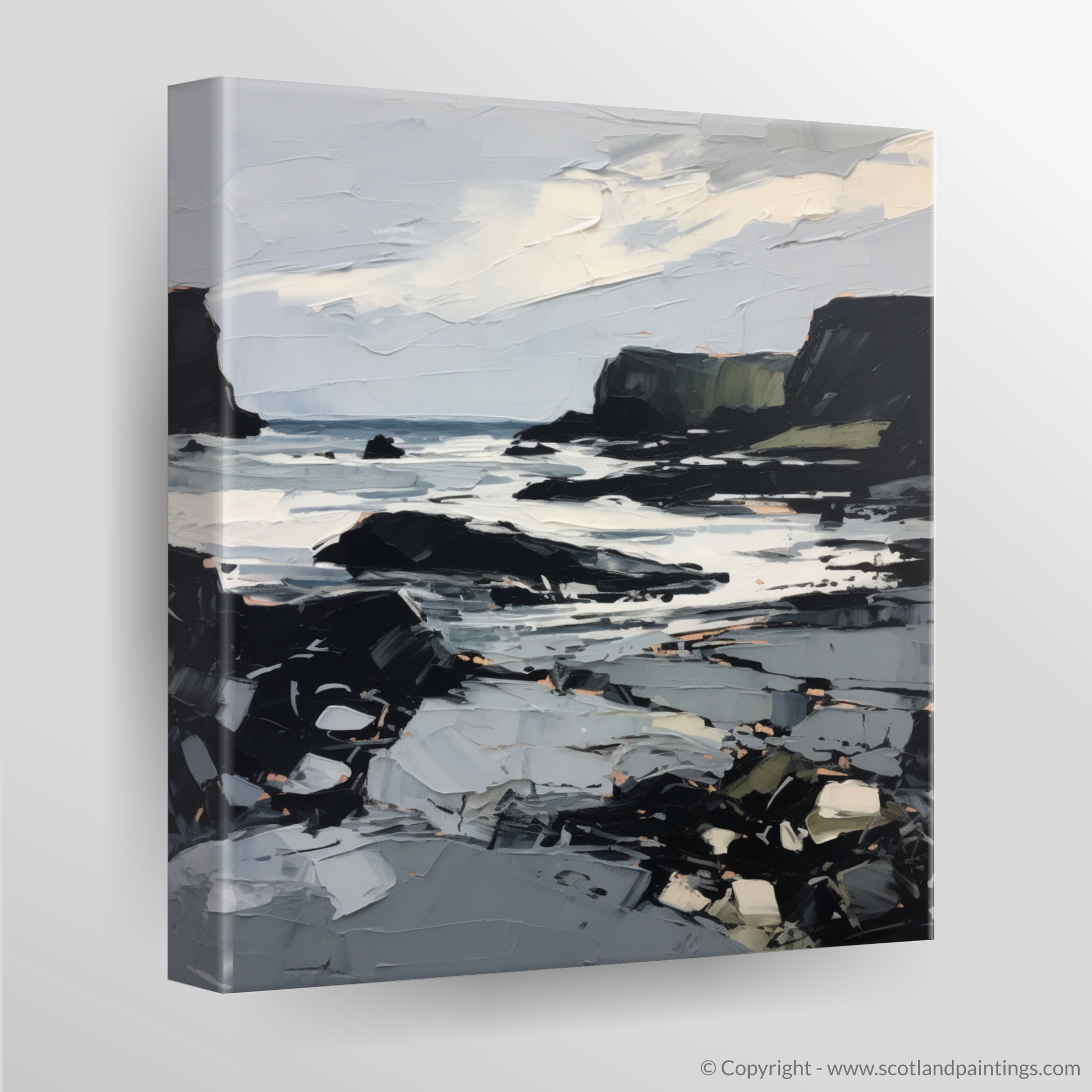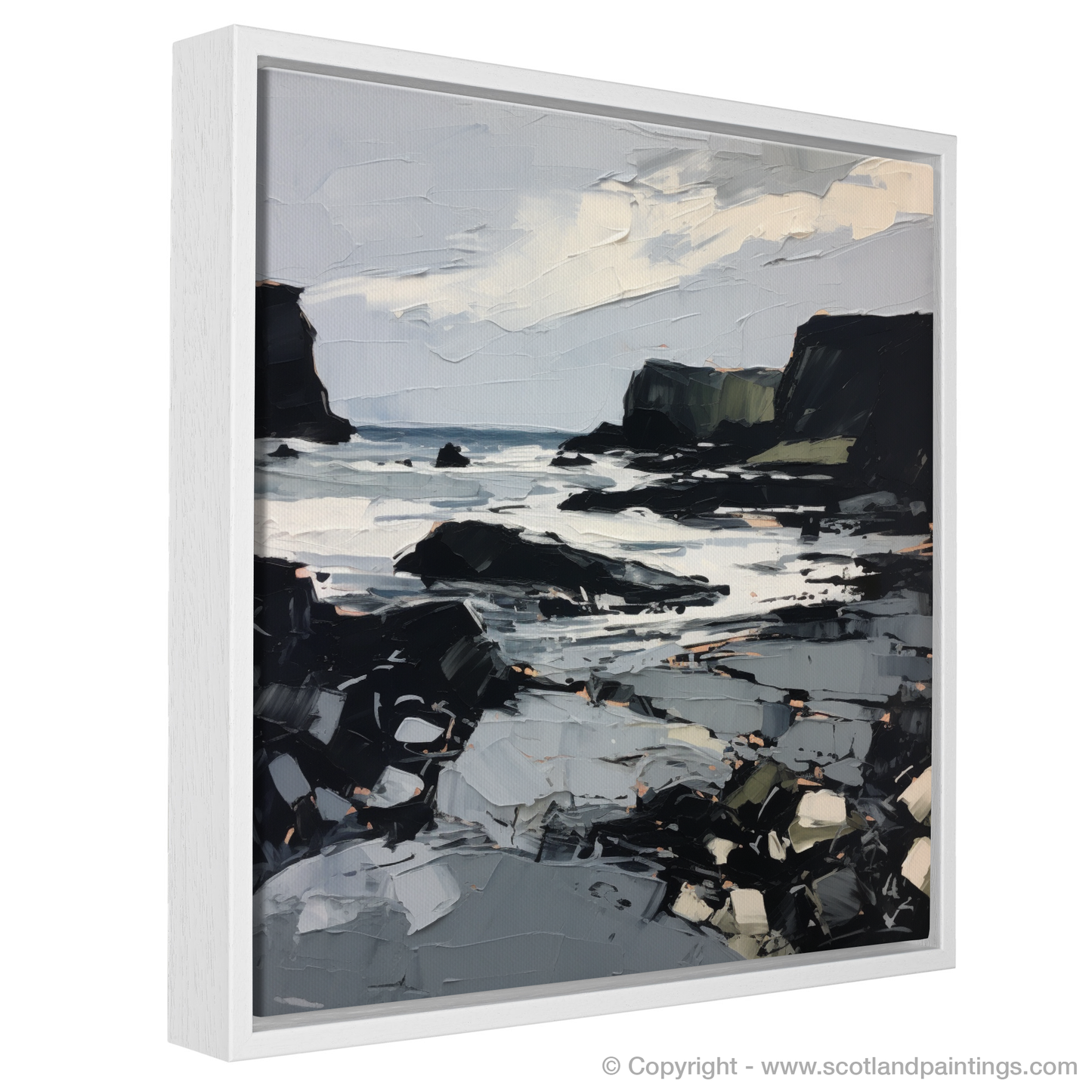 The artwork is characterised by dynamic and bold brushstrokes, suggesting the movement of the waves and the ever-changing skies. The palette is a stunning interplay of contrasting tones—whites and greys dominate the scene, suggesting the shimmering light on the water's surface, while the cliffs are etched out in dramatic blacks, greens, and browns, grounding the composition with a sense of weight and permanence.