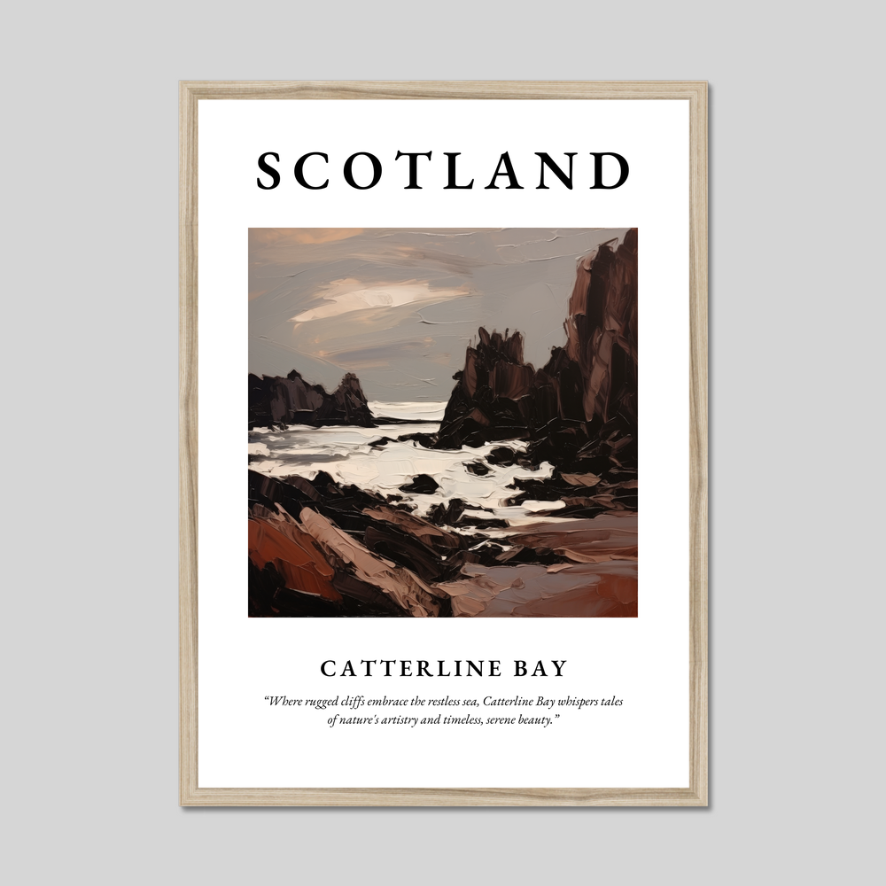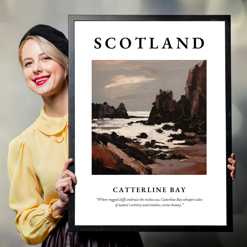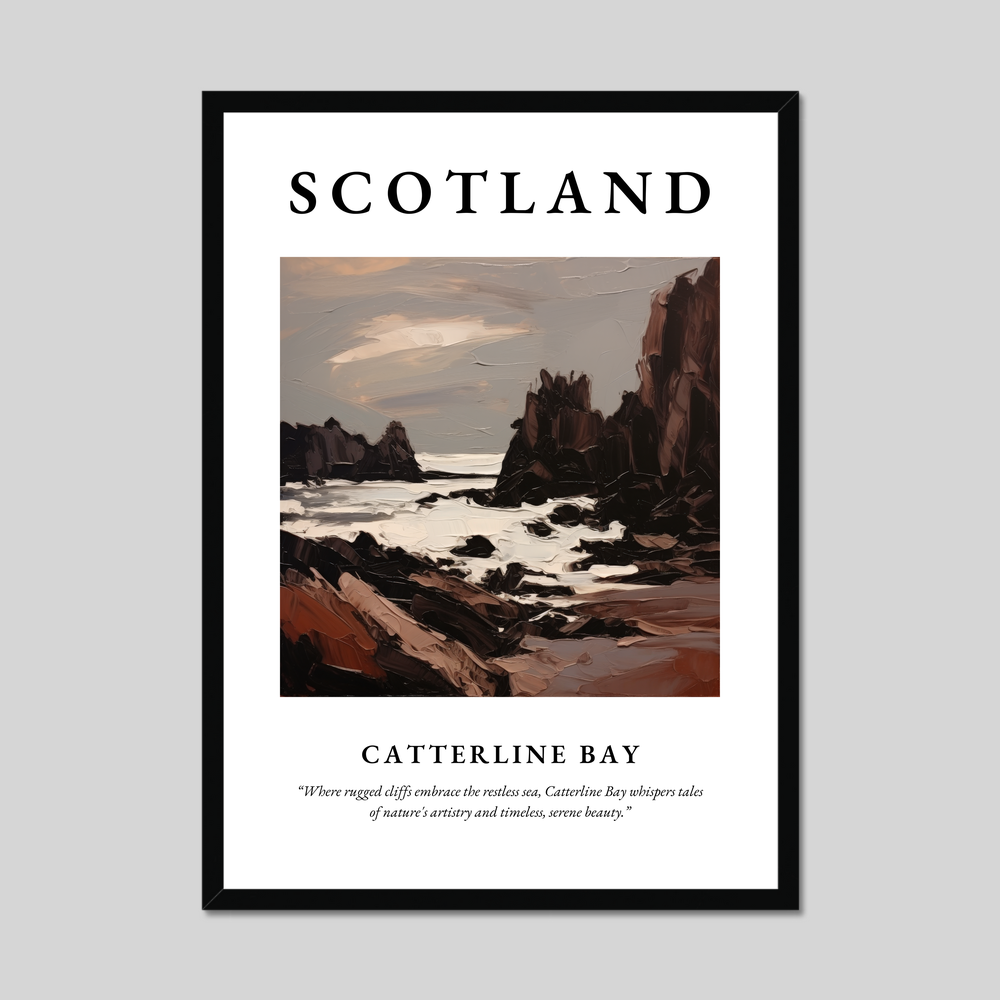 Invite the allure of Scotland into your home with our striking framed poster print of Catterline Bay. Measuring an impressive 50cm x 70cm, this eye-catching piece features the word "SCOTLAND" in bold letters above an expressive portrayal of this breathtaking bay. Available in black, white, or a sophisticated natural wood-effect frame, it seamlessly fits any décor style—ideal for those who cherish the charm of Scottish landscapes or the emotive strokes of Expressionism.