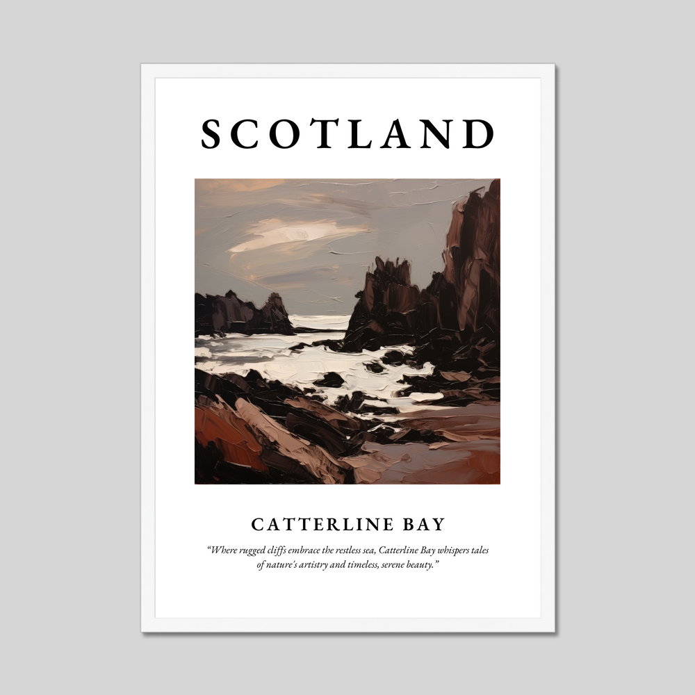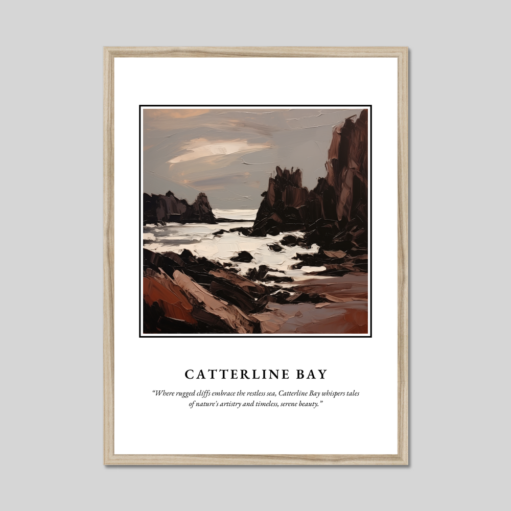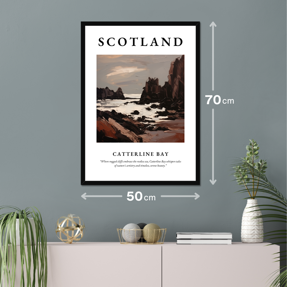 Beneath the vivid painting, a tribute to Catterline Bay reads: "Where rugged cliffs embrace the restless sea, Catterline Bay whispers tales of nature's artistry and timeless, serene beauty.” This large yet affordable print transforms your space, offering a window into the captivating Scottish coastline without breaking the bank.