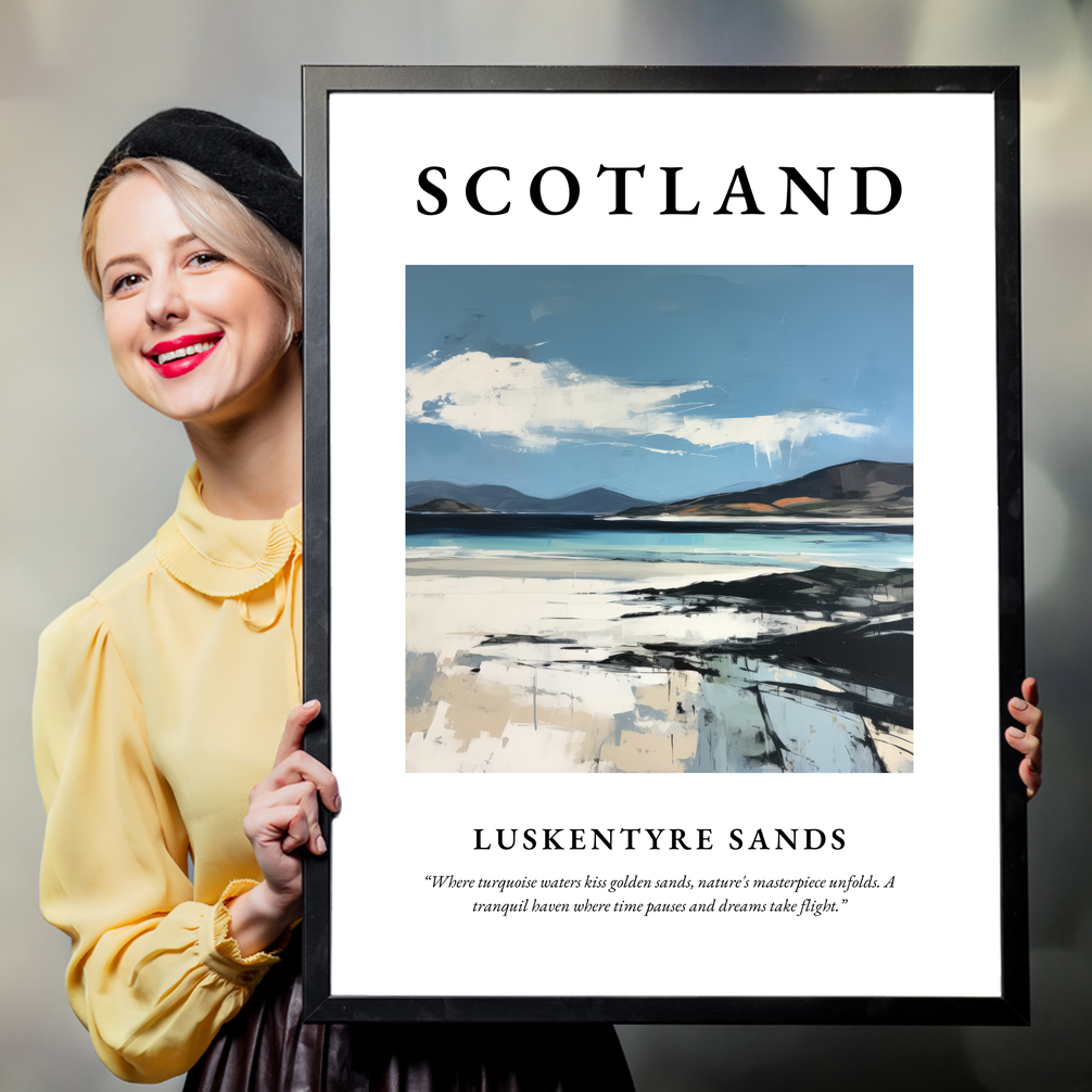 The poster features the word “SCOTLAND” in bold, commanding lettering at the top, instantly drawing attention and setting the scene for what lies beneath. Below, an exquisite Expressionist painting of Luskentyre Sands captures the viewer's imagination. In this vibrant piece, bold brushstrokes and a rich palette evoke the untamed essence of one of Scotland's most picturesque beaches. Turquoise waters blend seamlessly with golden sands, framed against a backdrop of distant hills, inviting you to lose yourself in its tranquil beauty.